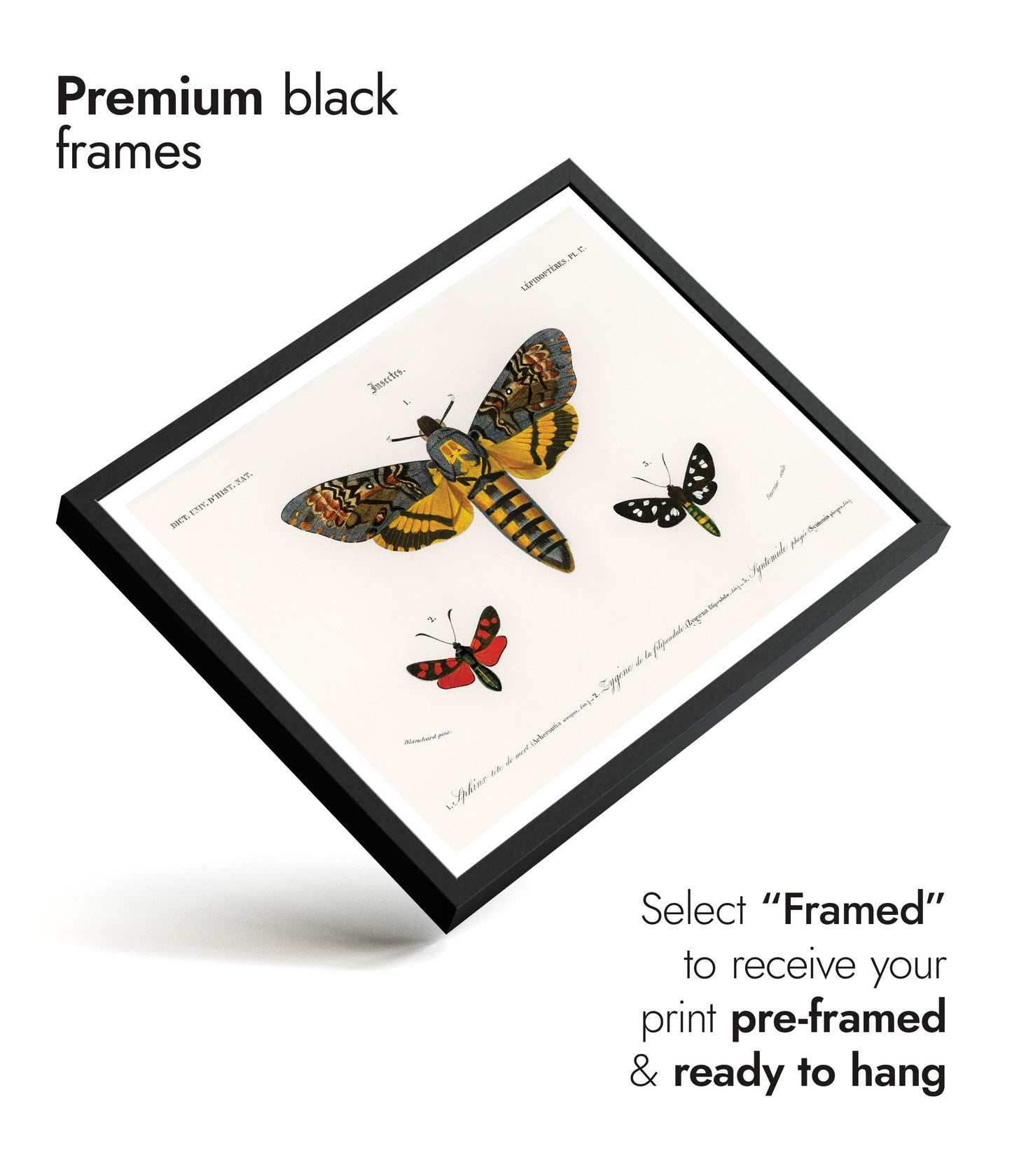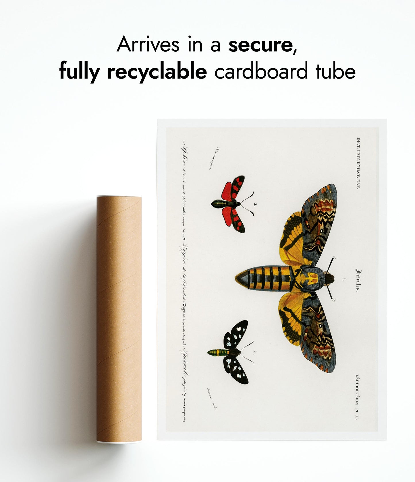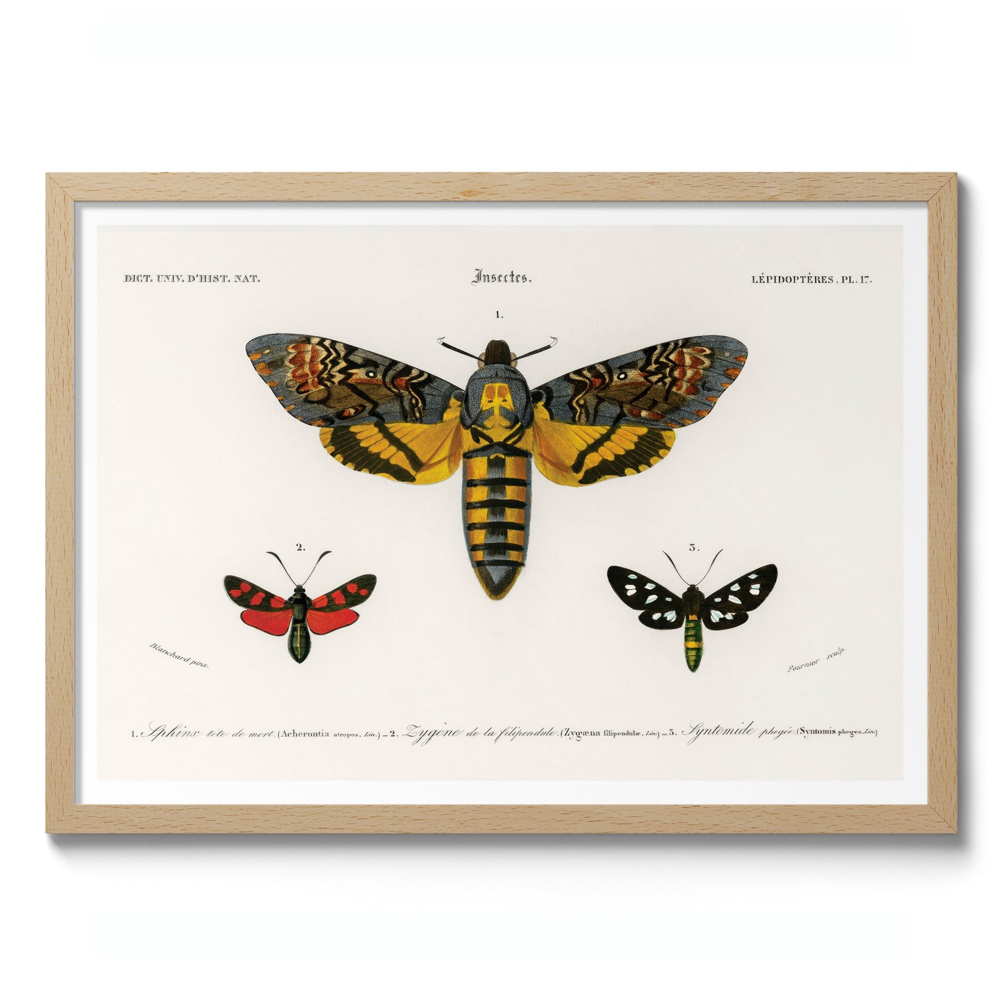 This vintage "Collection of Moths" poster by Charles D'Orbigny showcases three intricately detailed moth illustrations. The central moth, with its vivid patterns, is surrounded by two smaller moths, highlighting the diversity within the species. The classic typography and scientific notation add an educational touch, making it perfect for nature and zoology enthusiasts. Ideal for adding a historical and artistic flair to any space.