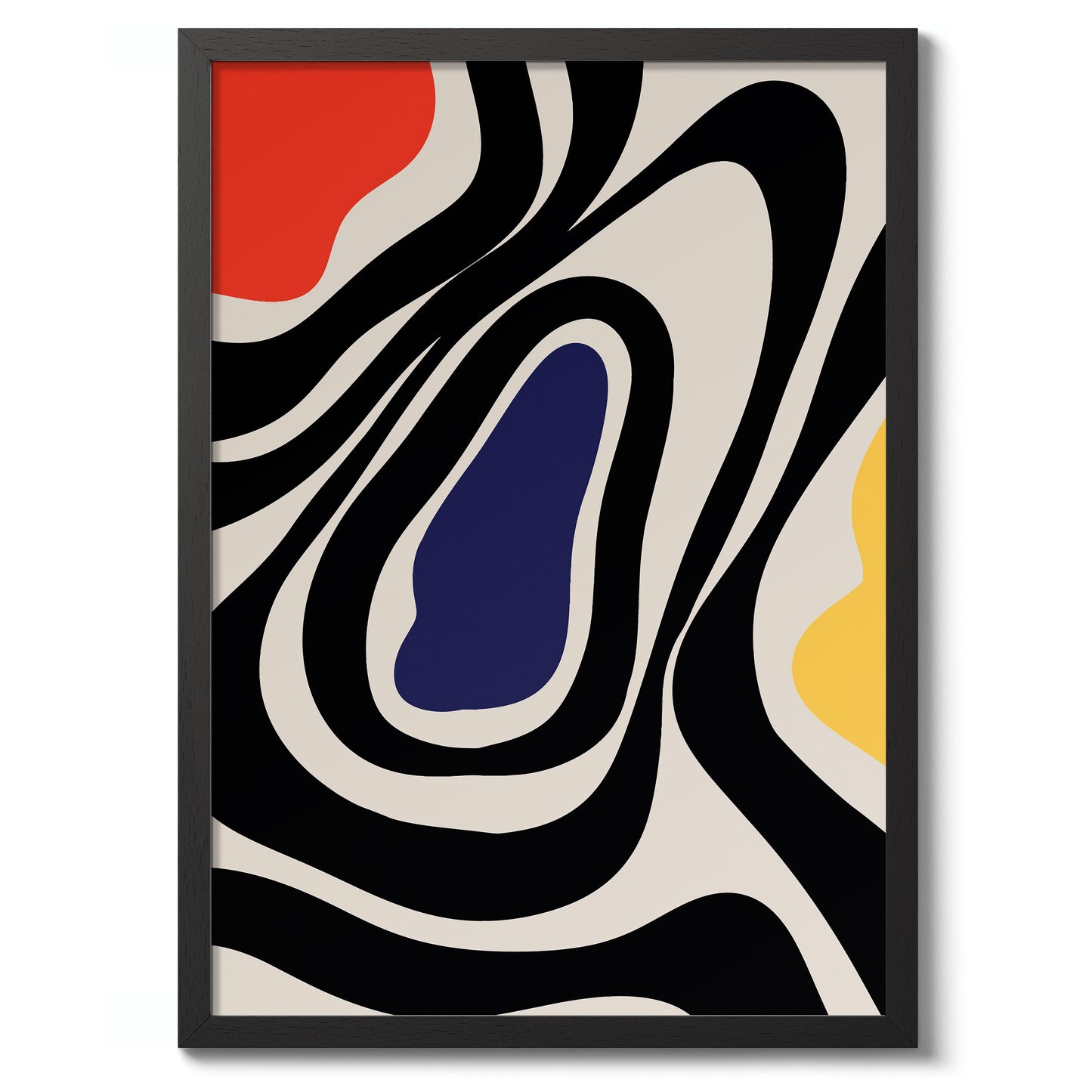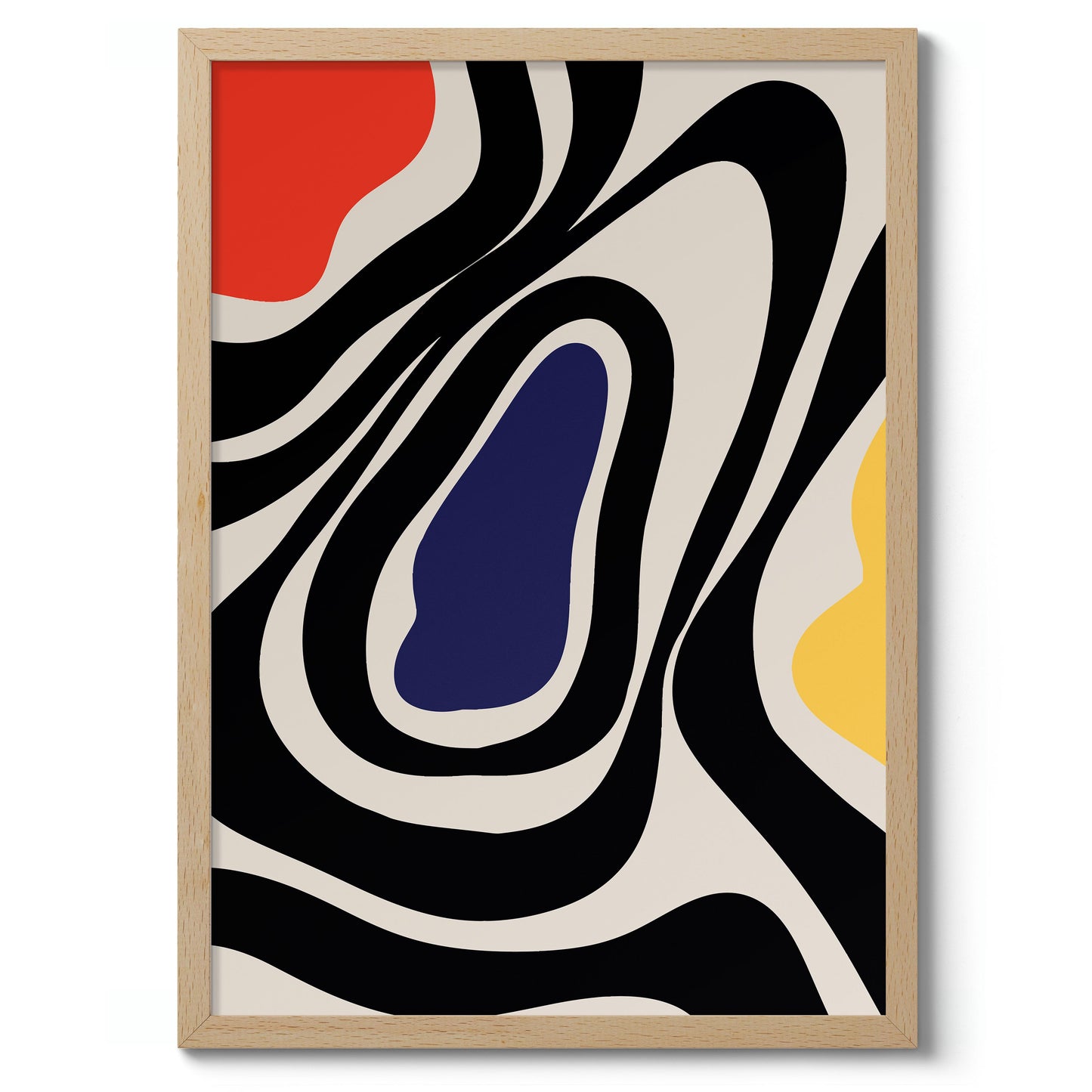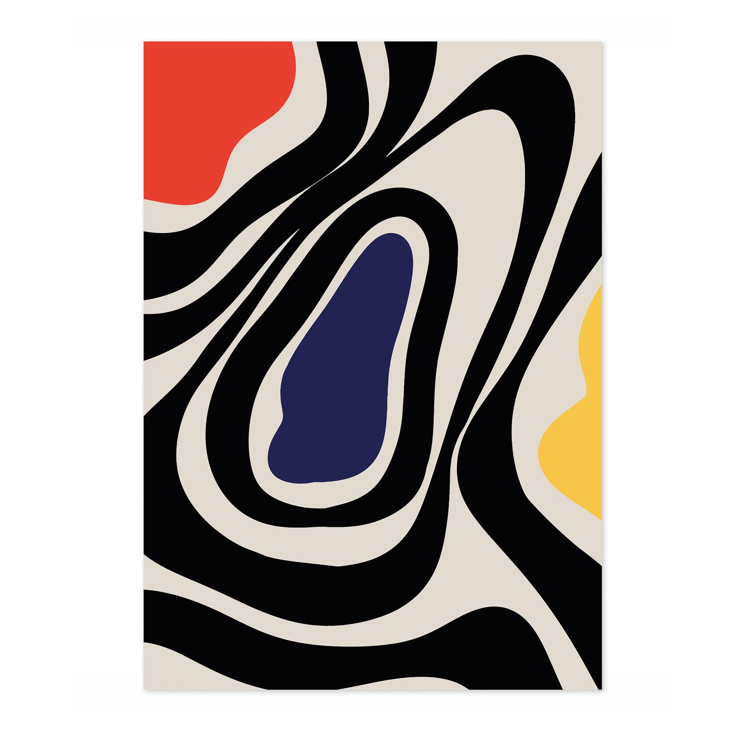 "Colour within Loops" poster features a striking abstract design with bold, undulating black lines creating loops that enclose vibrant red, blue, and yellow shapes. This graphic portrait poster, ideal for modern and contemporary decor, captures the essence of abstract art, emphasizing geometric forms and vivid colour contrasts to create a dynamic visual experience.