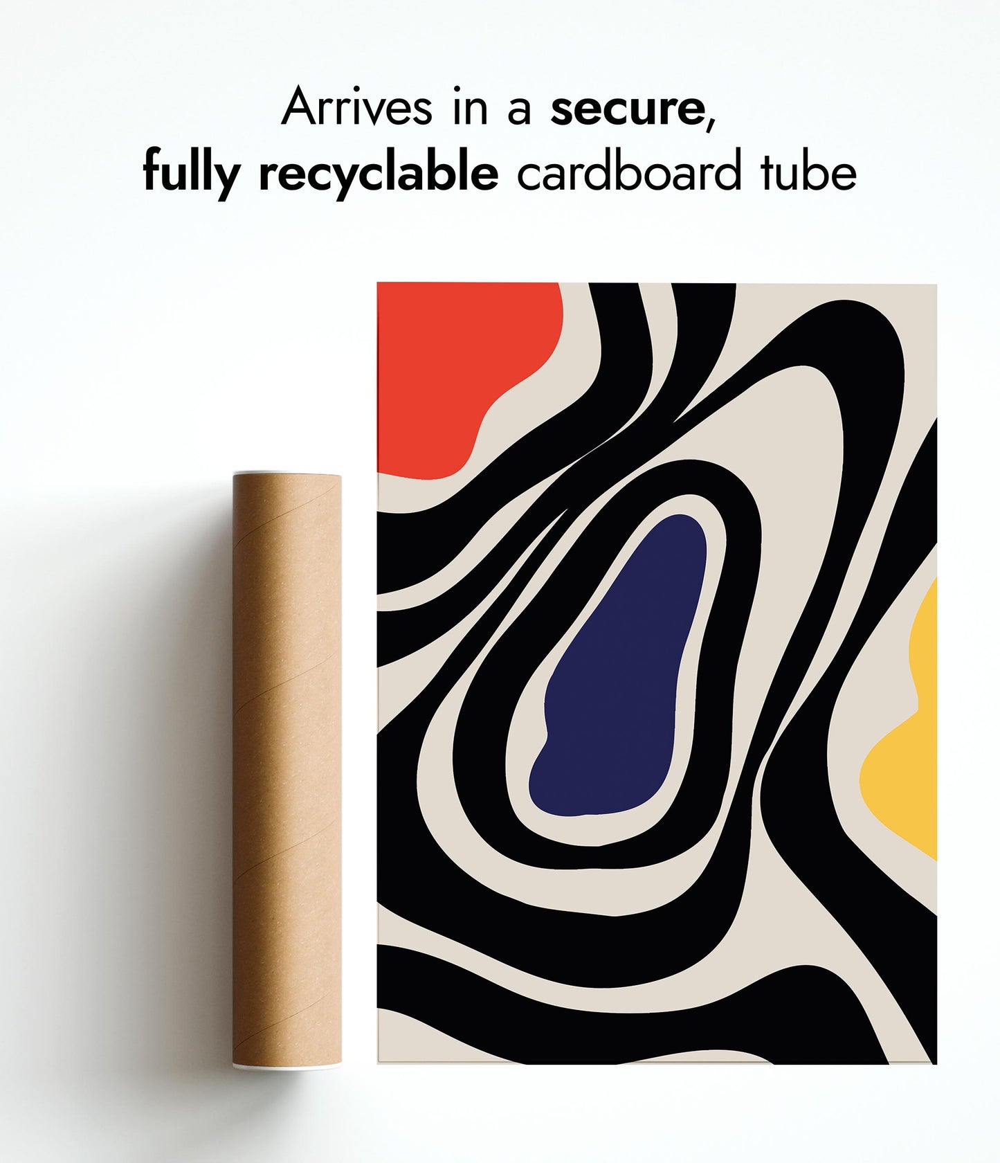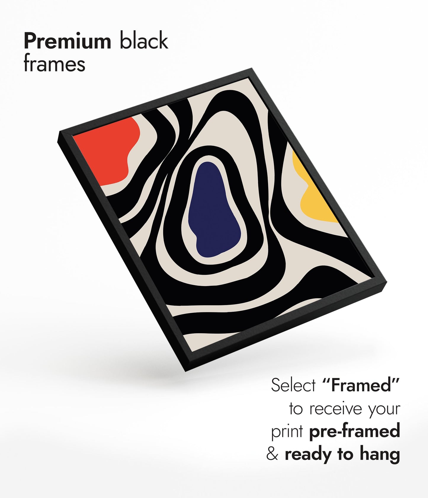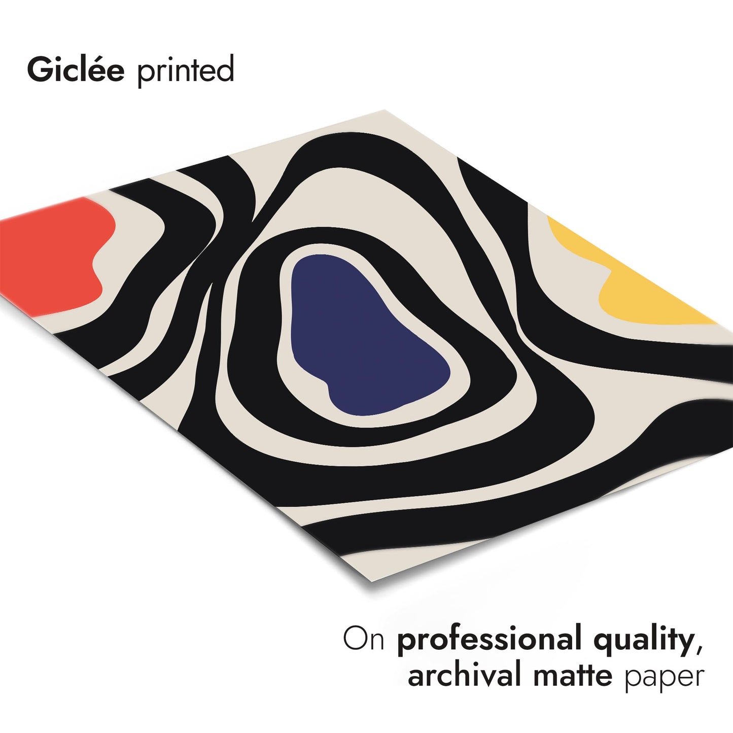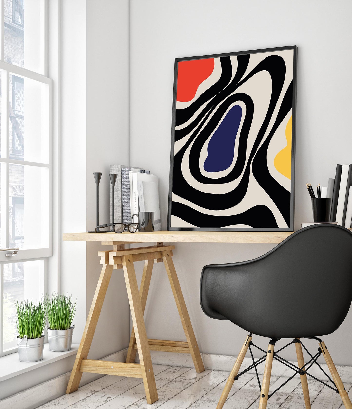 "Colour within Loops" poster features a striking abstract design with bold, undulating black lines creating loops that enclose vibrant red, blue, and yellow shapes. This graphic portrait poster, ideal for modern and contemporary decor, captures the essence of abstract art, emphasizing geometric forms and vivid colour contrasts to create a dynamic visual experience.