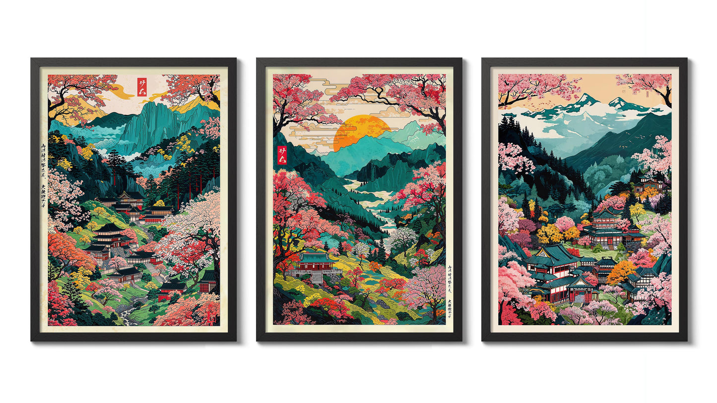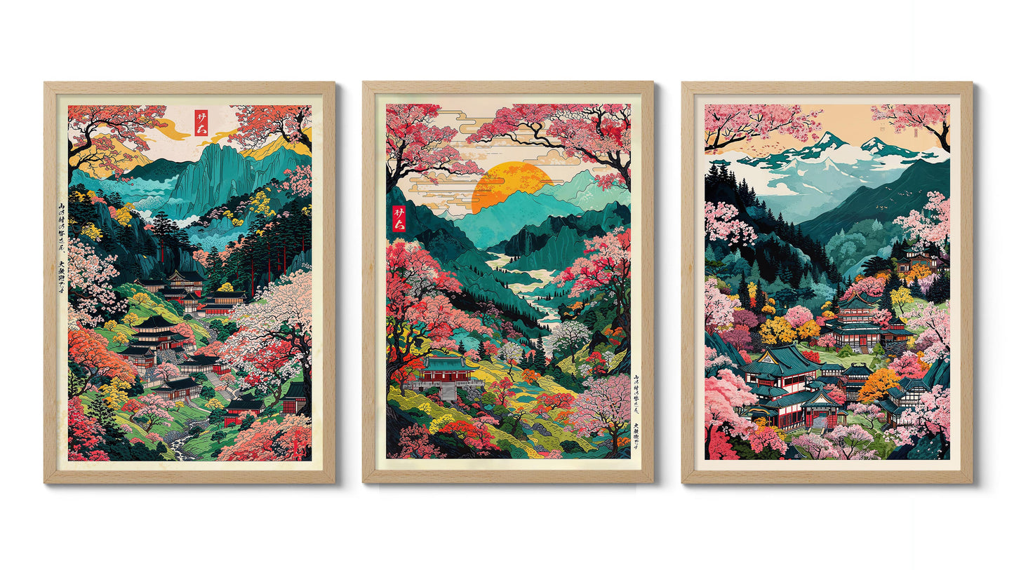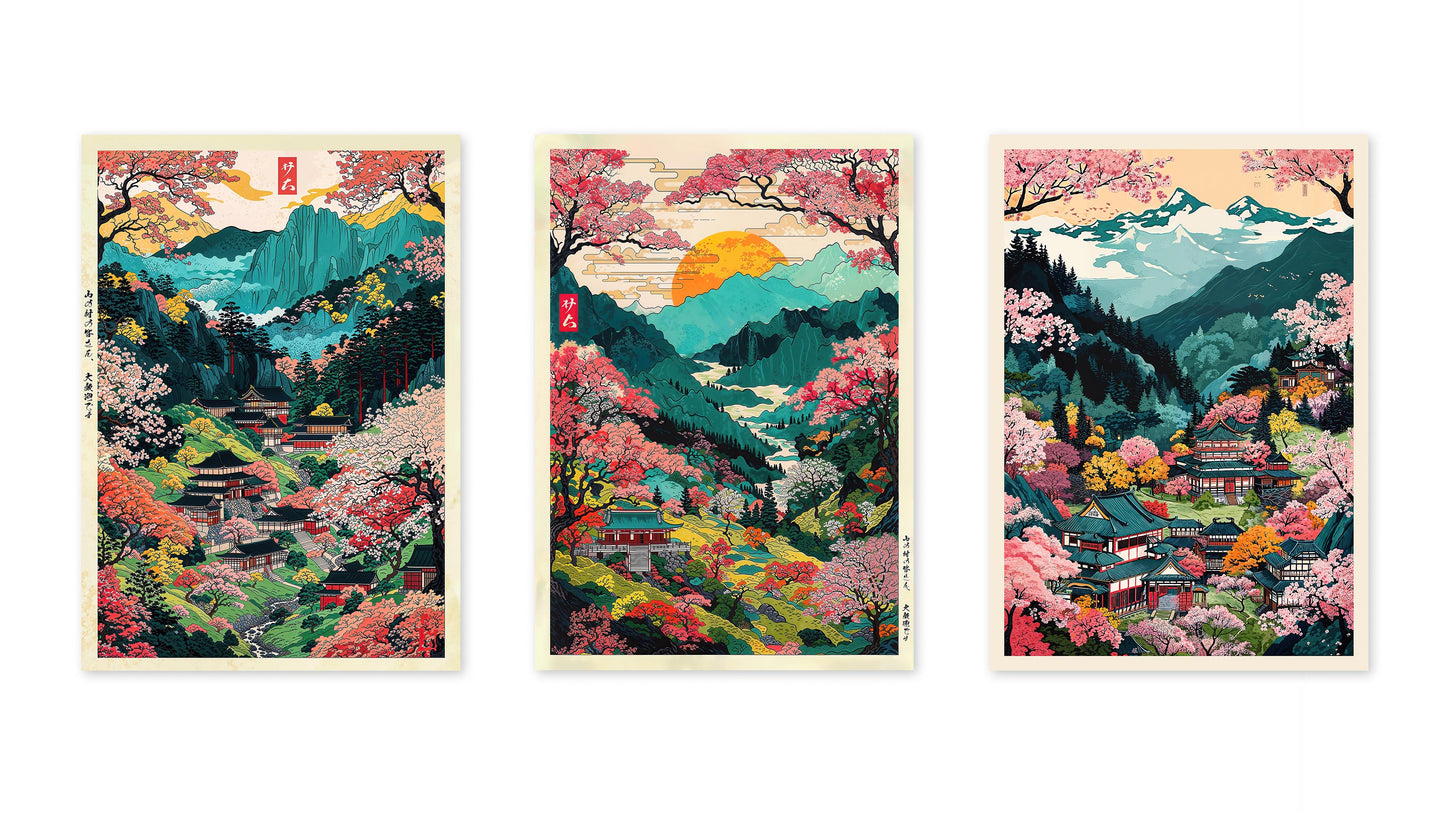 The "Colourful Mount Yoshino" anime poster set features stunning woodblock style illustrations of Japan's iconic mountain landscapes. Vibrant pink cherry blossoms contrast against serene blue valleys, capturing the essence of traditional Japanese scenery. Each poster showcases intricate temples nestled amidst lush floral valleys, embodying a serene, picturesque viewpoint of Japan's natural beauty. Perfectly suited for lovers of graphic illustration and Japanese themes.