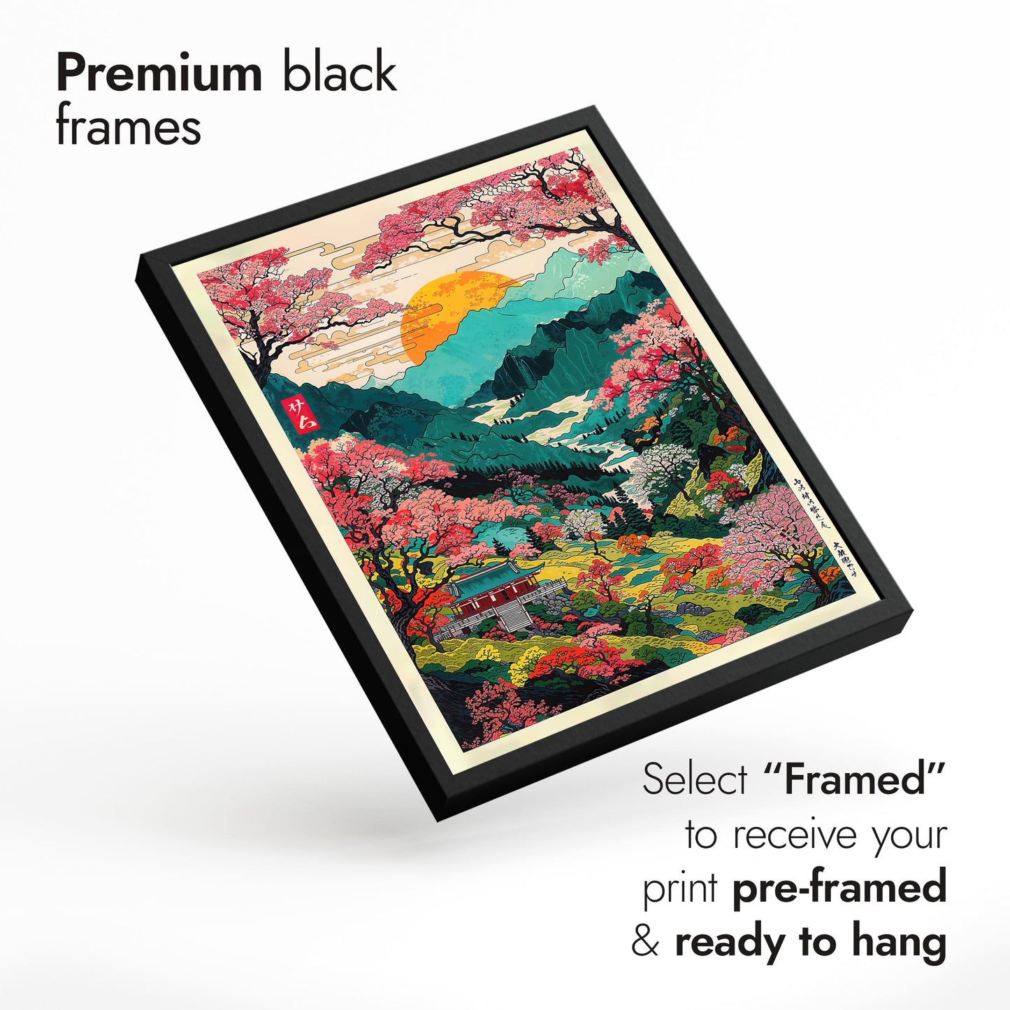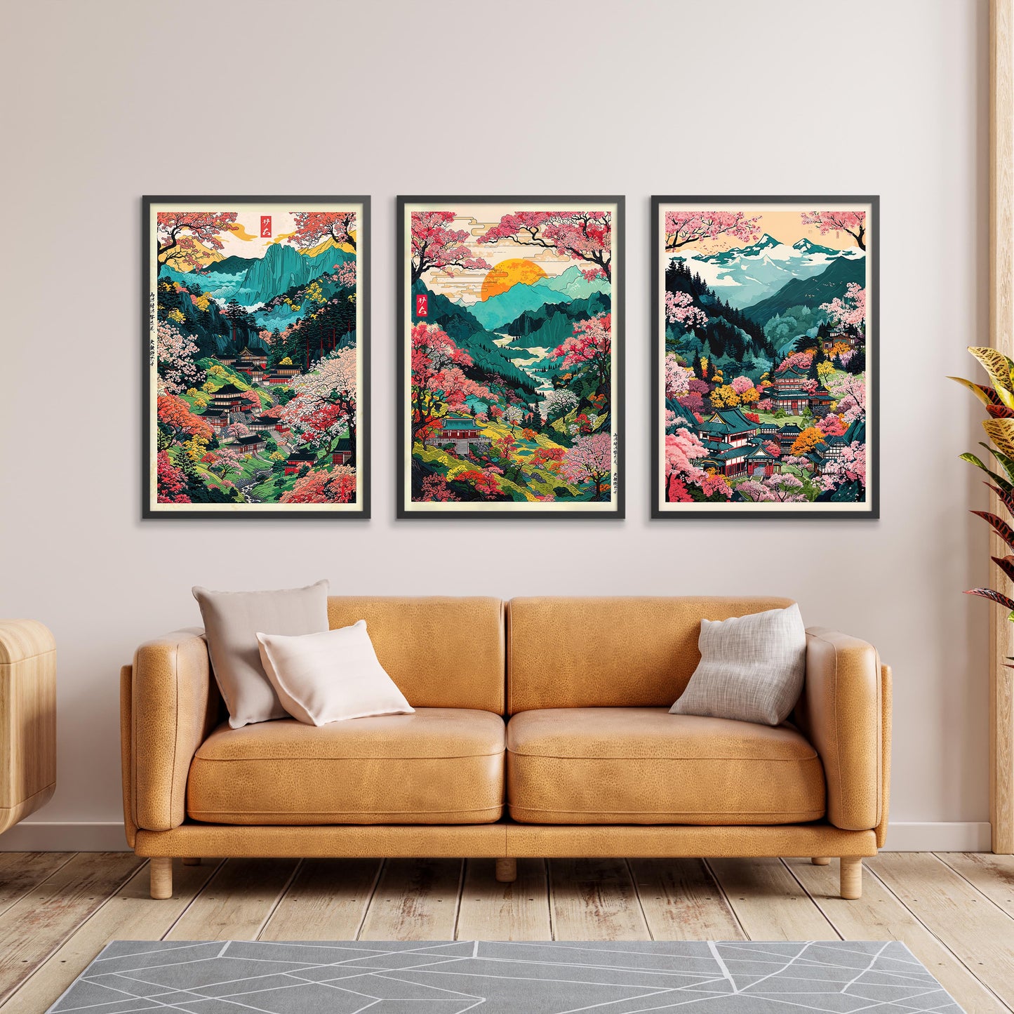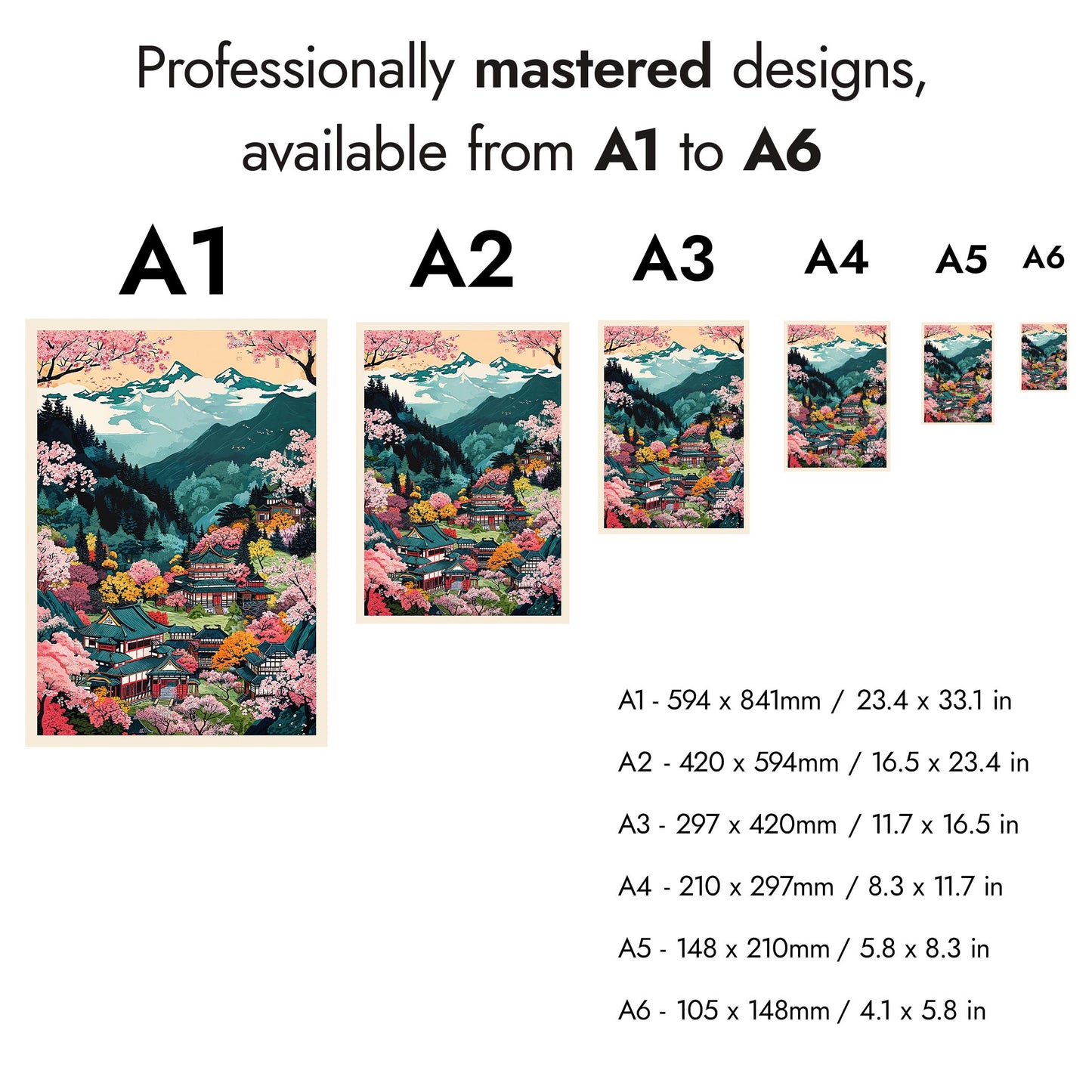 The "Colourful Mount Yoshino" anime poster set features stunning woodblock style illustrations of Japan's iconic mountain landscapes. Vibrant pink cherry blossoms contrast against serene blue valleys, capturing the essence of traditional Japanese scenery. Each poster showcases intricate temples nestled amidst lush floral valleys, embodying a serene, picturesque viewpoint of Japan's natural beauty. Perfectly suited for lovers of graphic illustration and Japanese themes.