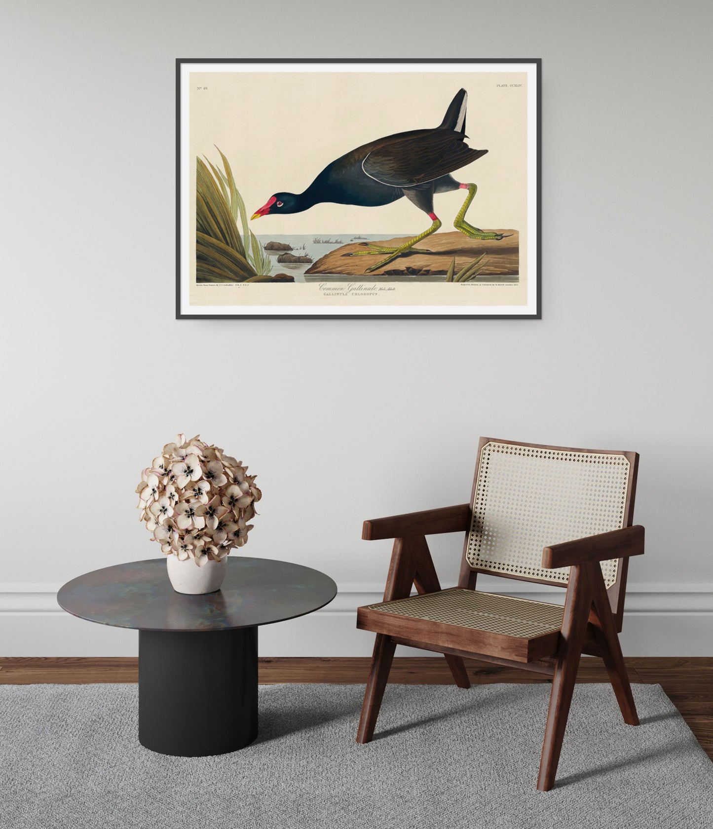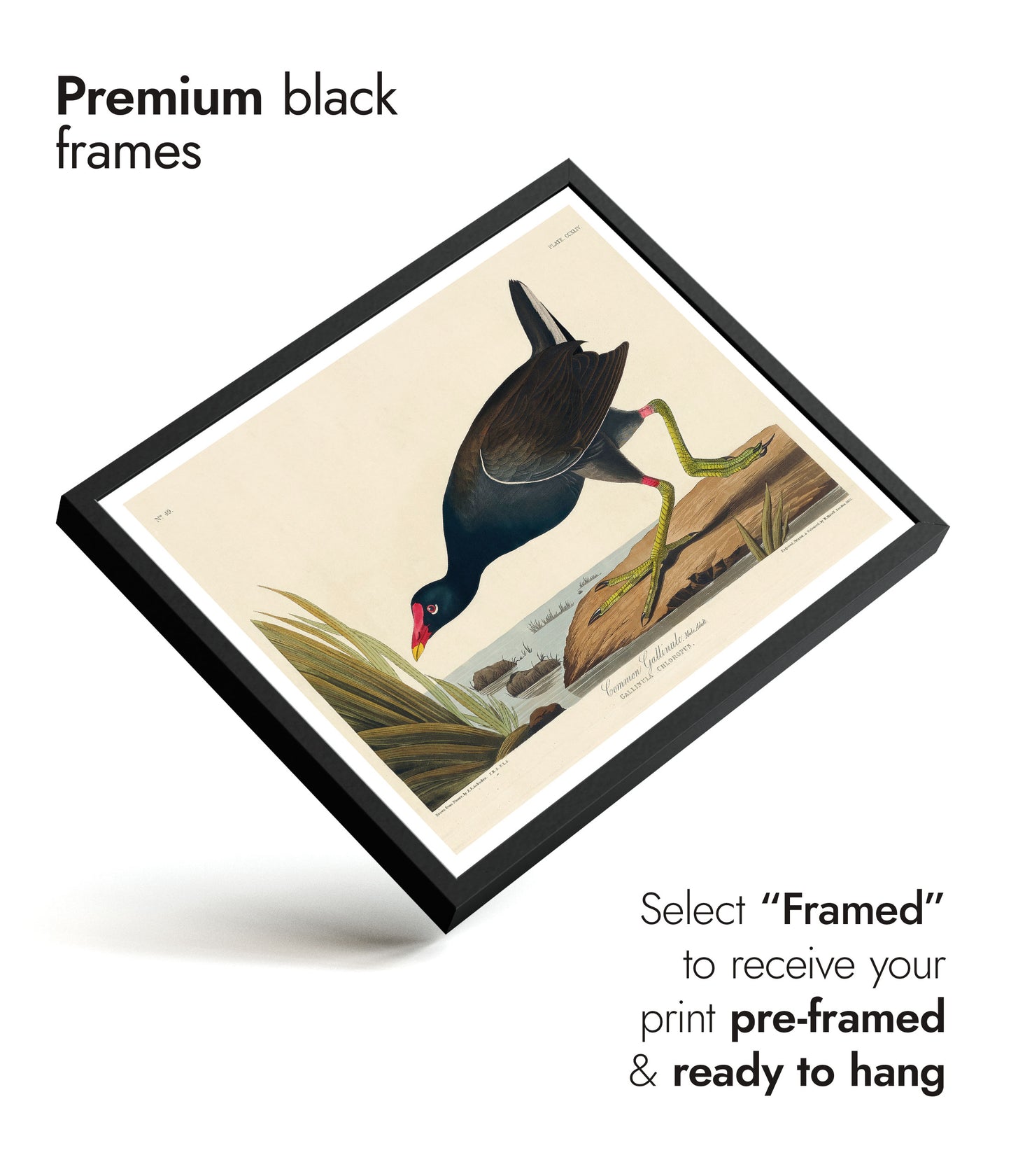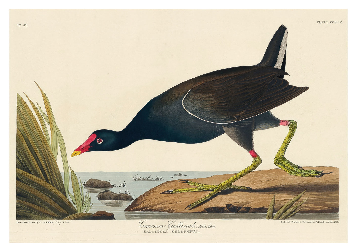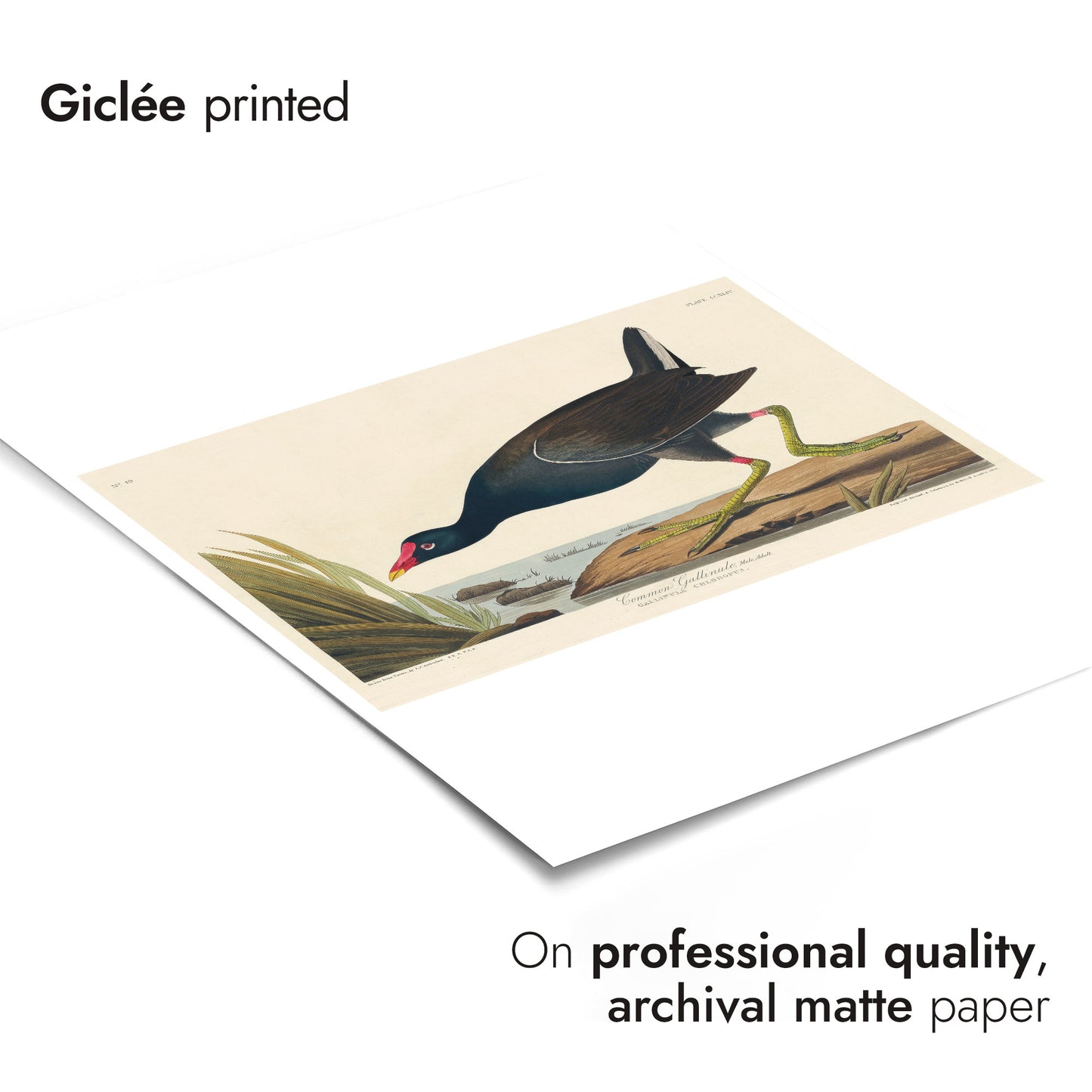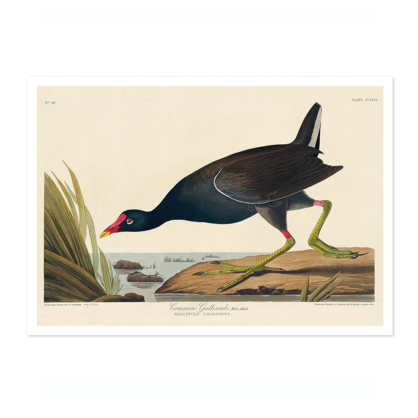 This vintage "Common Gallinule" poster by renowned artist John James Audubon captures a lifelike illustration of the bird in its natural habitat. Featuring detailed plumage and distinctive green legs, the bird is set against a tranquil riverbank scene with lush grasses. Perfect for nature and bird enthusiasts, this artwork blends scientific precision with artistic beauty. Ideal for adding a touch of vintage charm to any space.