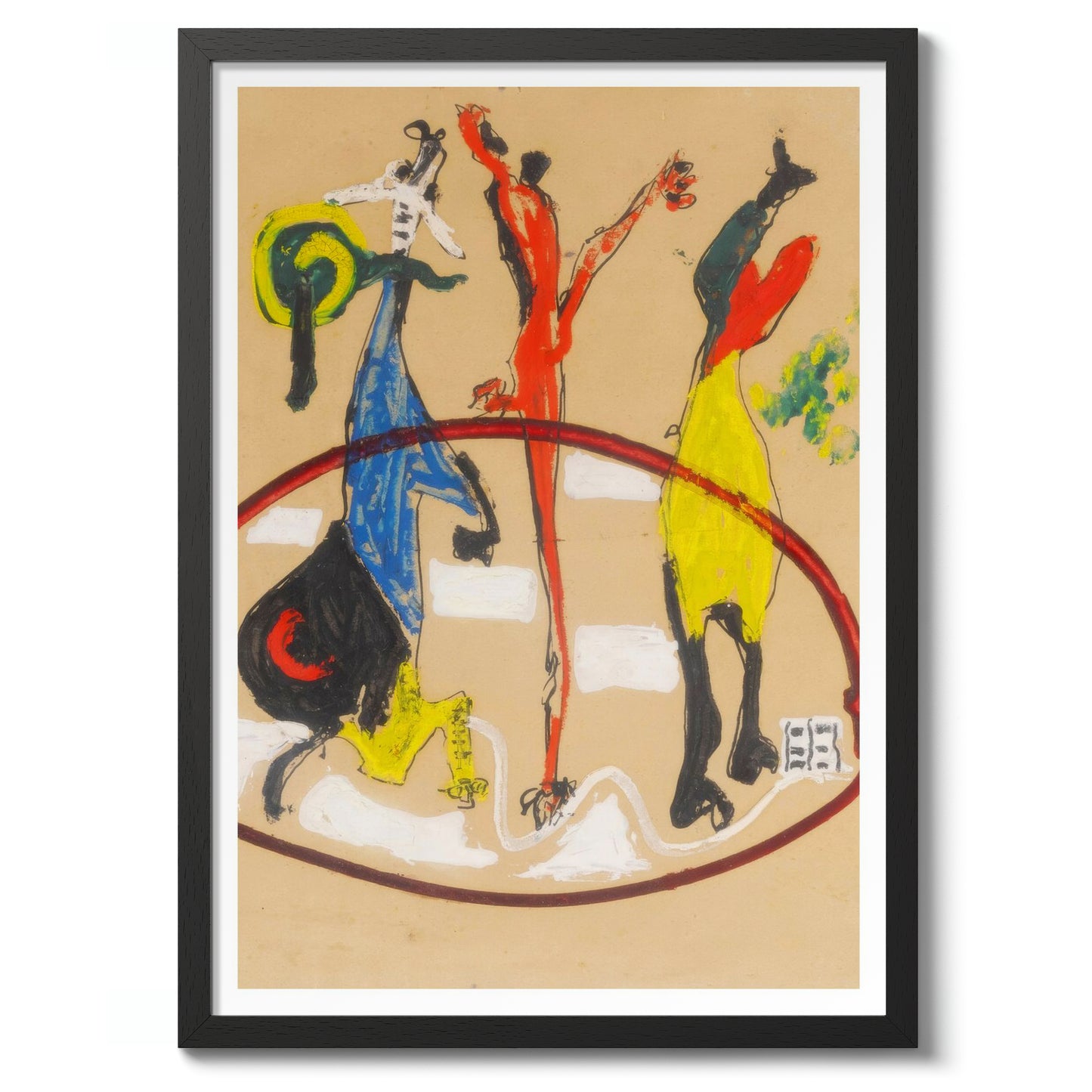 This abstract expressionist poster by Jackson Pollock, created in 1943, showcases his distinctive style of splatter and drip painting. Featuring vivid reds, blues, and yellows entwined within bold black outlines, the composition captures dynamic movement and chaos. Ideal for lovers of modern art, this piece embodies Pollock's innovative approach, making it a captivating addition to any space.
