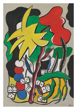 Fernand Léger's "Composition with Dominoes" poster showcases a vibrant Cubist still life. Dominated by a striking yellow palm leaf and a red abstract form, the composition integrates playful domino elements scattered among colourful spheres and organic shapes. This intricate, dynamic artwork blends geometric forms with vivid hues, making it a captivating addition to any space. Ideal for fans of modernist and abstract designs.