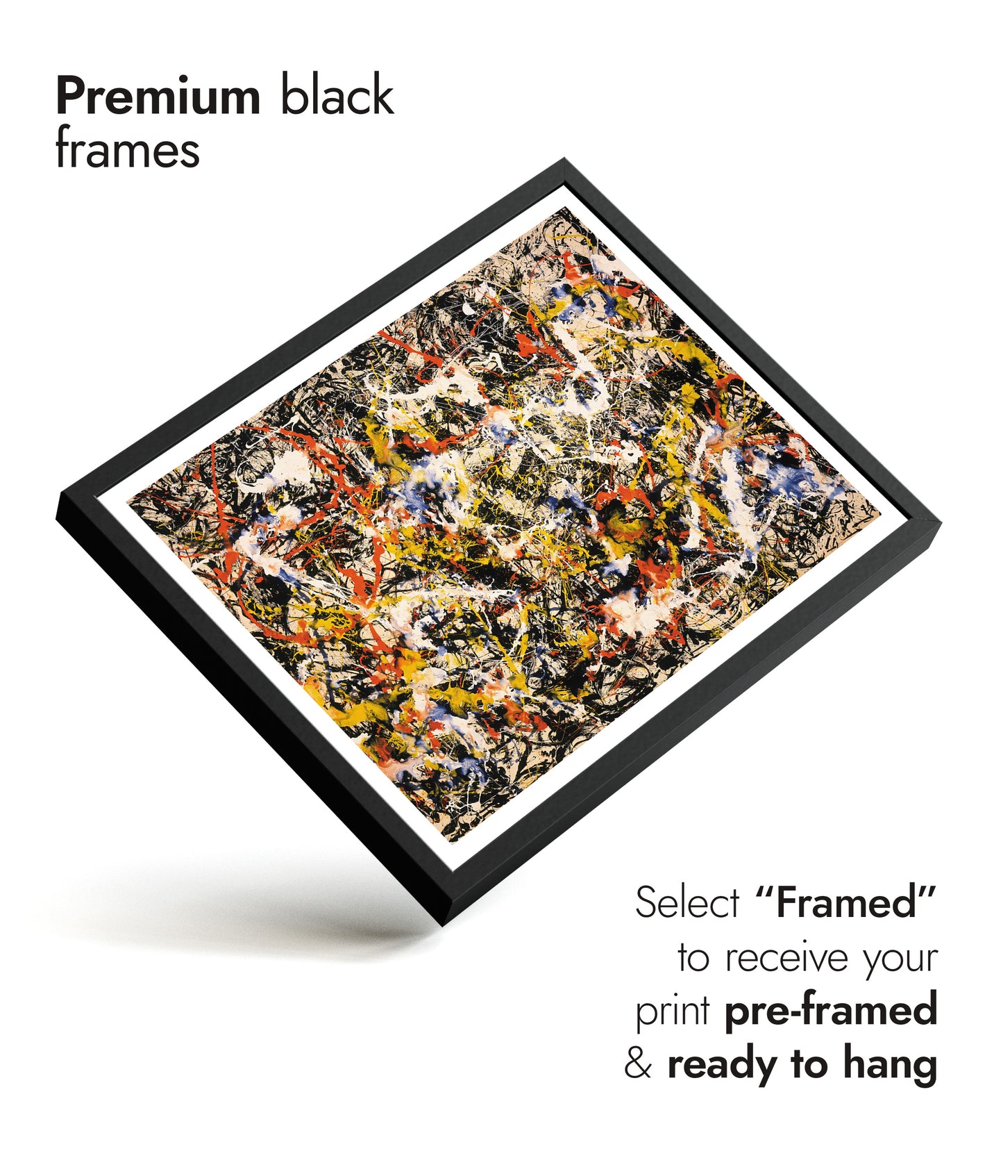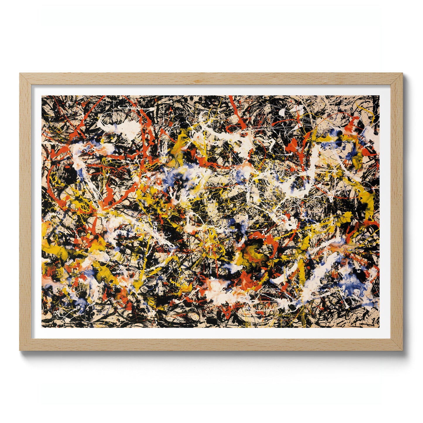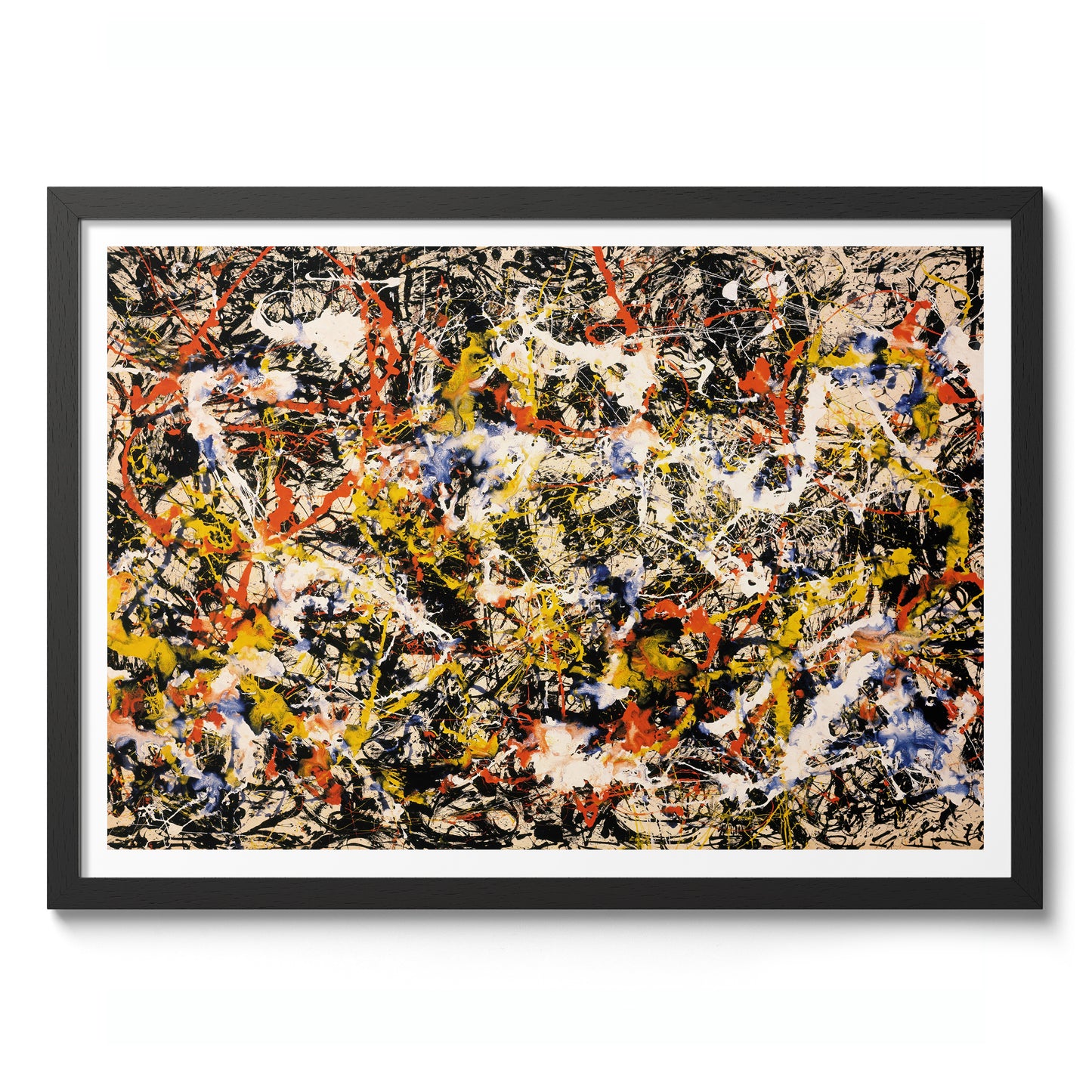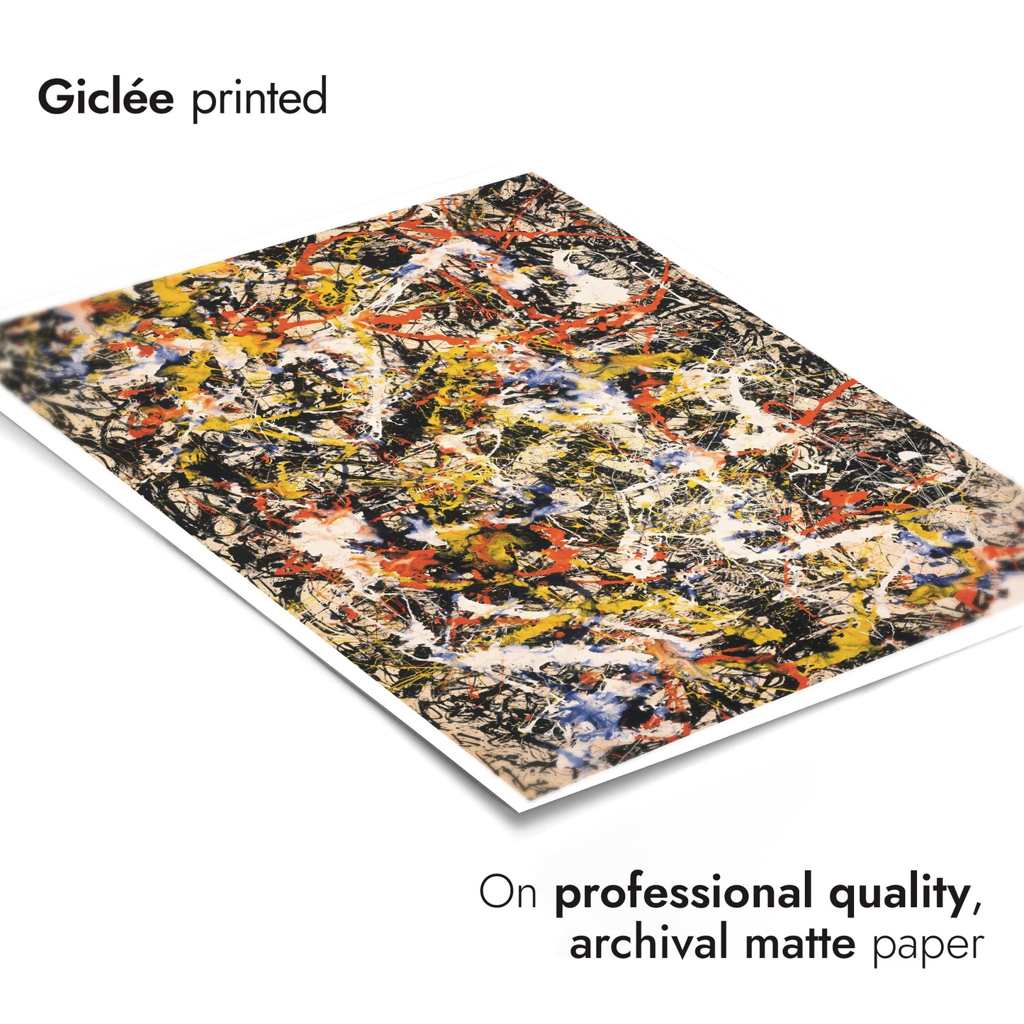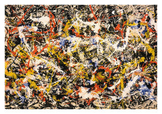 This "Convergence" poster by Jackson Pollock exemplifies abstract expressionism with its dynamic splatter technique. Vibrant reds, yellows, blues, and blacks intertwine in an energetic, chaotic composition, capturing the essence of spontaneity and movement. Ideal for a modern space, this art print invites contemplation and adds a bold statement to any wall. Perfect for lovers of abstract and influential modern art.
