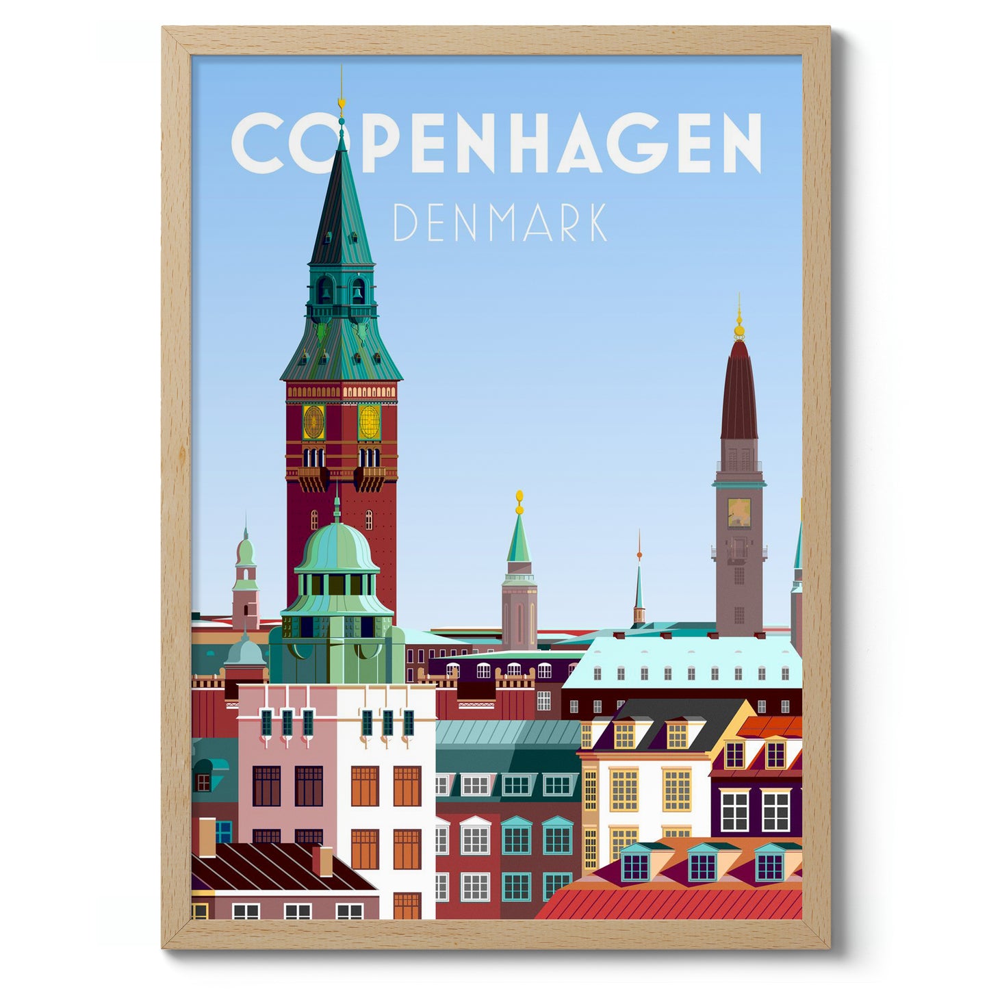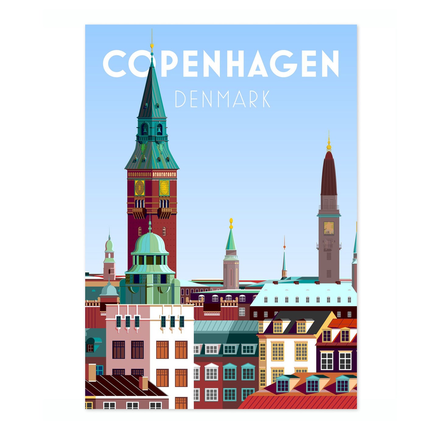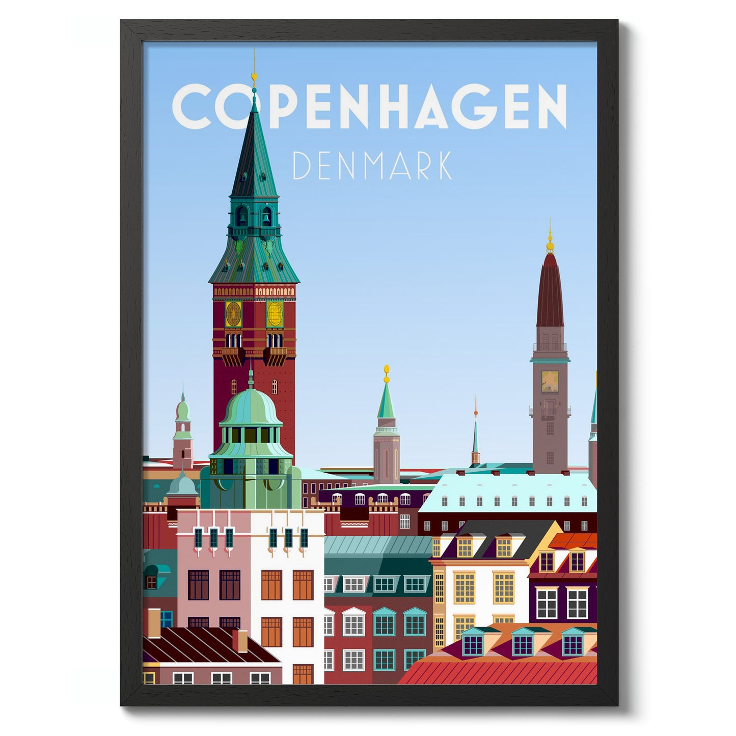 This vibrant Copenhagen poster captures the essence of Denmark's capital with its iconic skyline. Featuring the towering spires and colorful rooftops, this modern graphic art print highlights the architectural charm of the city. The dominant blue hues add a fresh and inviting feel, making it an ideal piece for travel enthusiasts and lovers of Scandinavian design.
