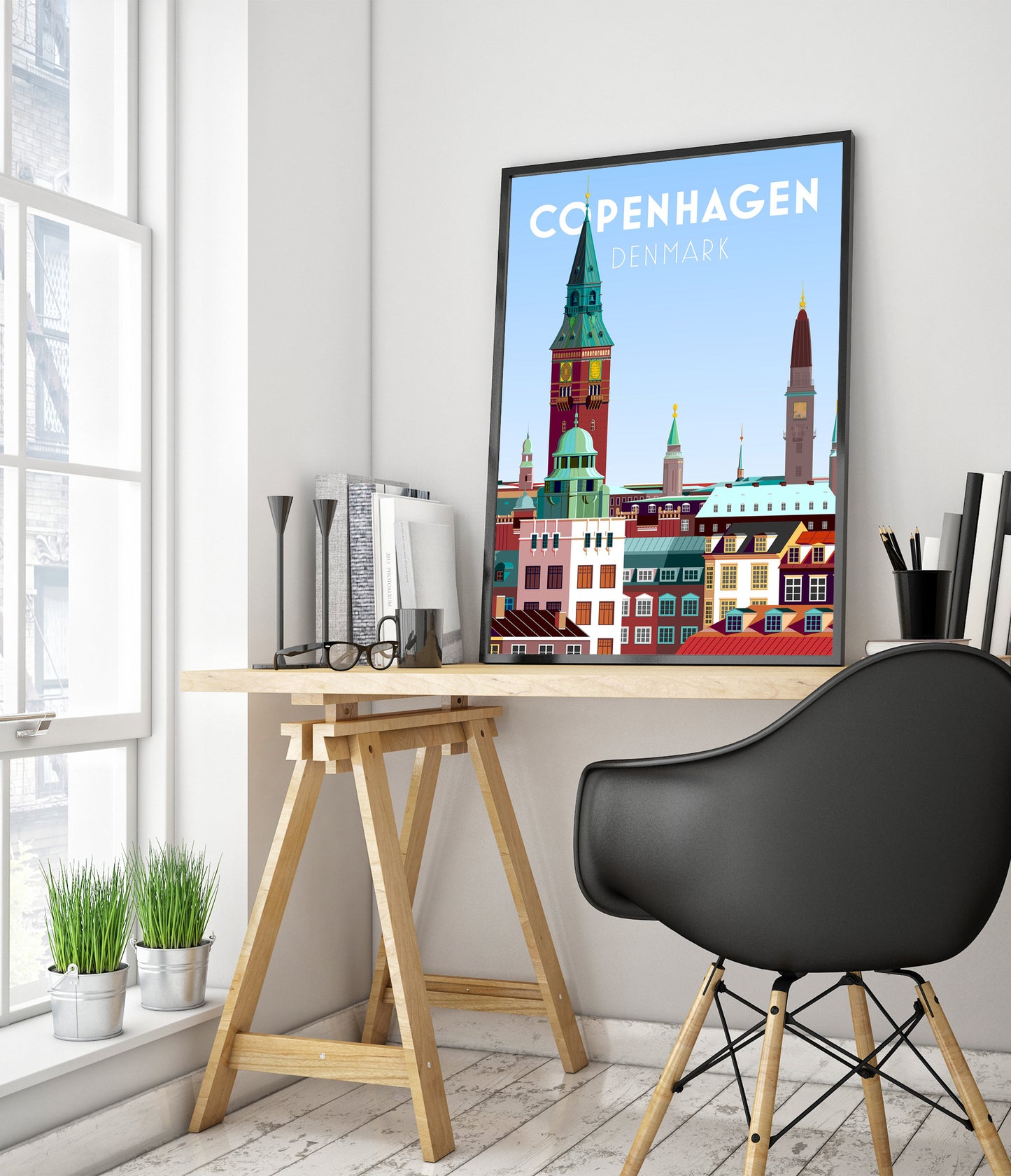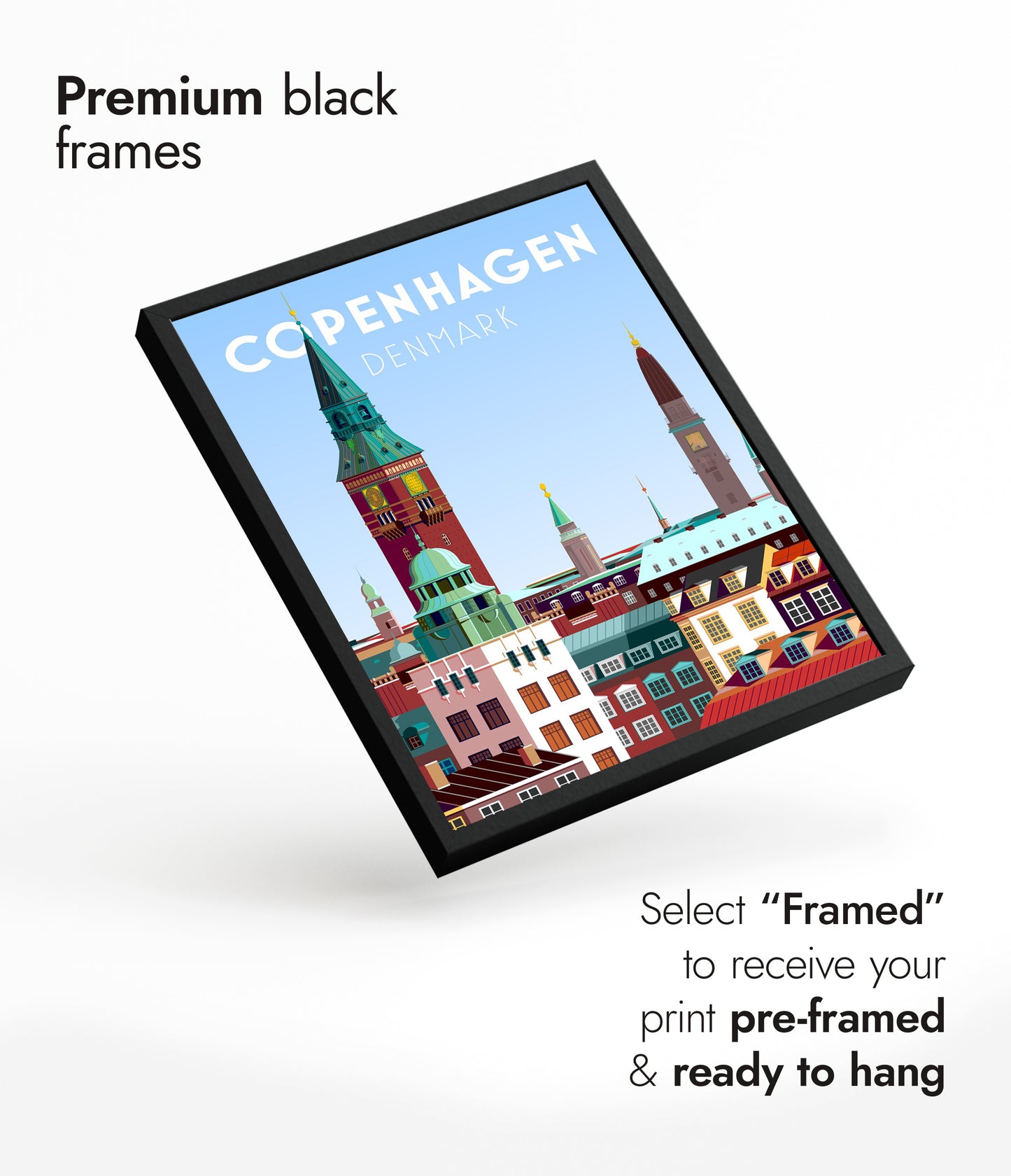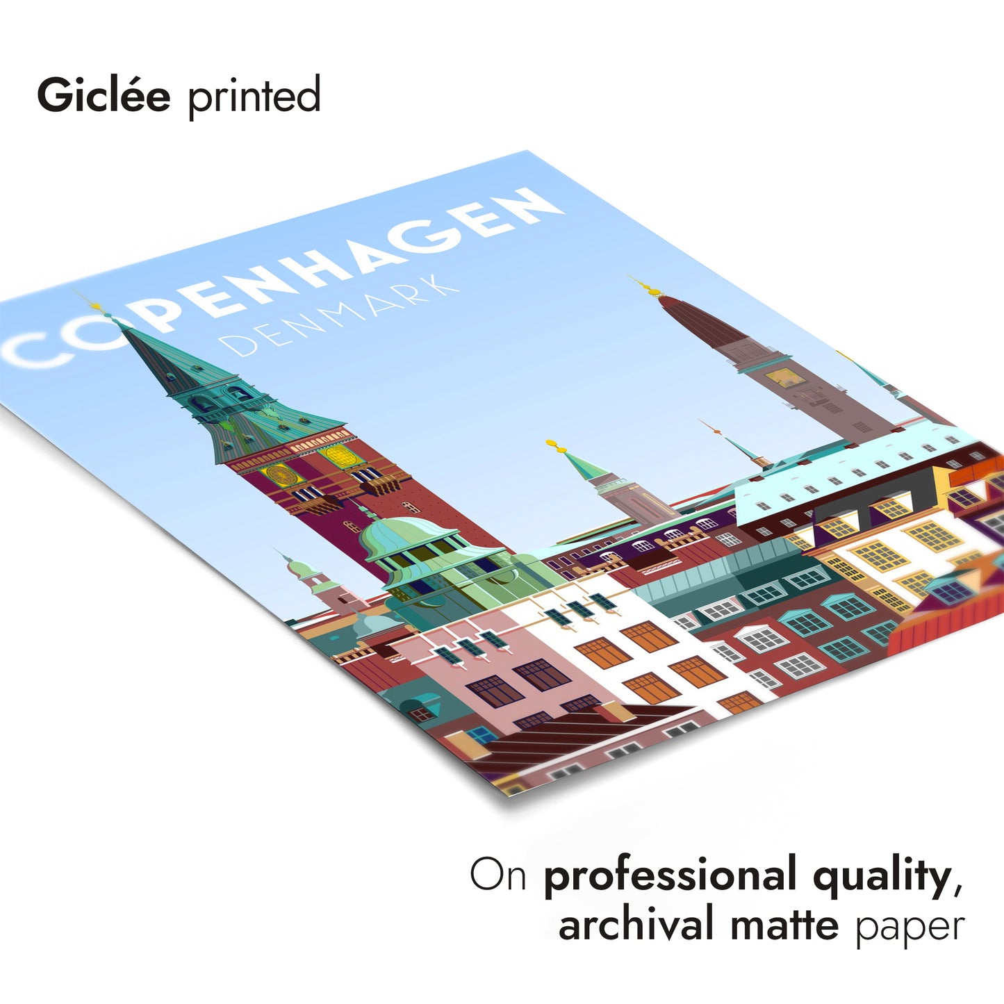This vibrant Copenhagen poster captures the essence of Denmark's capital with its iconic skyline. Featuring the towering spires and colorful rooftops, this modern graphic art print highlights the architectural charm of the city. The dominant blue hues add a fresh and inviting feel, making it an ideal piece for travel enthusiasts and lovers of Scandinavian design.