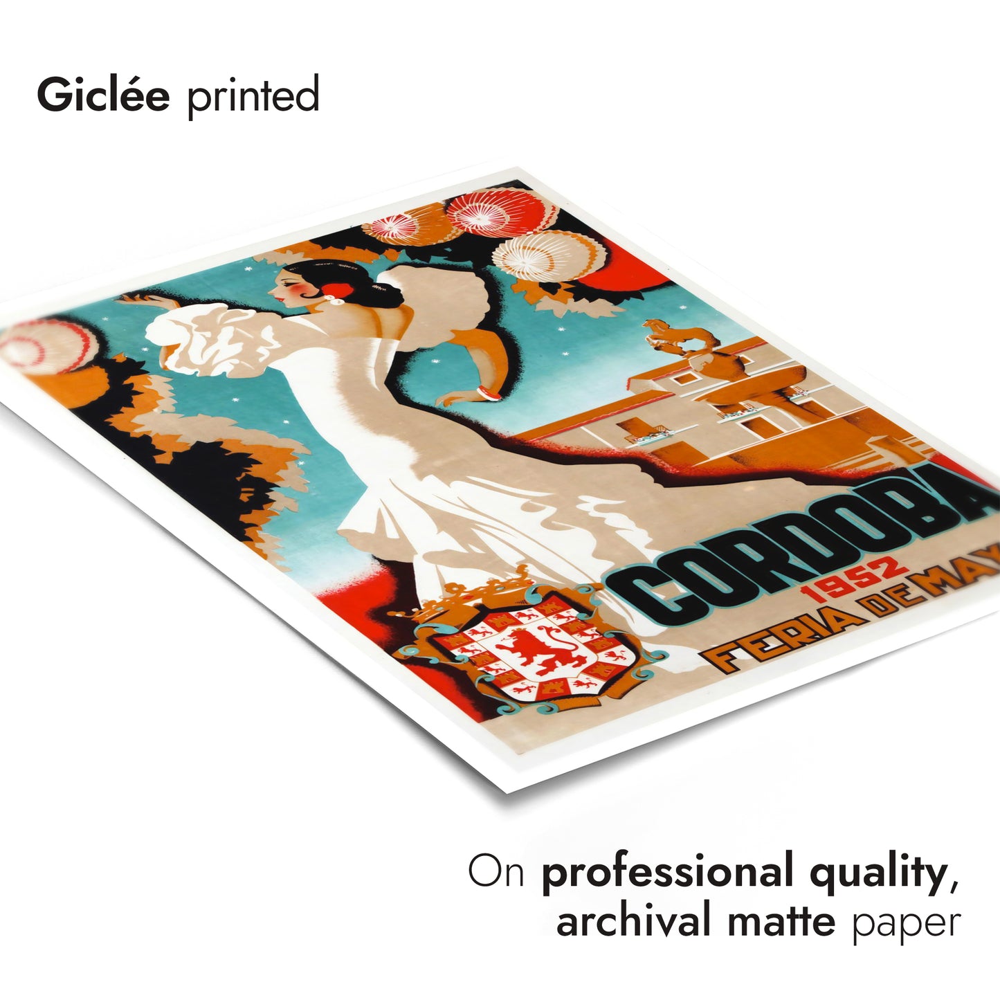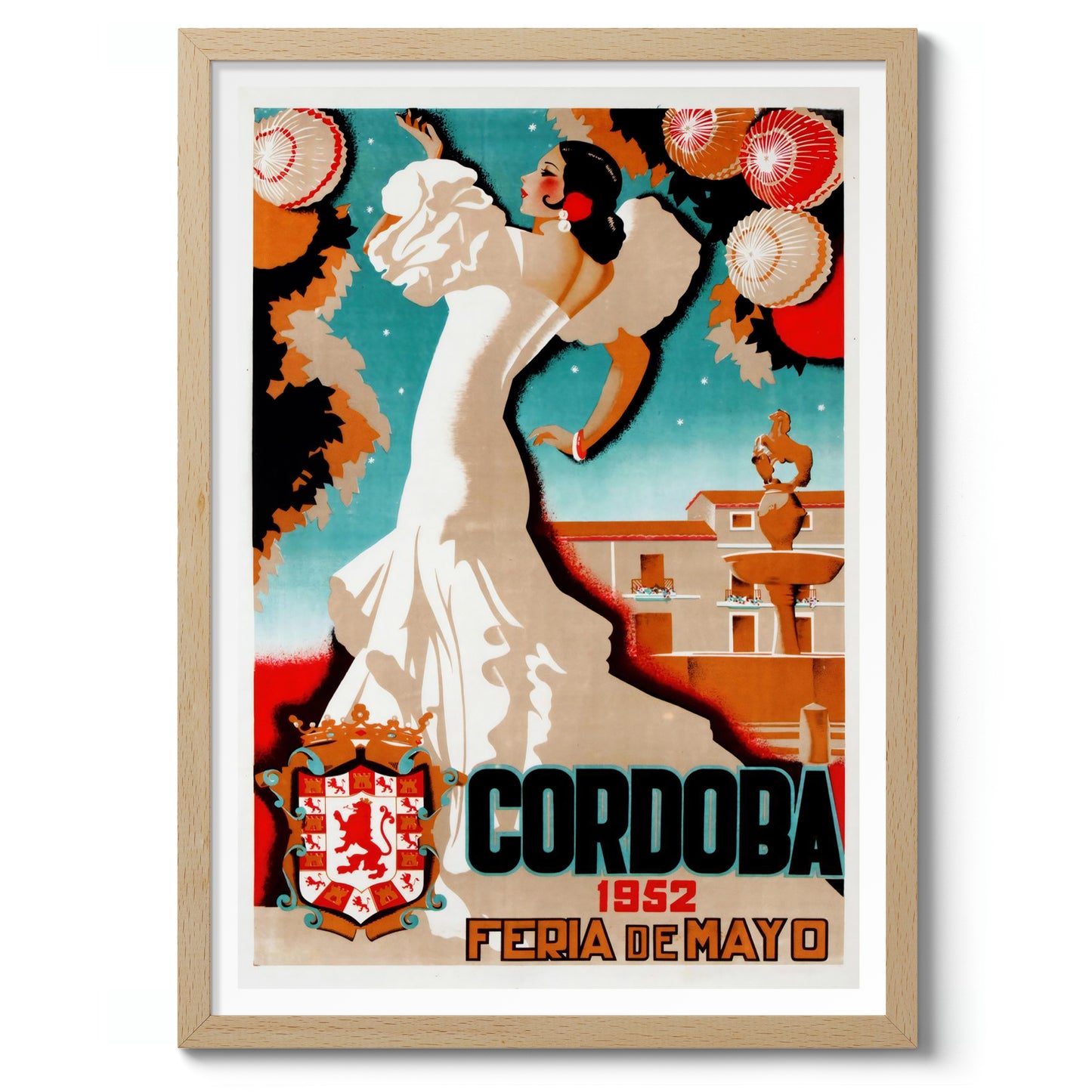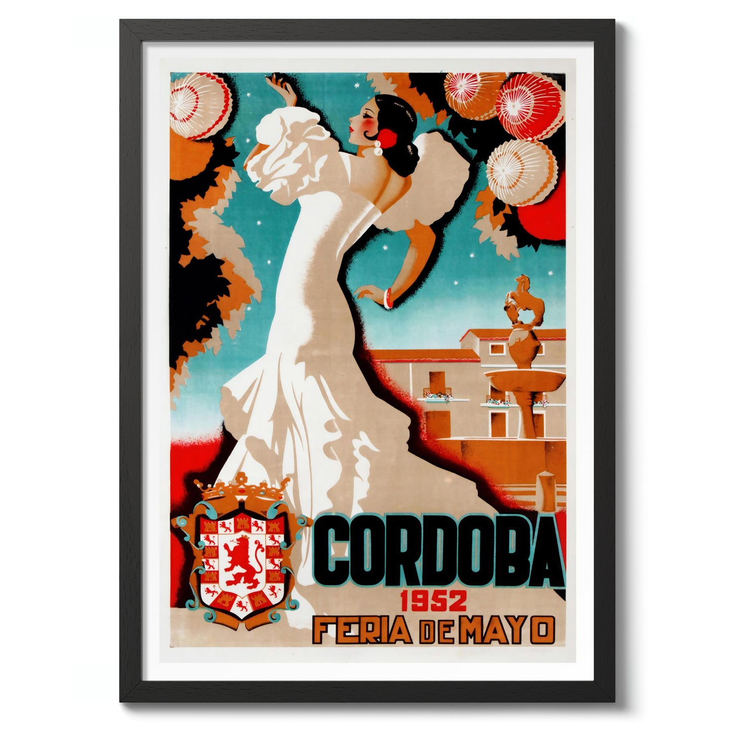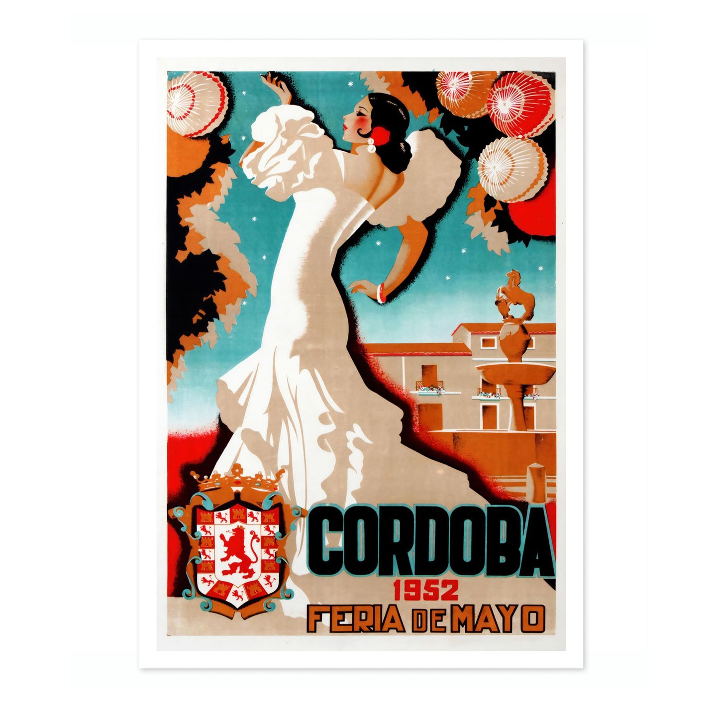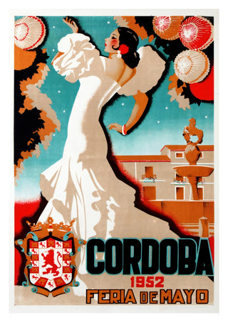 This vintage-inspired poster, "Cordoba, 1952," captures the vibrant essence of a traditional Spanish festival. The illustration showcases a graceful dancer in a flowing white dress, set against a backdrop of intricately decorated lanterns and Cordoba's iconic architecture. The bold typography enhances the cultural charm of this travel-themed artwork, making it a striking addition to any space.