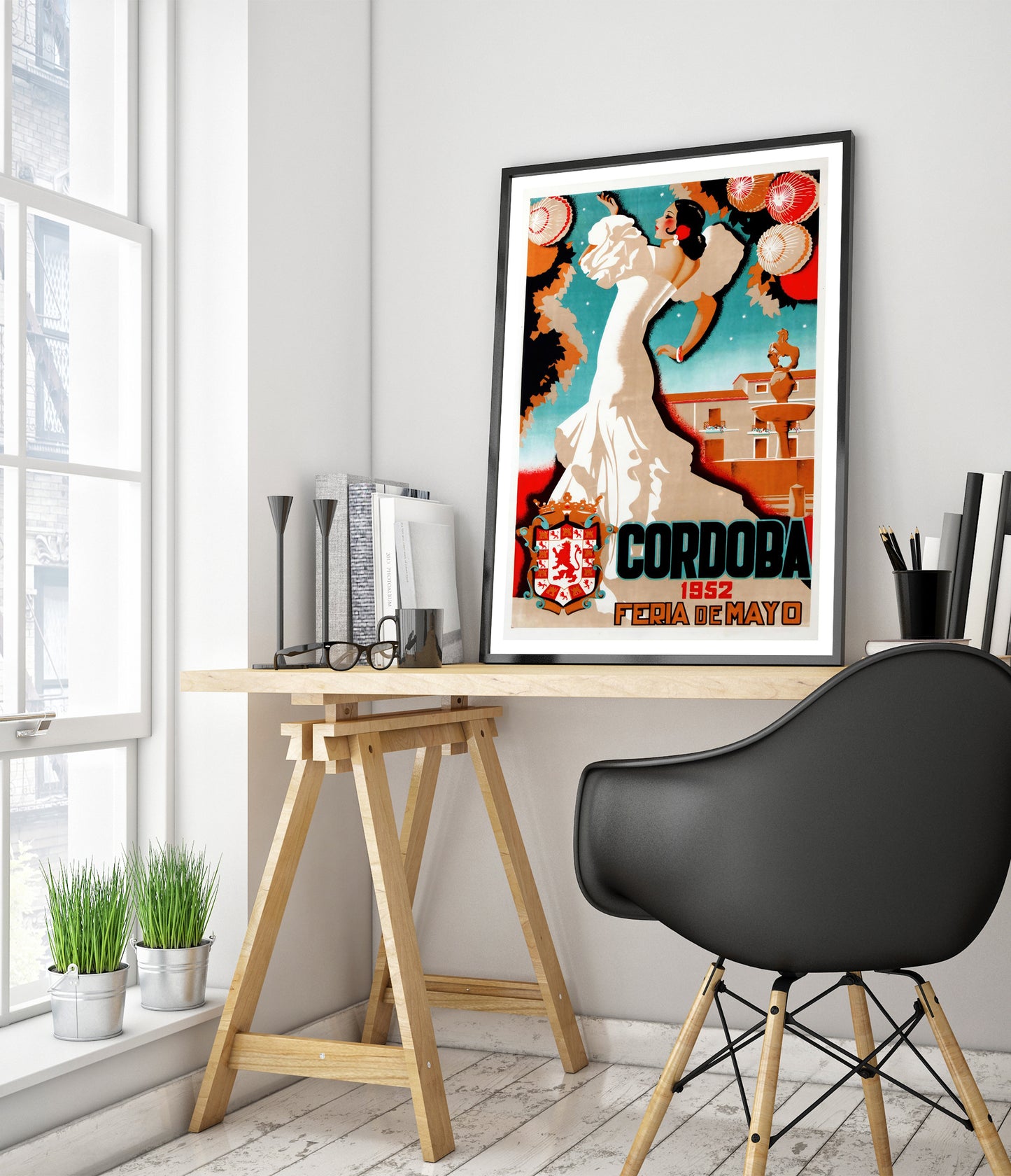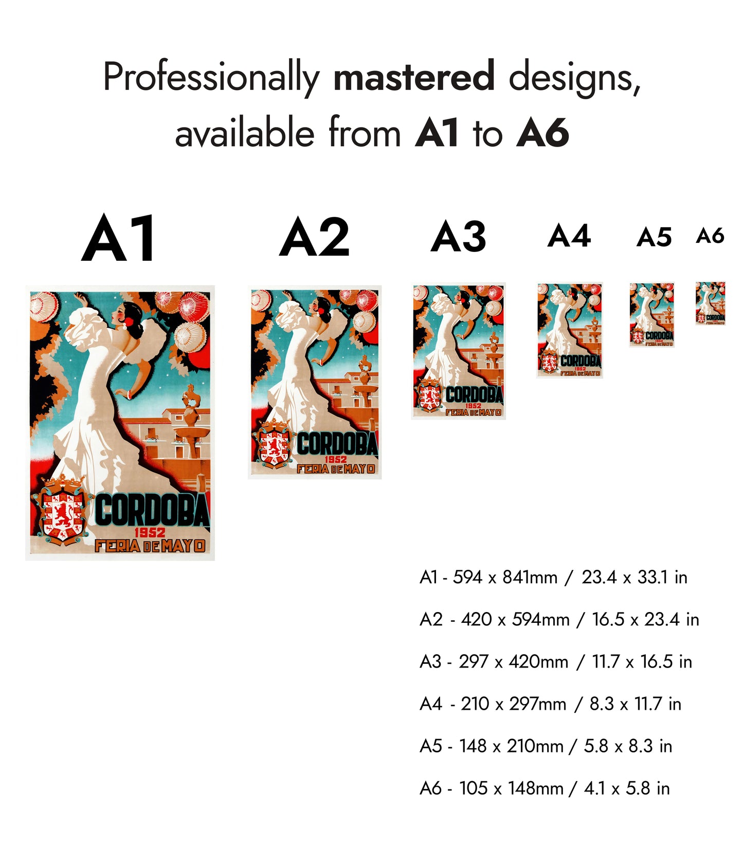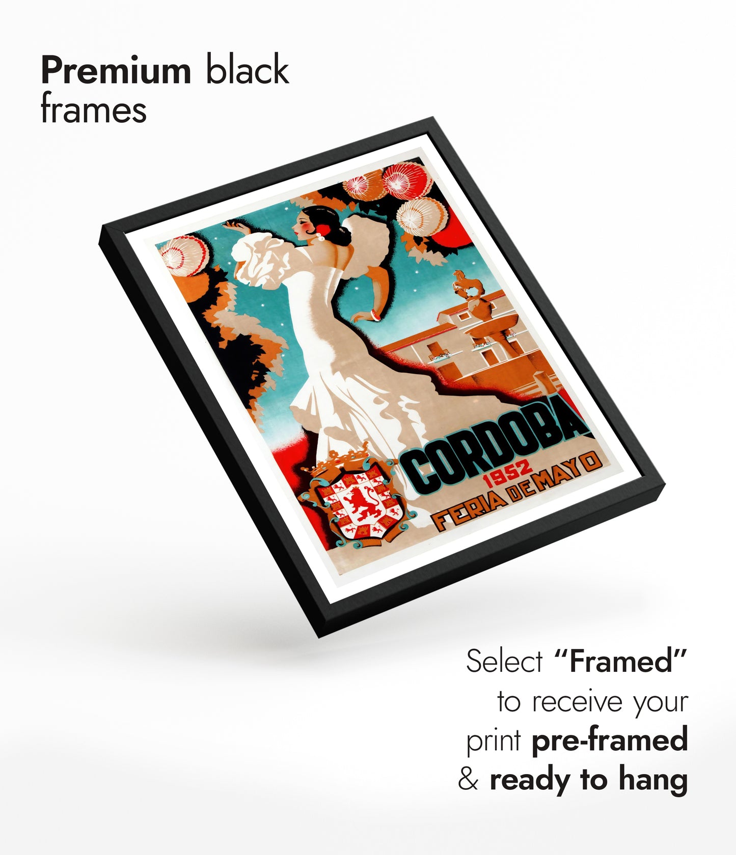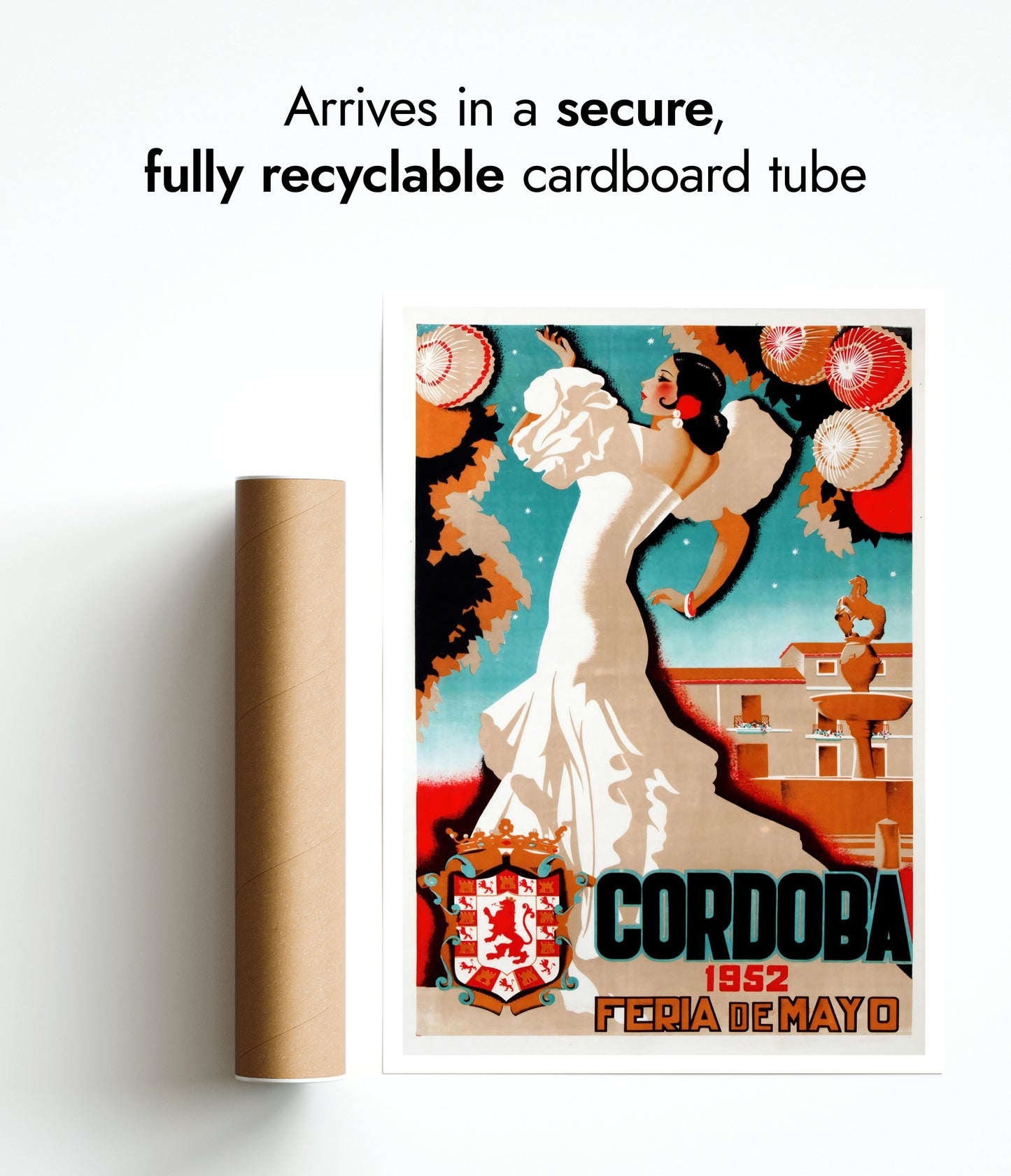 This vintage-inspired poster, "Cordoba, 1952," captures the vibrant essence of a traditional Spanish festival. The illustration showcases a graceful dancer in a flowing white dress, set against a backdrop of intricately decorated lanterns and Cordoba's iconic architecture. The bold typography enhances the cultural charm of this travel-themed artwork, making it a striking addition to any space.