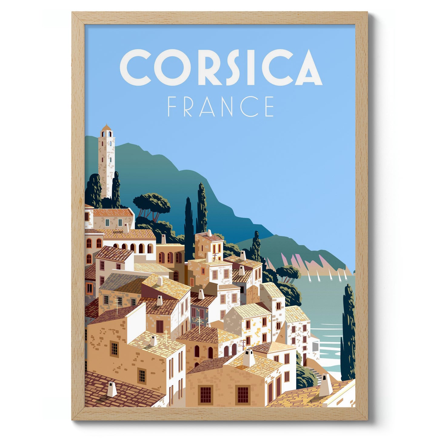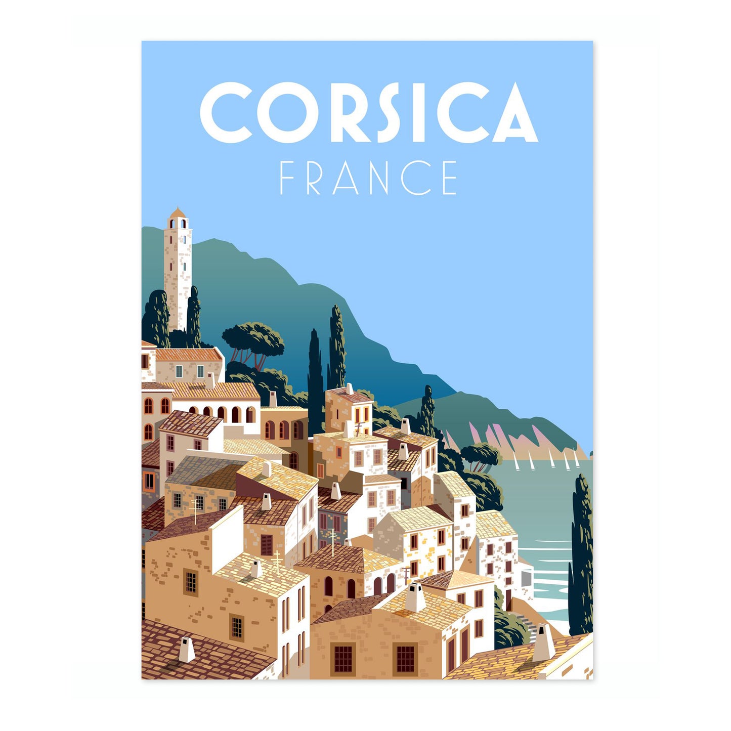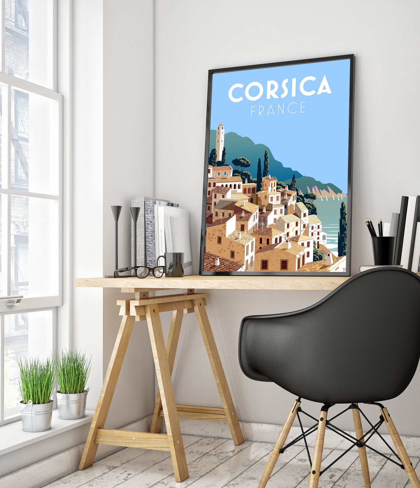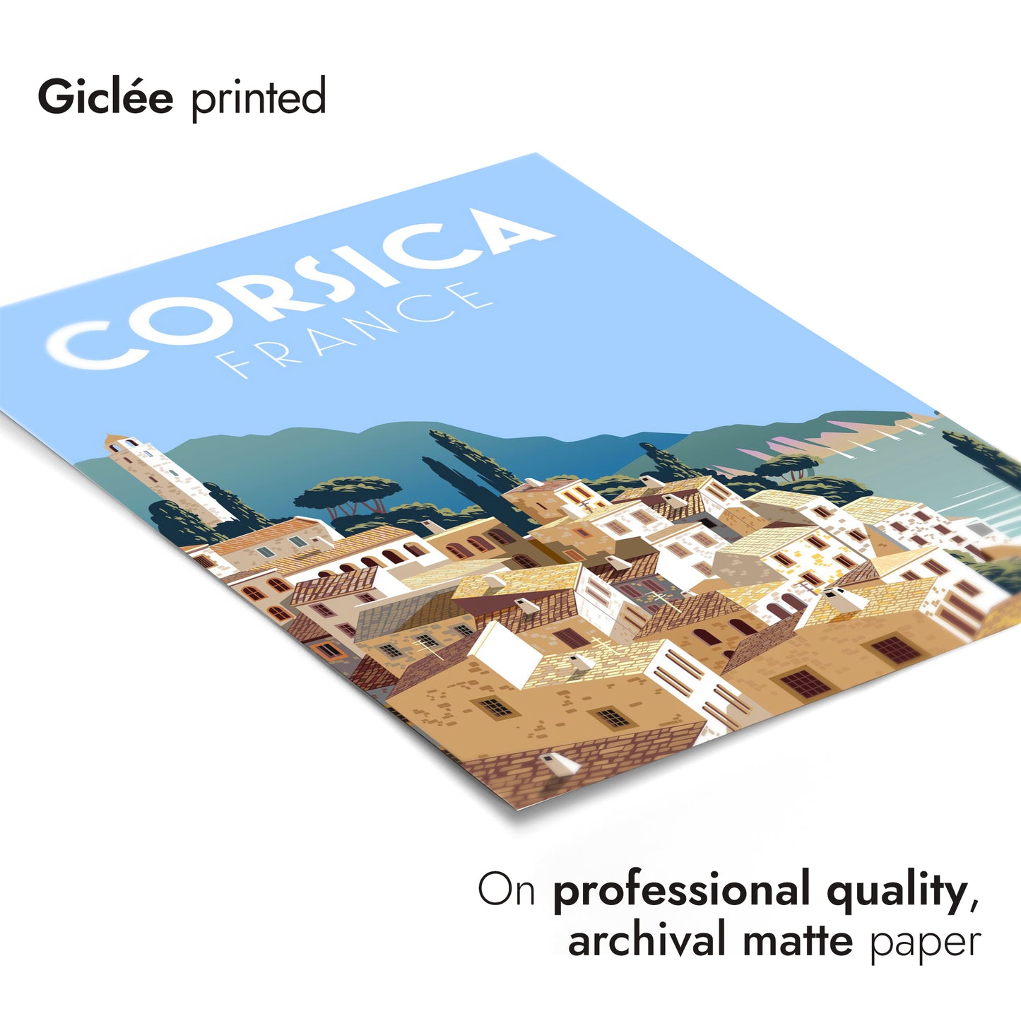 Experience the charm of Corsica, France with this vibrant travel poster. Featuring a graphic depiction of a coastal town nestled on a sunlit hill, it captures the picturesque rooftops and serene sea views. Perfect for those enchanted by travel and coastal landscapes, this poster brings a piece of Corsica's beauty to your space.