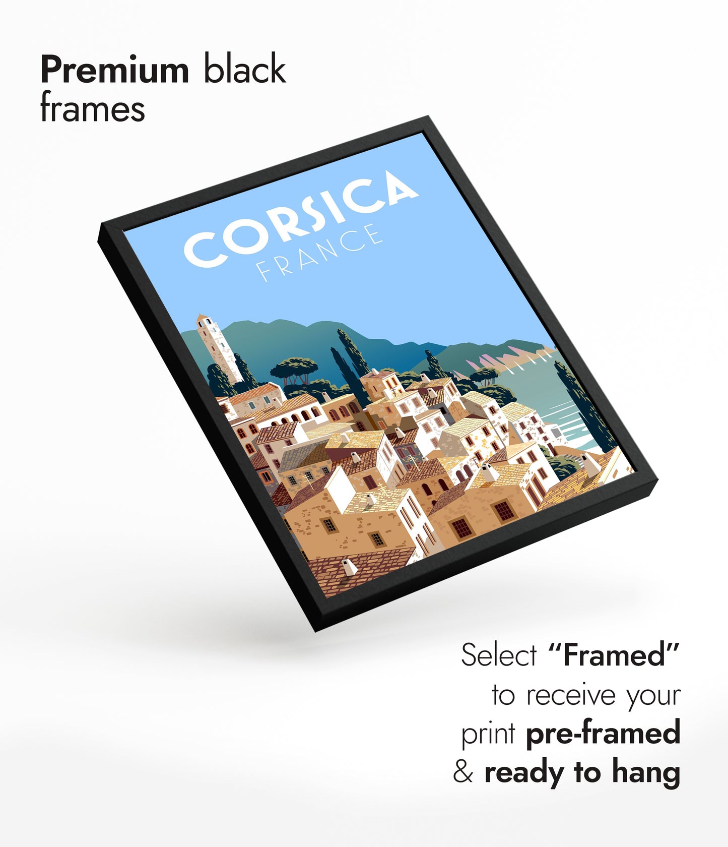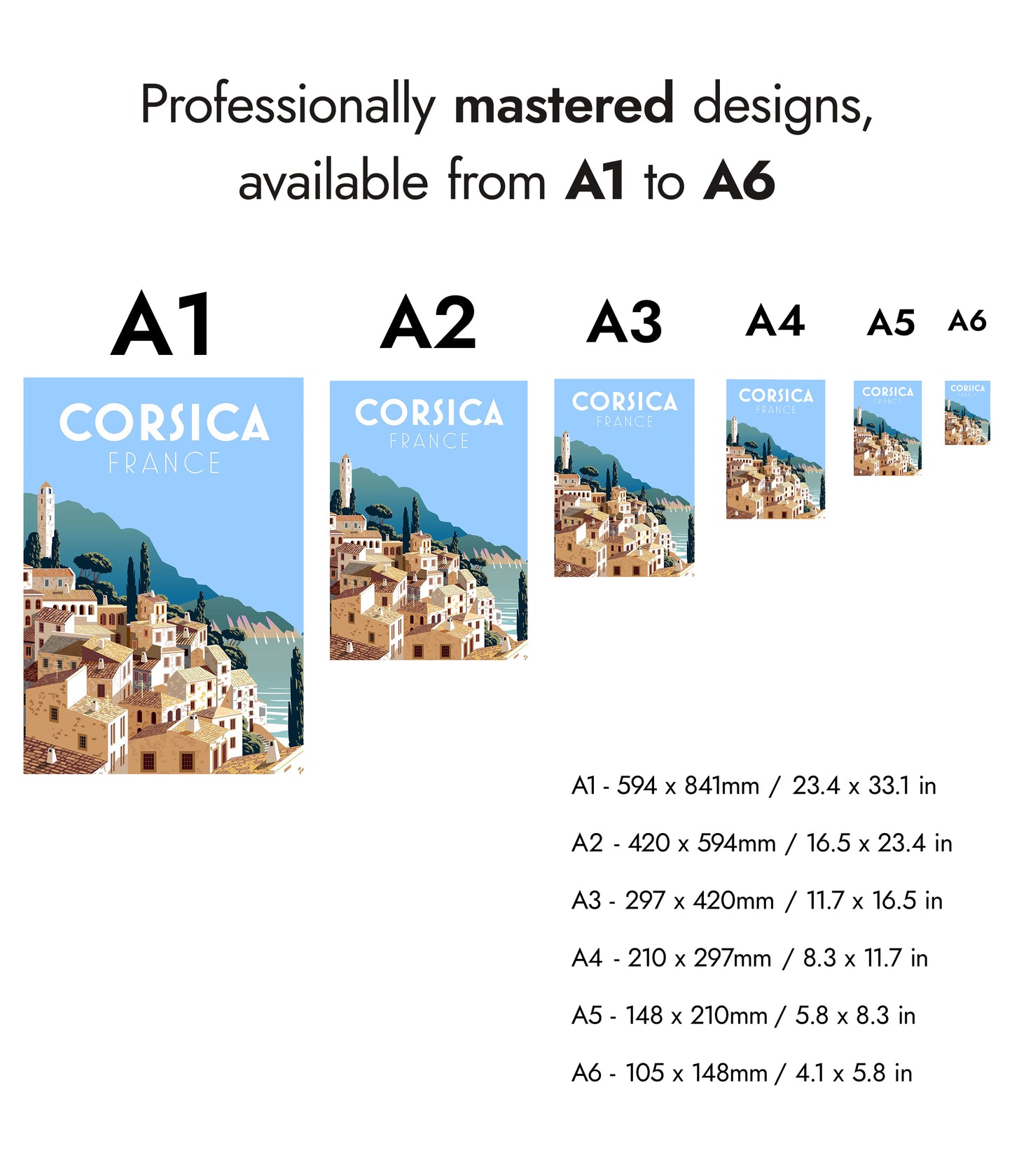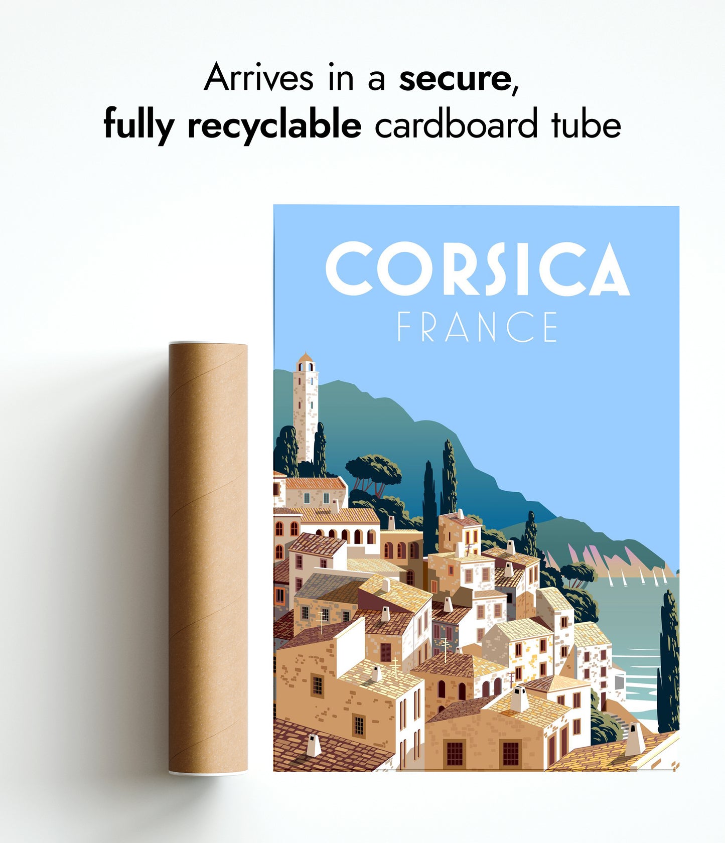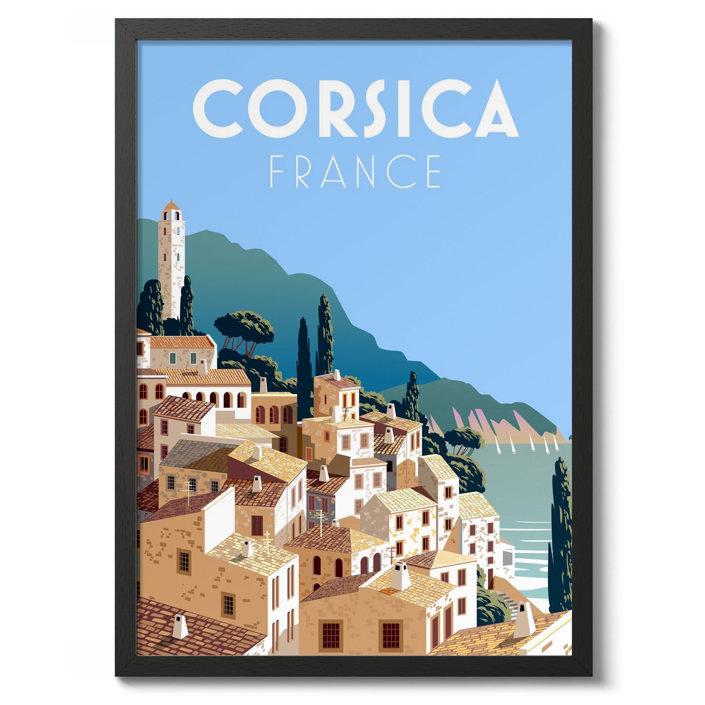 Experience the charm of Corsica, France with this vibrant travel poster. Featuring a graphic depiction of a coastal town nestled on a sunlit hill, it captures the picturesque rooftops and serene sea views. Perfect for those enchanted by travel and coastal landscapes, this poster brings a piece of Corsica's beauty to your space.
