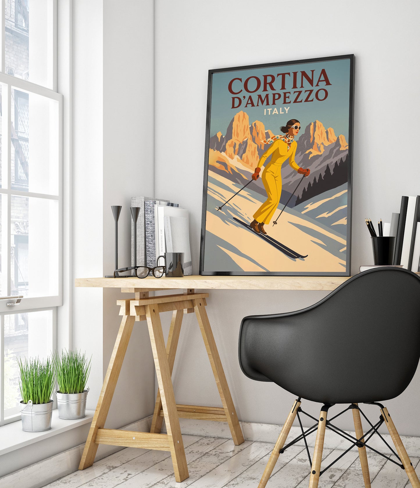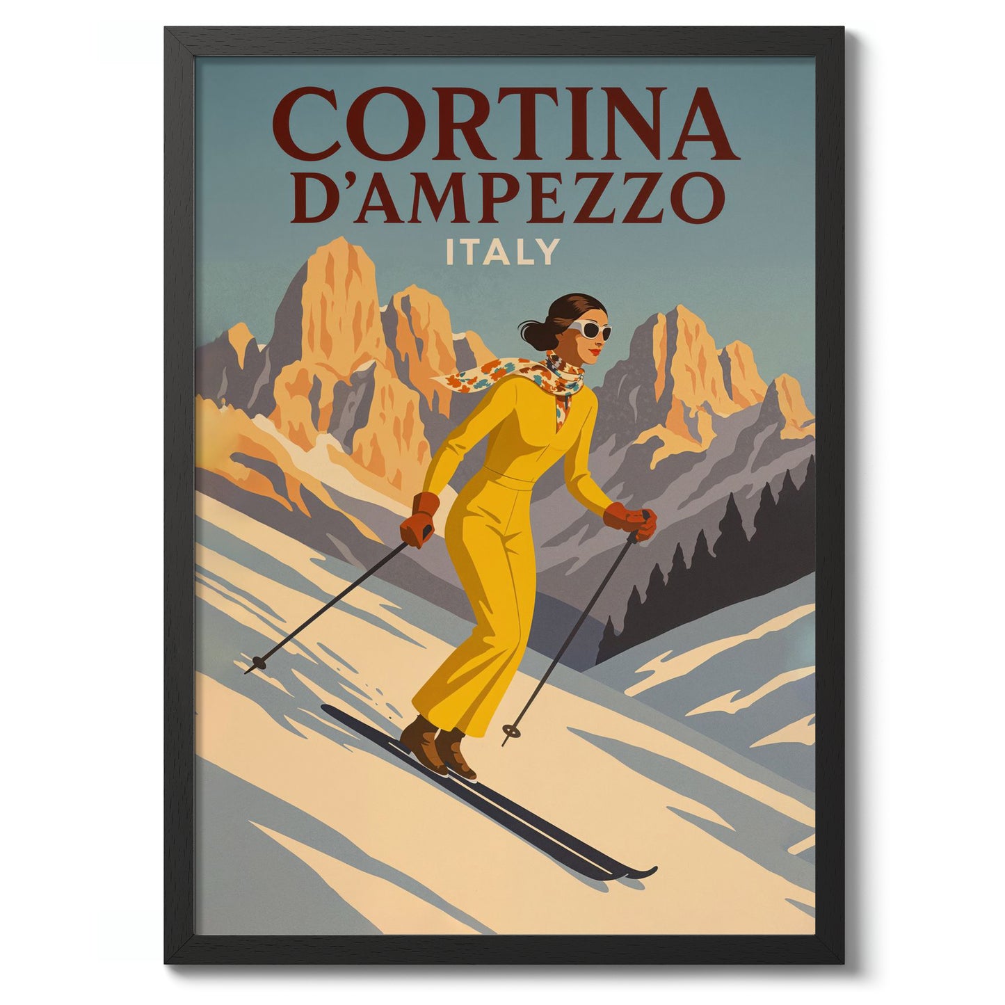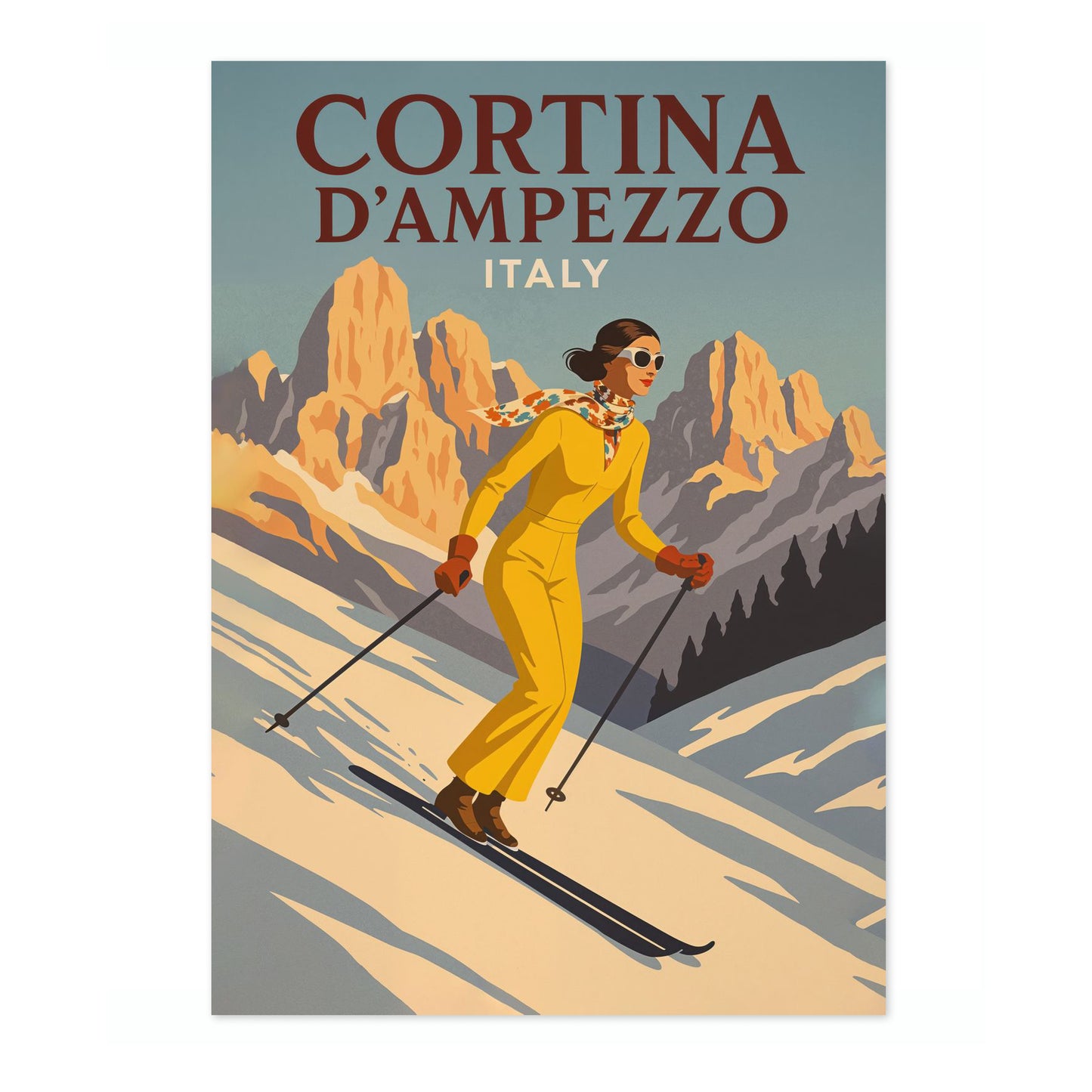 This vintage travel poster captures a chic skier gracefully descending the snowy slopes of Cortina d'Ampezzo, Italy. Framed by striking mountainous backdrops, the scene showcases a stylish woman in a bold yellow ski outfit, emphasizing the region's allure as a premier winter sports destination. Ideal for vintage travel enthusiasts or those drawn to graphic depictions of Italian alpine landscapes.