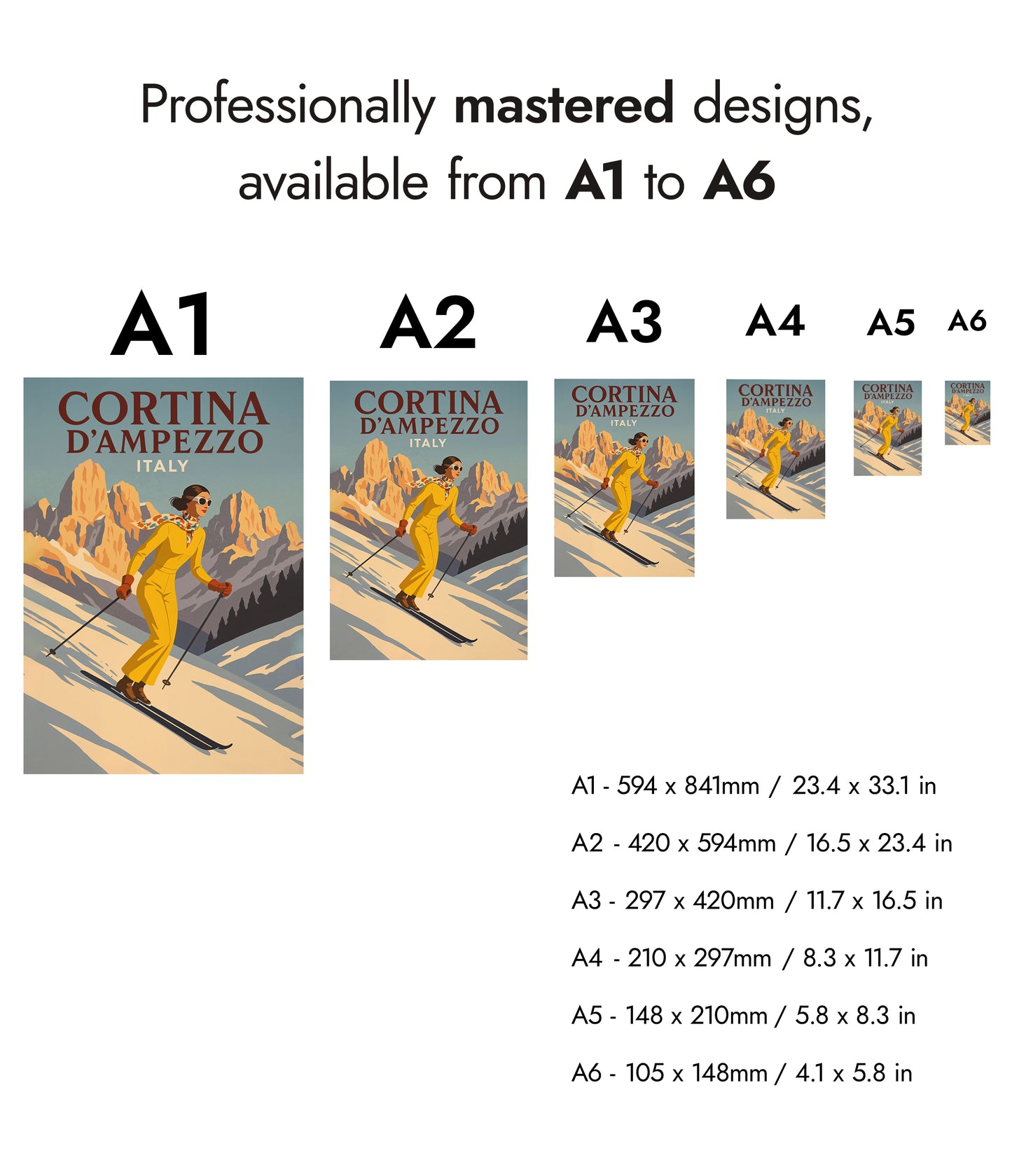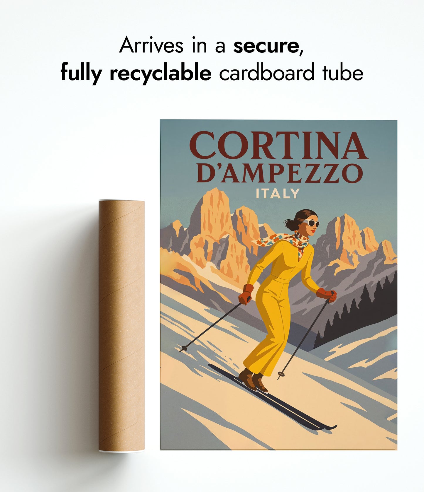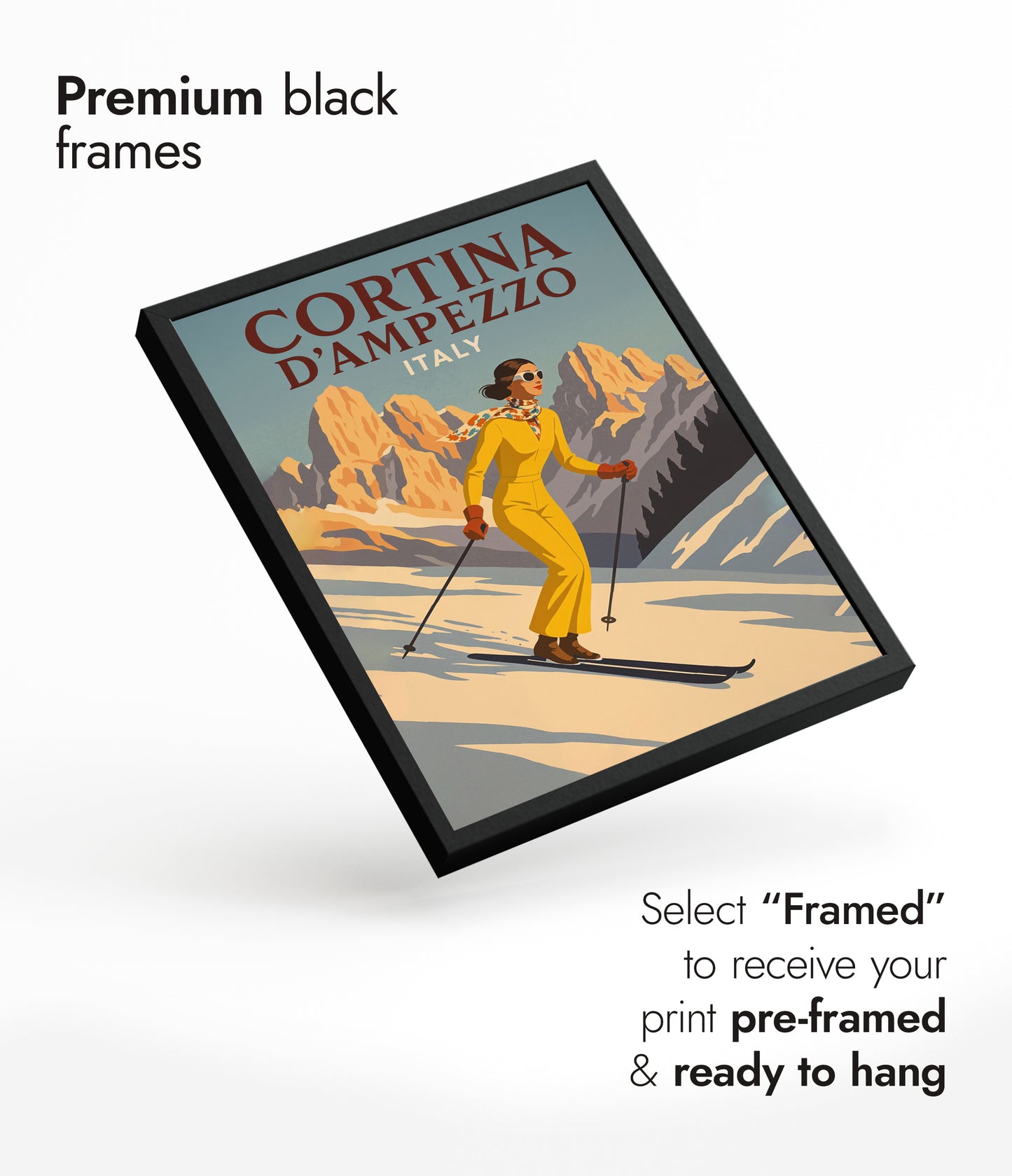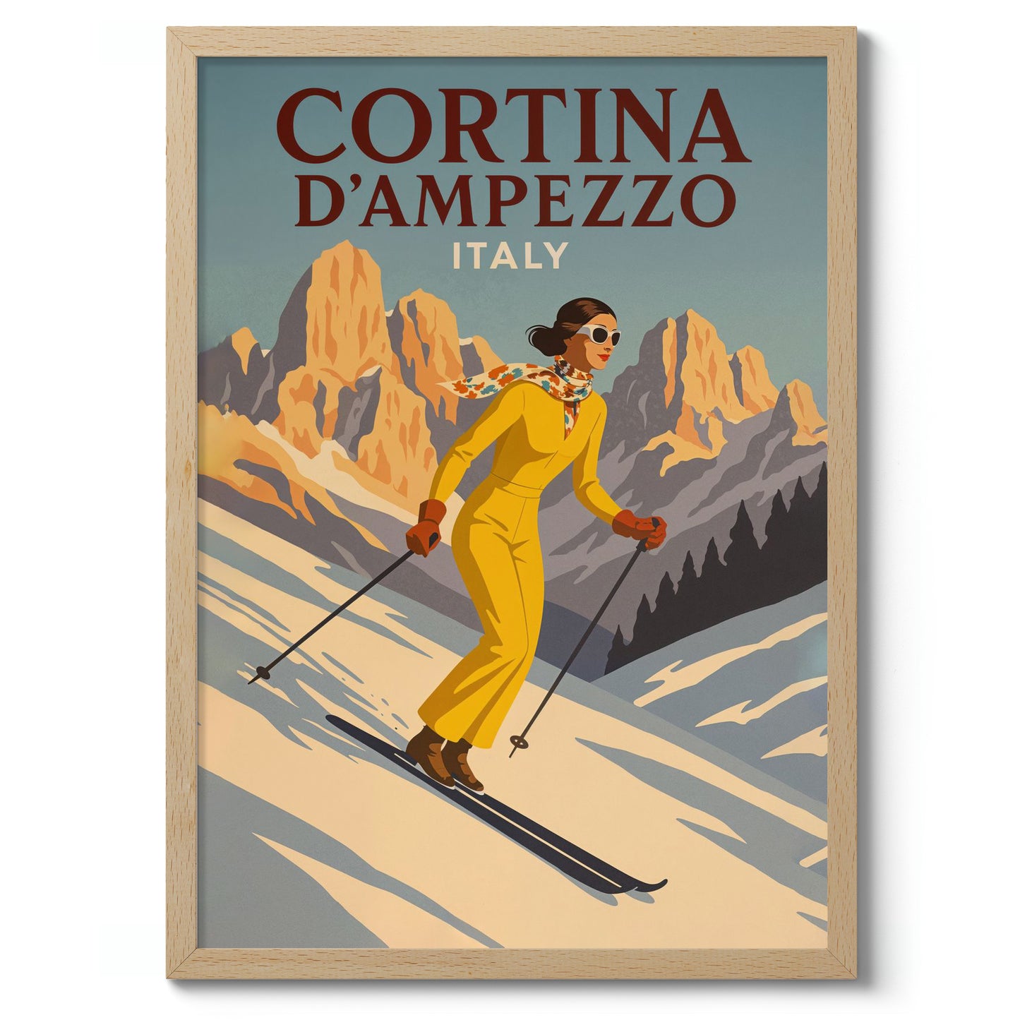 This vintage travel poster captures a chic skier gracefully descending the snowy slopes of Cortina d'Ampezzo, Italy. Framed by striking mountainous backdrops, the scene showcases a stylish woman in a bold yellow ski outfit, emphasizing the region's allure as a premier winter sports destination. Ideal for vintage travel enthusiasts or those drawn to graphic depictions of Italian alpine landscapes.