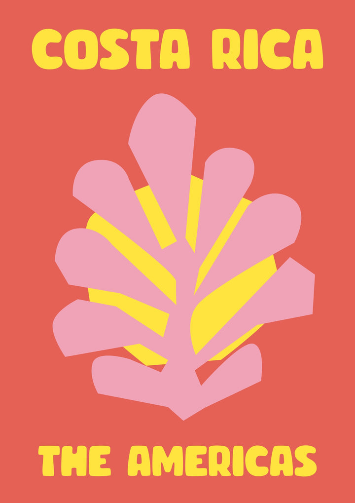 This Costa Rica travel poster features a modern, minimalist design with abstract shapes. The cutout-style graphic depicts a pink leaf against a bold red background with a sunburst effect. "Costa Rica" and "The Americas" are prominently displayed in vibrant yellow text, capturing the essence of tropical allure and adventure. This portrait art print exudes contemporary charm, perfect for travel enthusiasts.