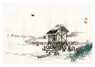 This traditional Japanese painting by Kono Bairei depicts a serene lakeside cottage on stilts, accompanied by a small boat. A lone bird soars in the sky above, enhancing the tranquility of the rural scene. Ideal for landscape art enthusiasts, this poster embraces minimalist beauty, blending cottage charm with natural elements.