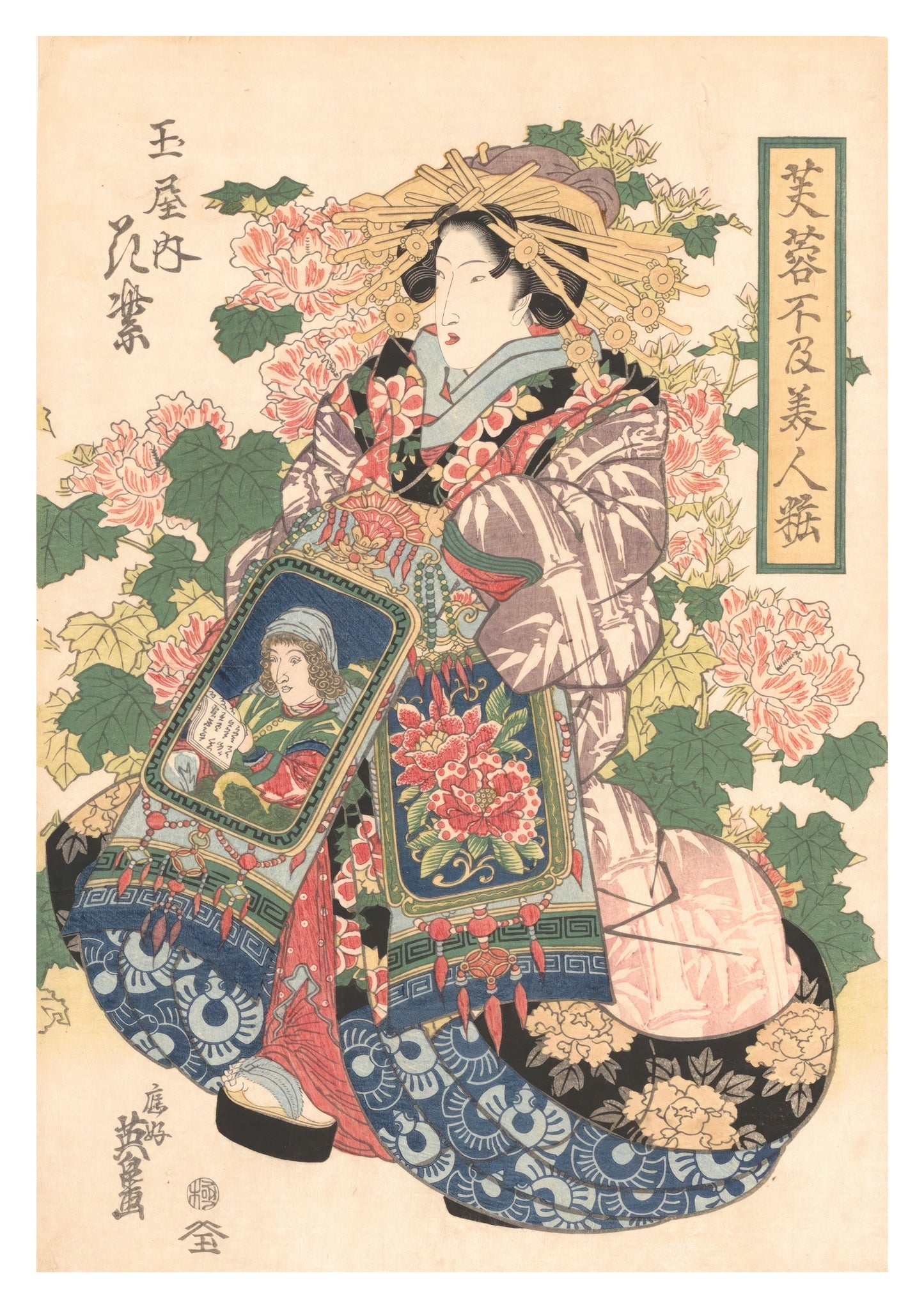 The "Courtesan in Formal Dress" poster by Keisai Eisen features a meticulously detailed traditional woodblock illustration. The courtesan, adorned in intricate, vibrant attire, stands surrounded by blooming lotus flowers. This Ukiyo-e style portrait masterfully captures the elegance and beauty of traditional Japanese culture, making it a timeless piece for any art enthusiast's collection.