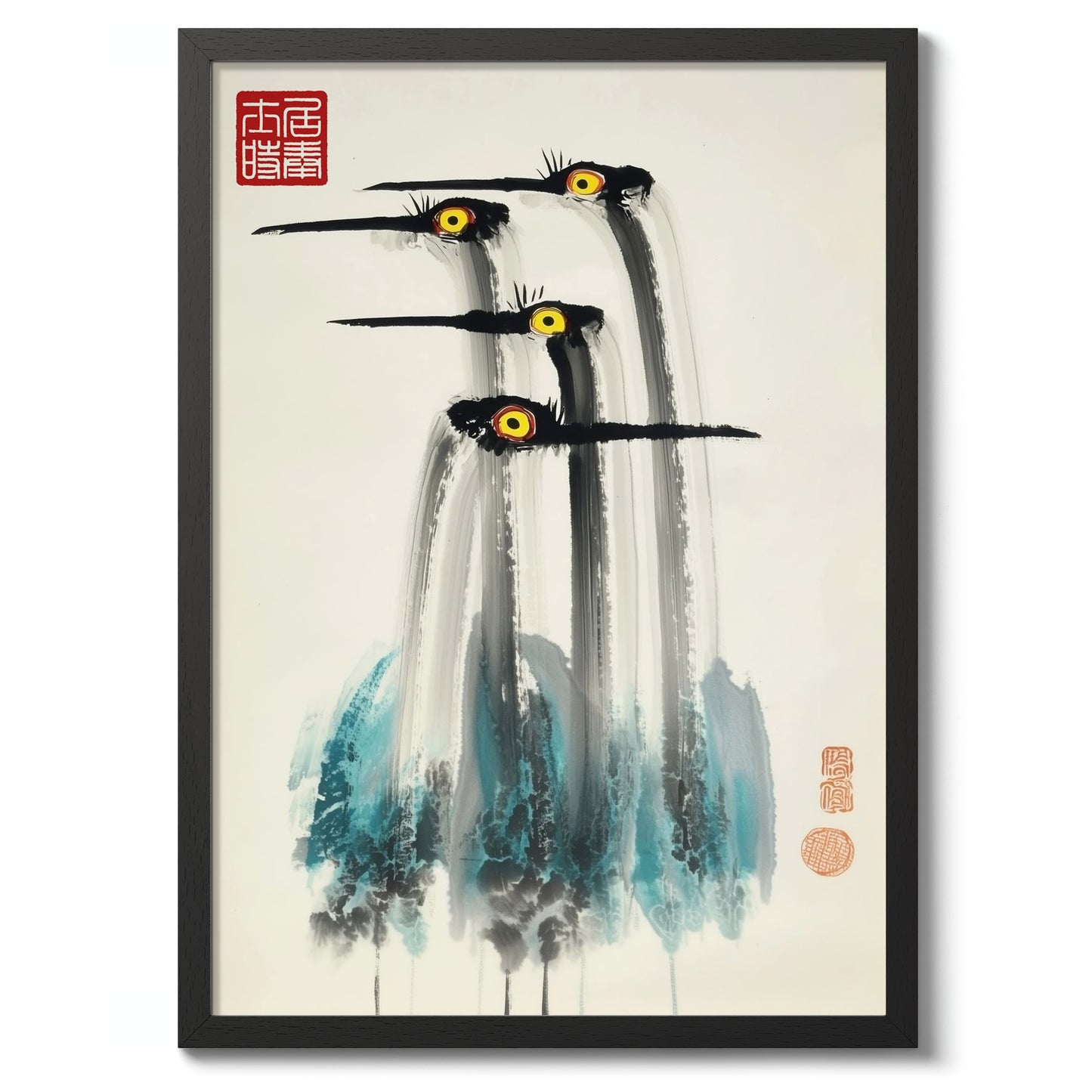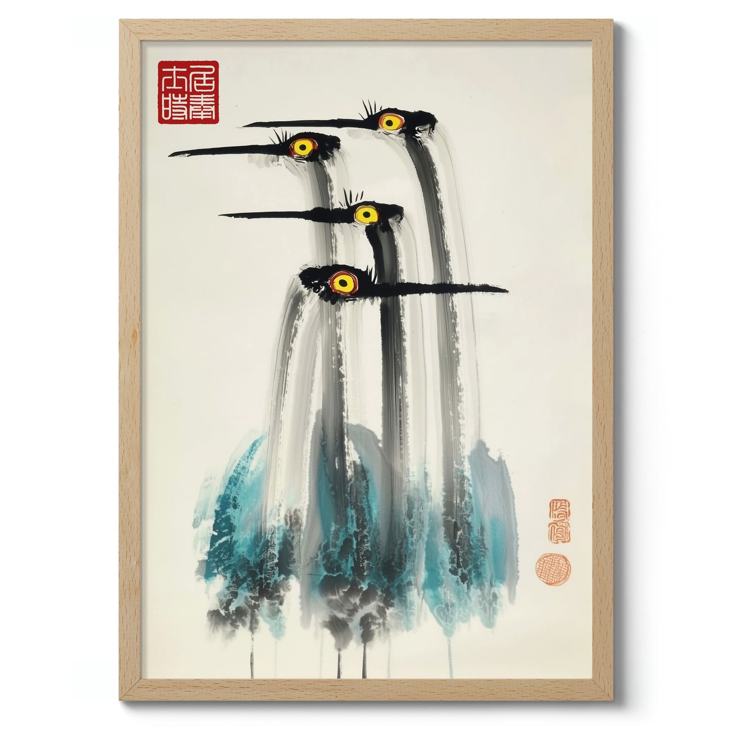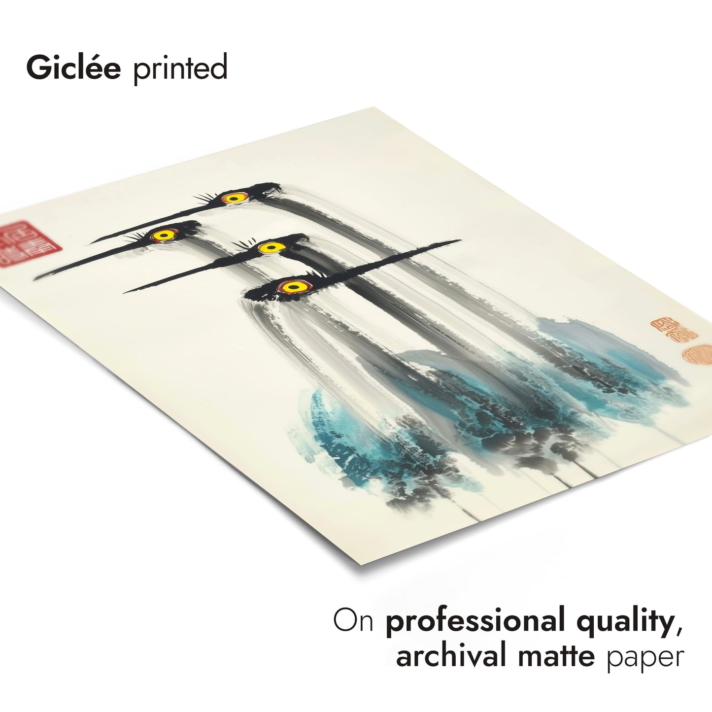 This "Cranes I" poster by Matsumoto Hoji features elegant cranes painted in a traditional Sumi-E style. The artwork showcases long-necked birds with striking yellow eyes, set against a soothing blue and beige backdrop. The minimalist brushwork captures the essence of Japanese nature and tranquility, making it a perfect piece for fans of Japanese art and animal themes.