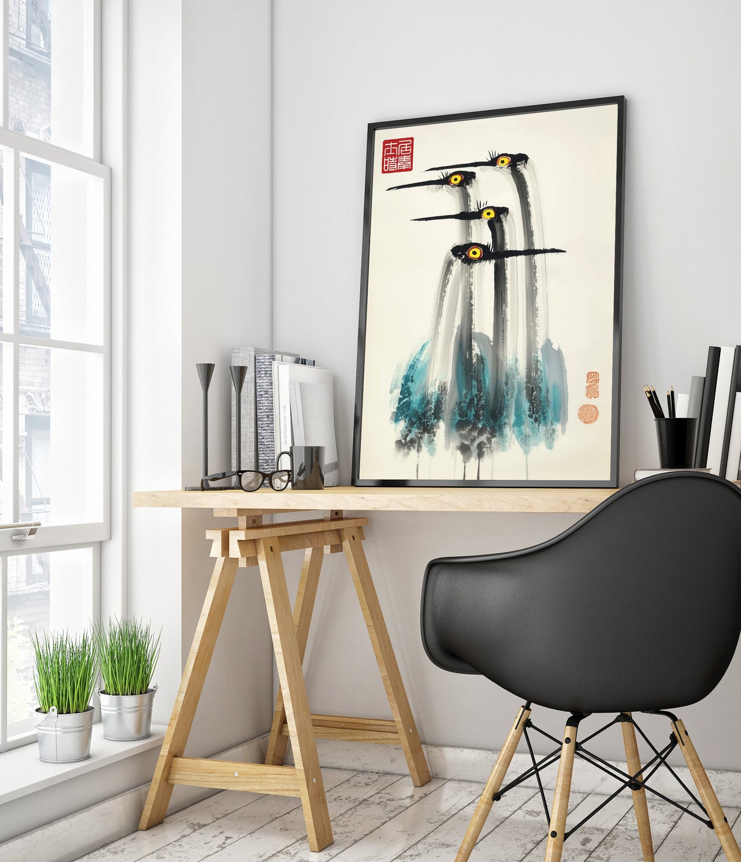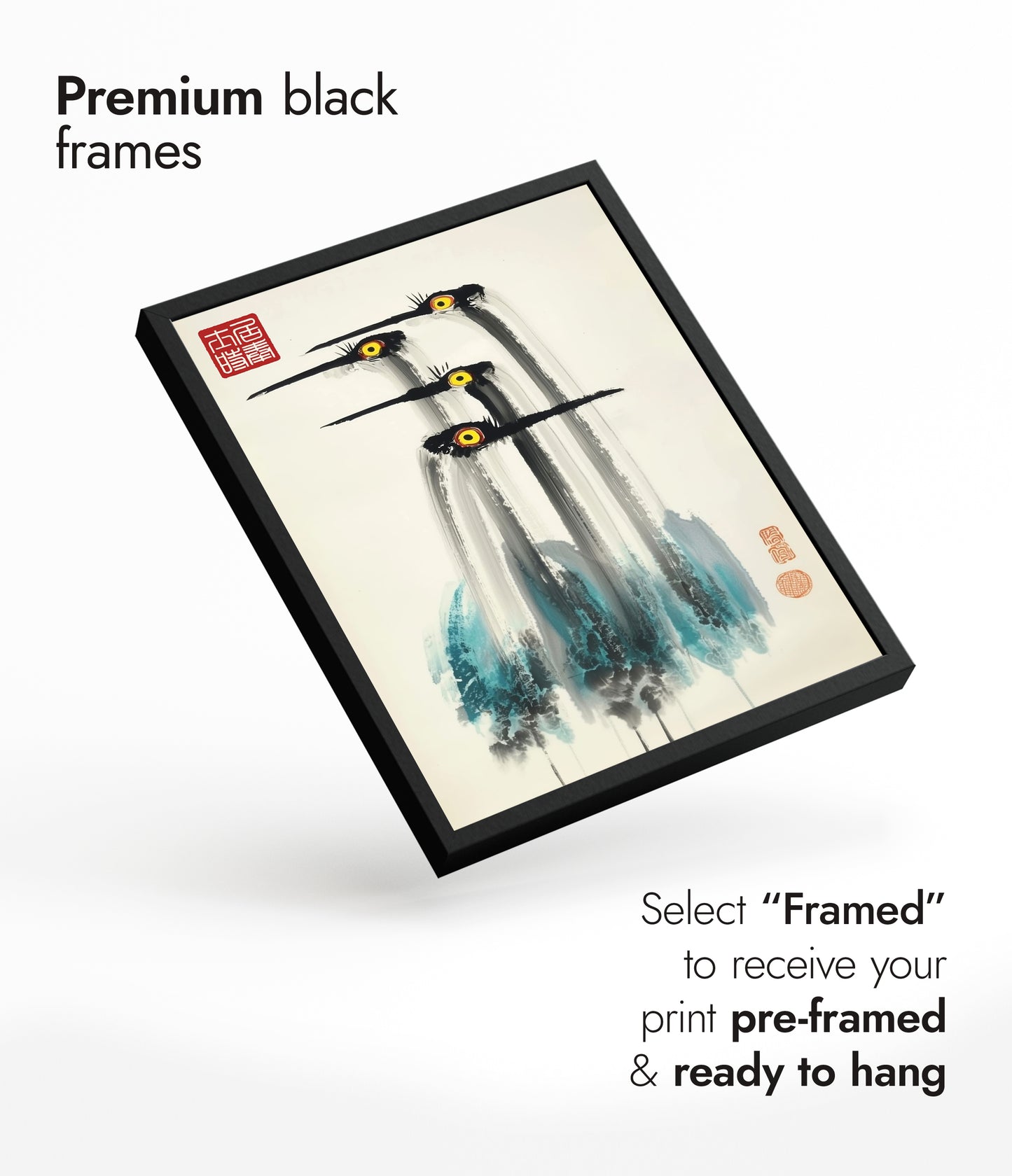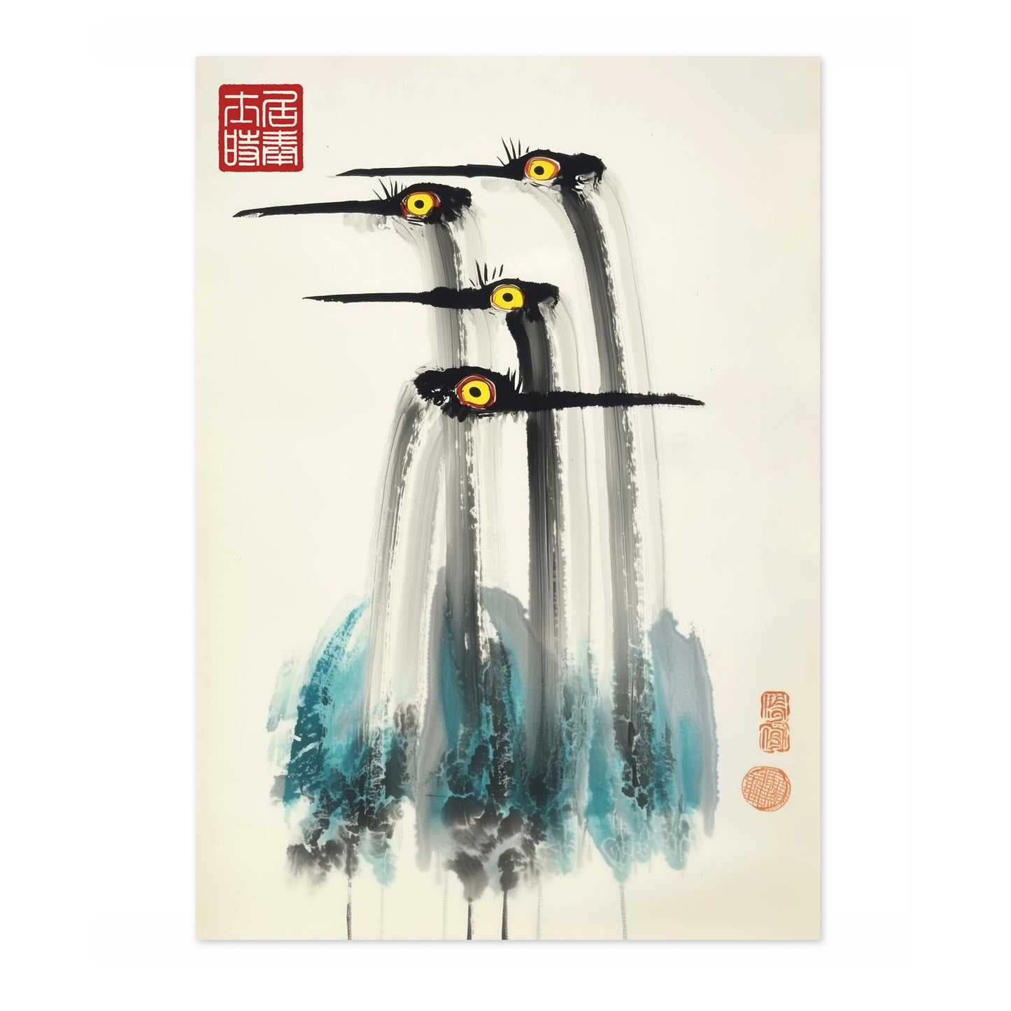 This "Cranes I" poster by Matsumoto Hoji features elegant cranes painted in a traditional Sumi-E style. The artwork showcases long-necked birds with striking yellow eyes, set against a soothing blue and beige backdrop. The minimalist brushwork captures the essence of Japanese nature and tranquility, making it a perfect piece for fans of Japanese art and animal themes.