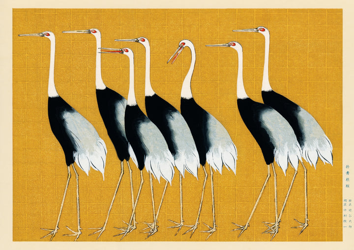 This stunning poster showcases "Cranes" by Ogata Korin, featuring a traditional Japanese woodblock design. The artwork depicts a stately line of cranes set against a rich golden background. Each bird is rendered with delicate precision, exuding elegance and poise. Perfect for adding a touch of classic Japanese art to any space. Ideal for bird and nature enthusiasts.