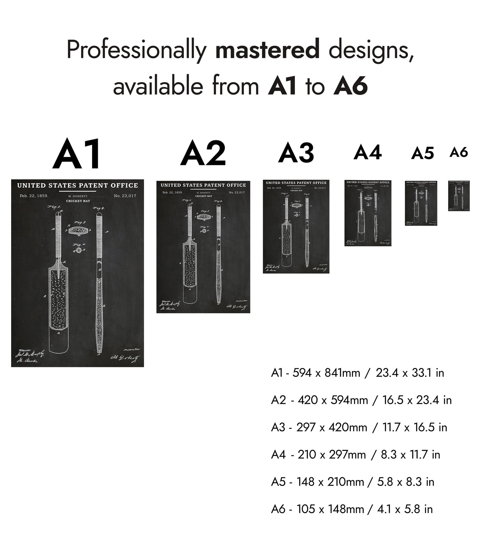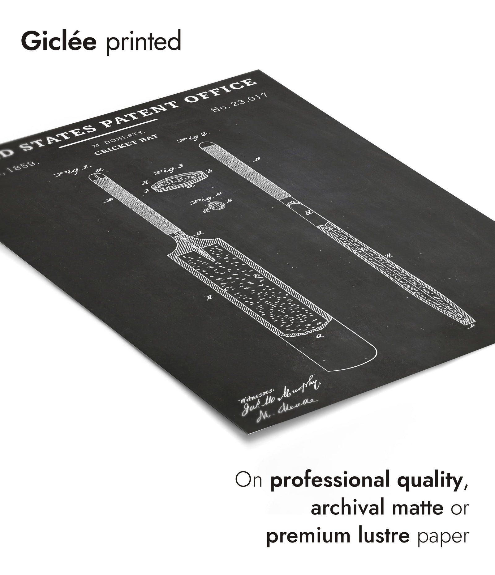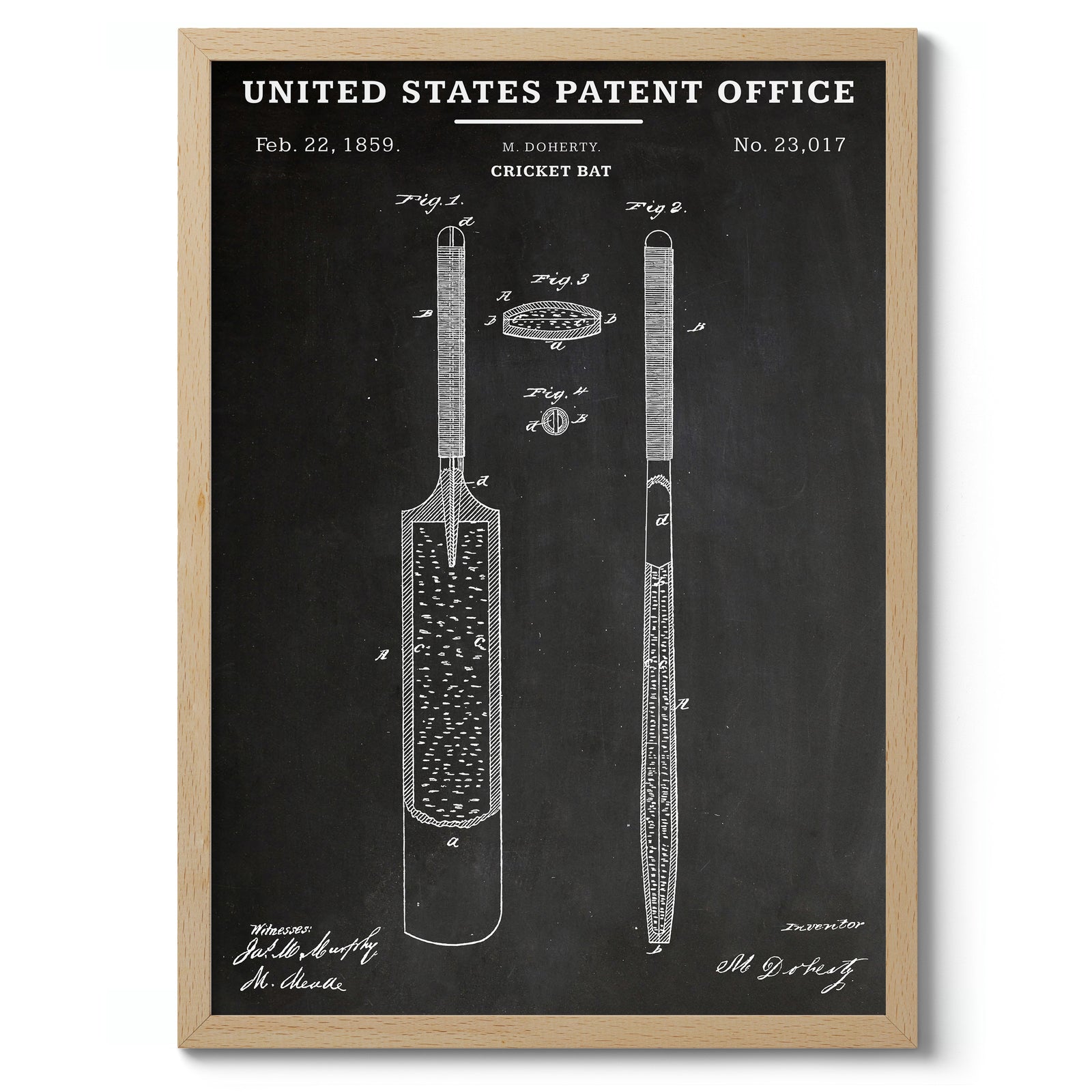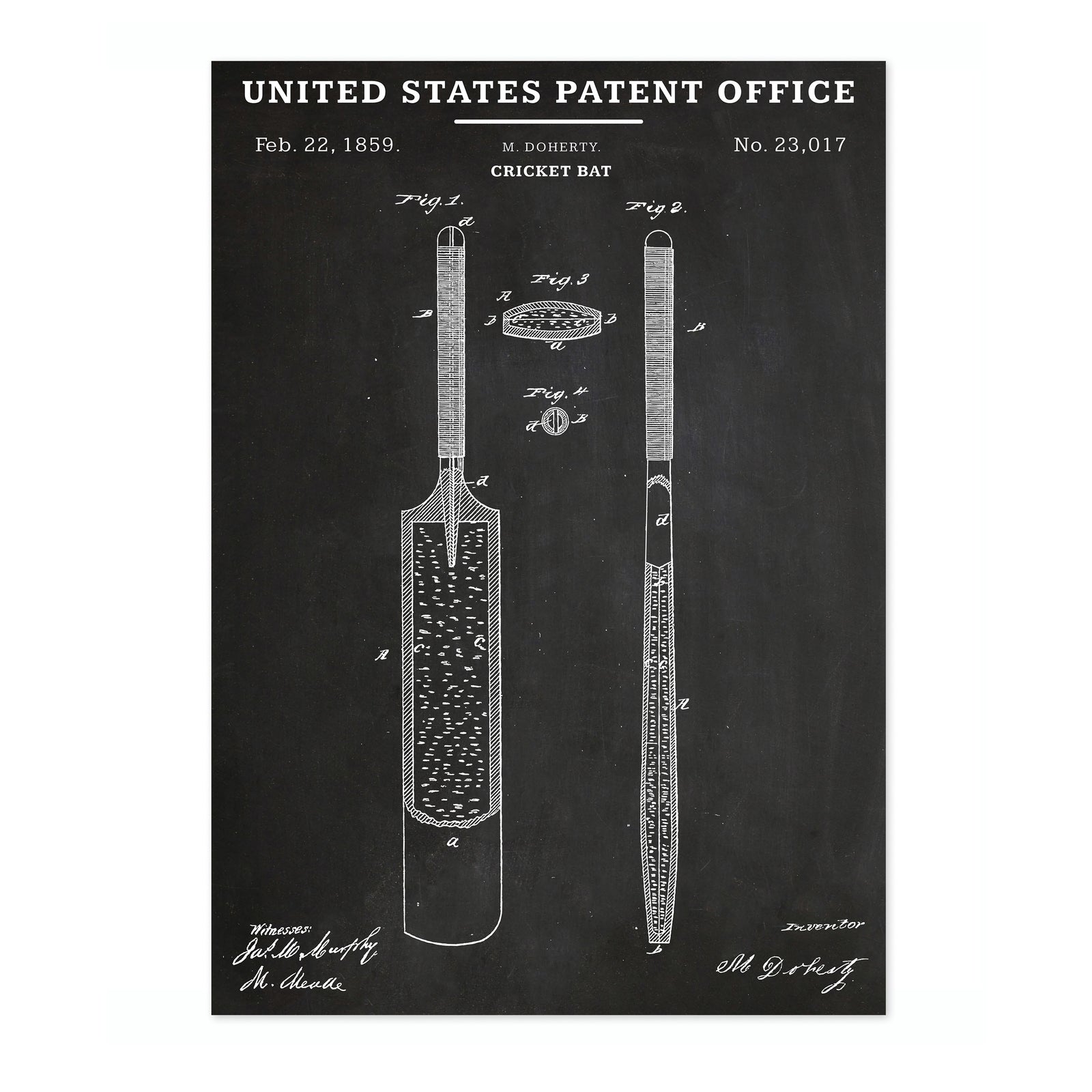 This vintage cricket bat patent poster features a detailed schematic from the United States Patent Office dated February 22, 1859. The black-and-white line art showcases the front and side views of the cricket bat, complemented by technical specifications and signatures. Ideal for sports enthusiasts, this illustration exudes a classic charm, blending athletic heritage with artistic design.