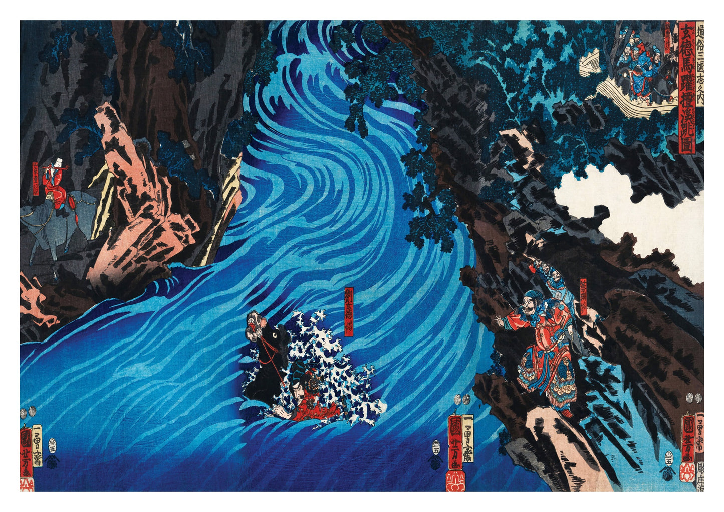 "Crossing Caoqi River on Horseback" by Utagawa Kuniyoshi depicts a dynamic scene with a rider bravely traversing turbulent blue waters. The traditional Japanese woodblock print showcases intricate details in the waves, forest, and figures. This poster captures the essence of Ukiyo-E, blending the motion of nature with human endeavor in a vibrant landscape format. Ideal for adding cultural depth to any space.