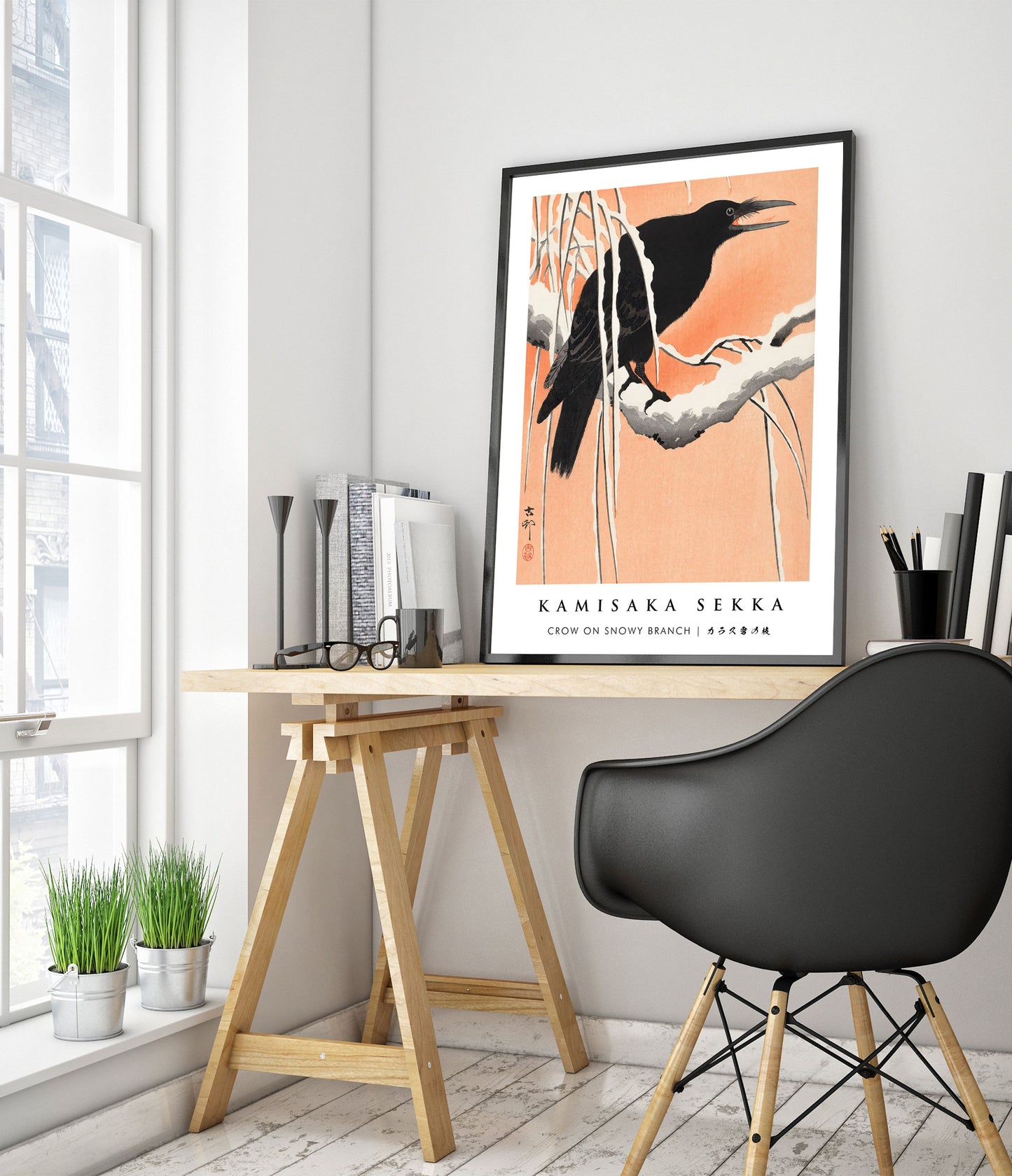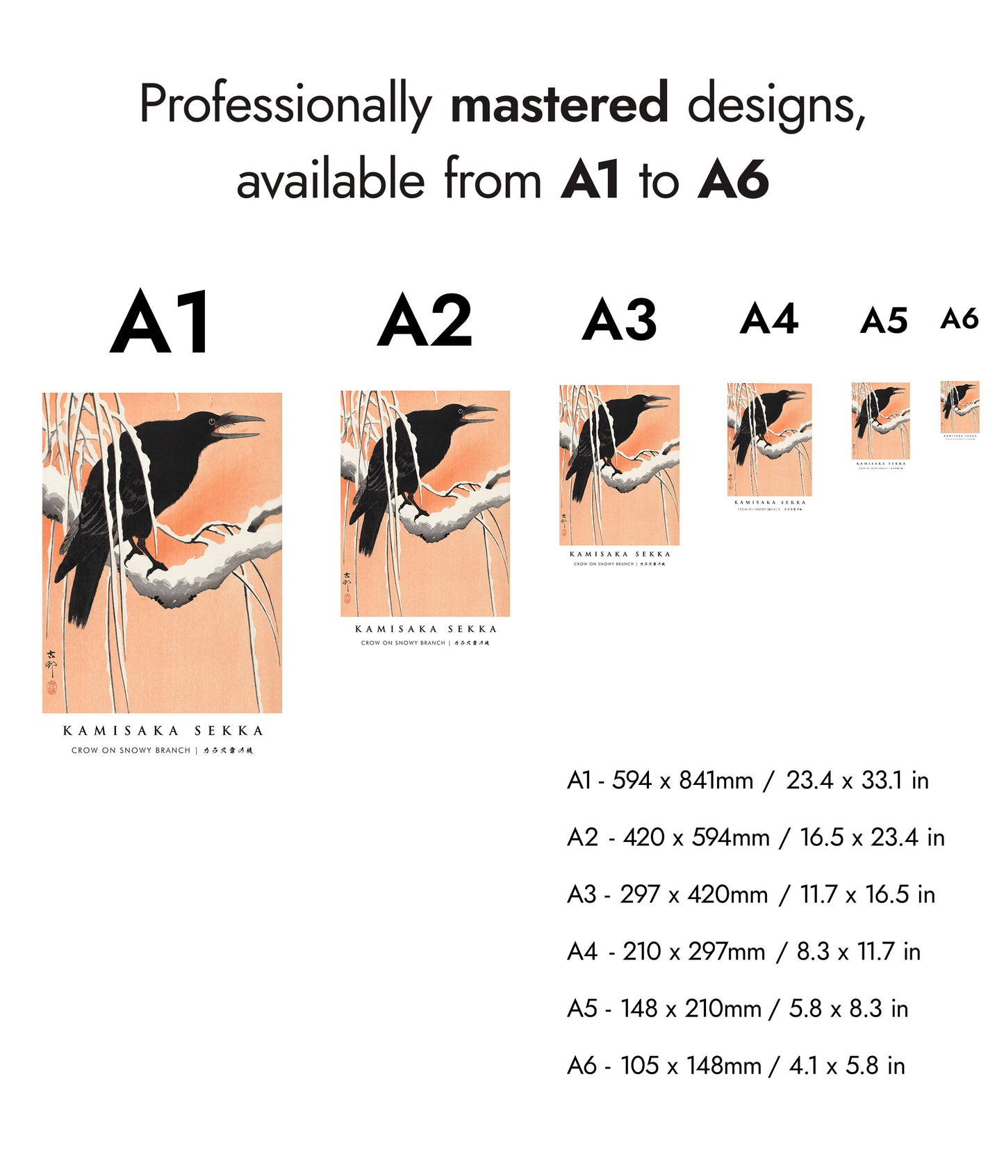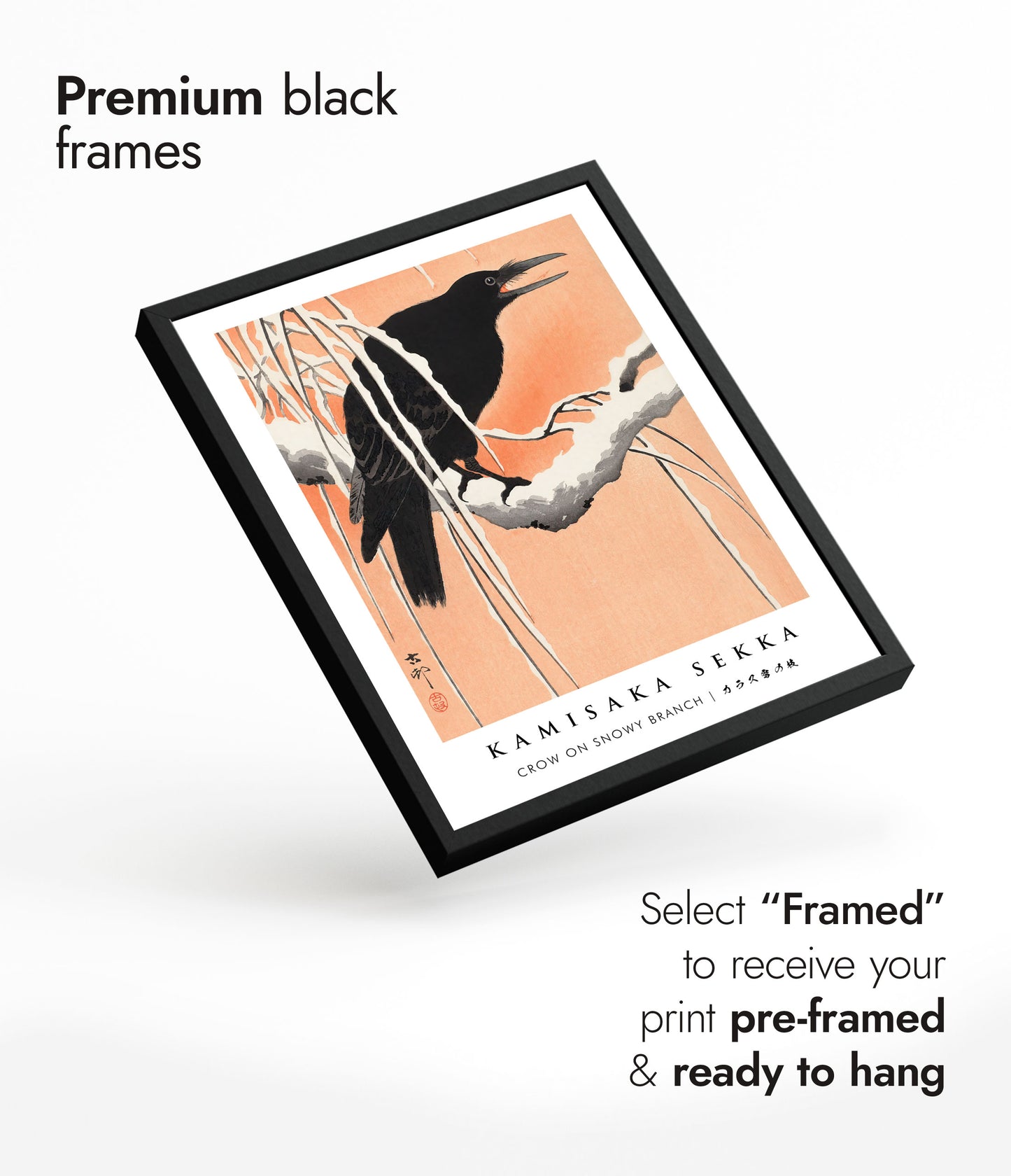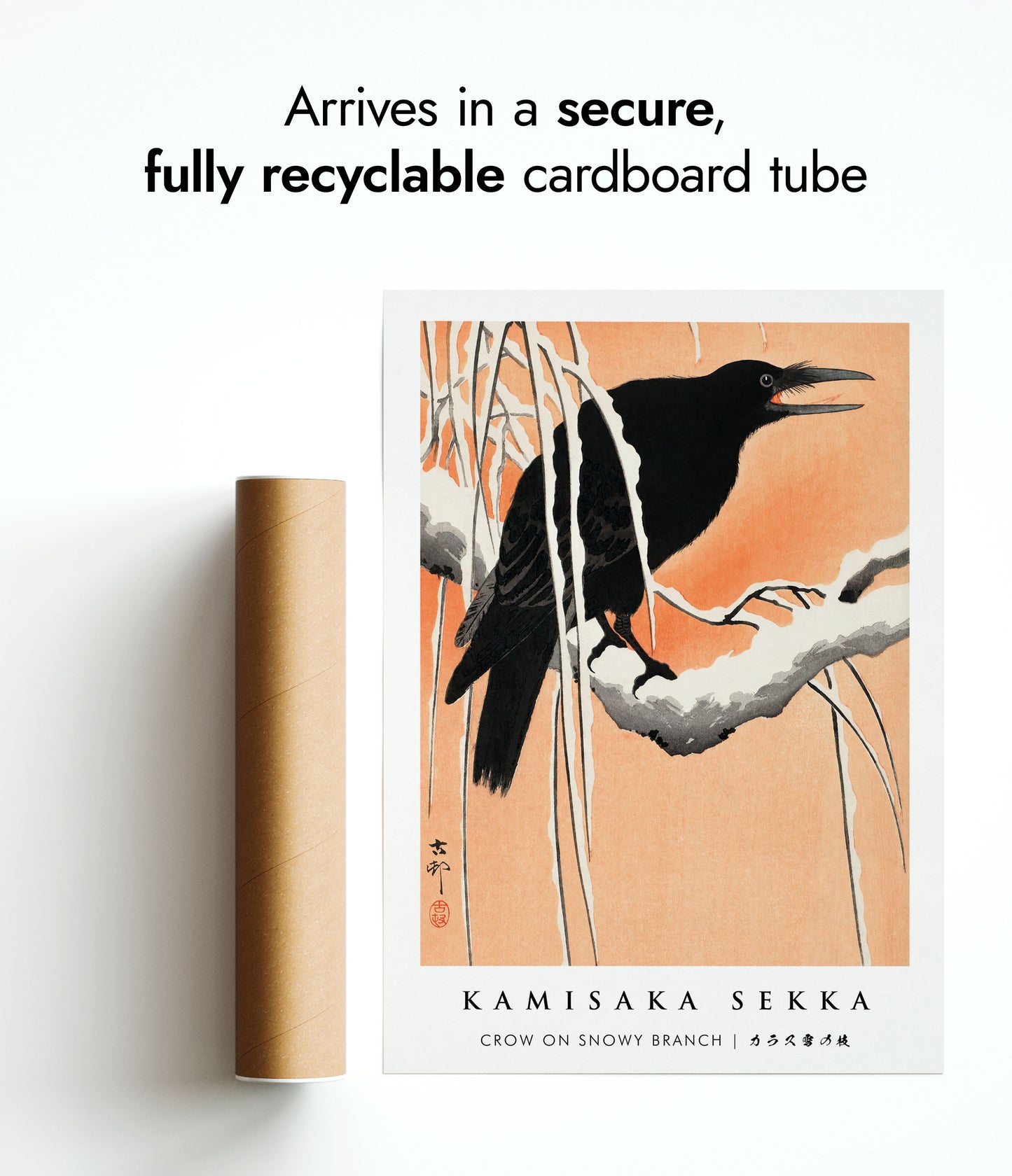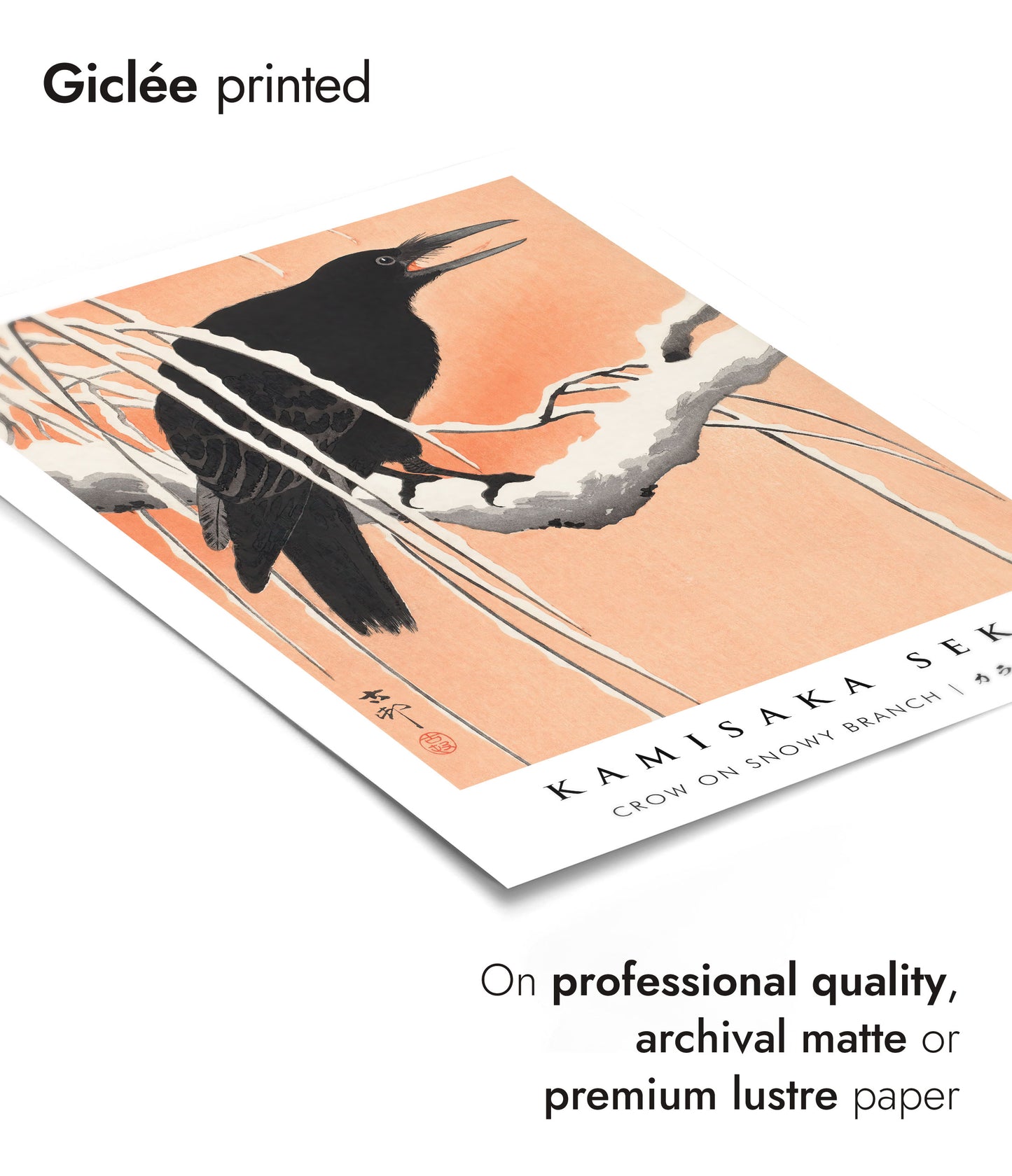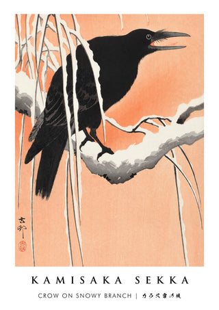 Capture the serene beauty of winter with "Crow on Snowy Branch" by Kamisaka Sekka. This traditional woodblock poster features a crow perched on a snow-laden branch, set against a warm, peach-hued background. The delicate contrast between the dark bird and the snowy scene accentuates the intricate details and serene atmosphere of Japanese art. Ideal for adding a touch of elegance to any space.