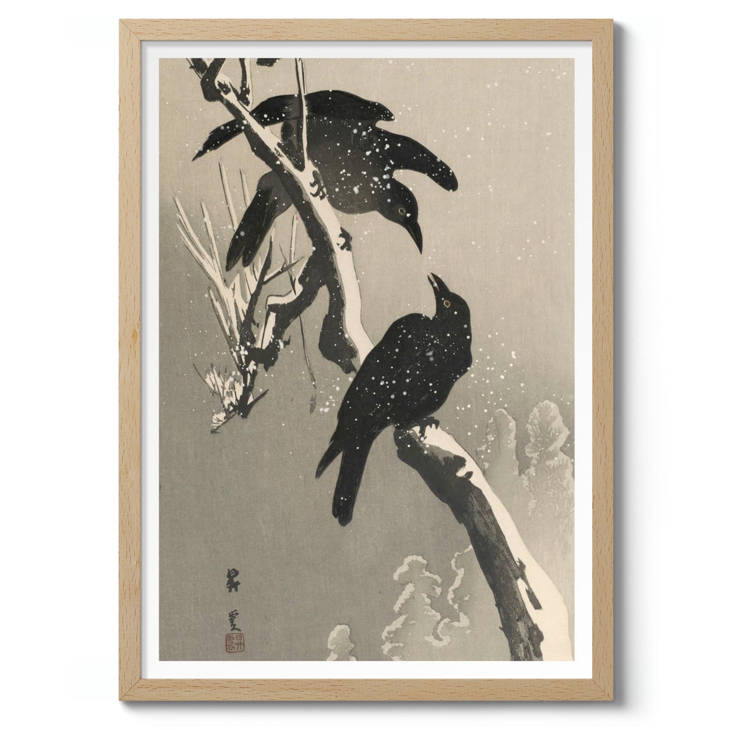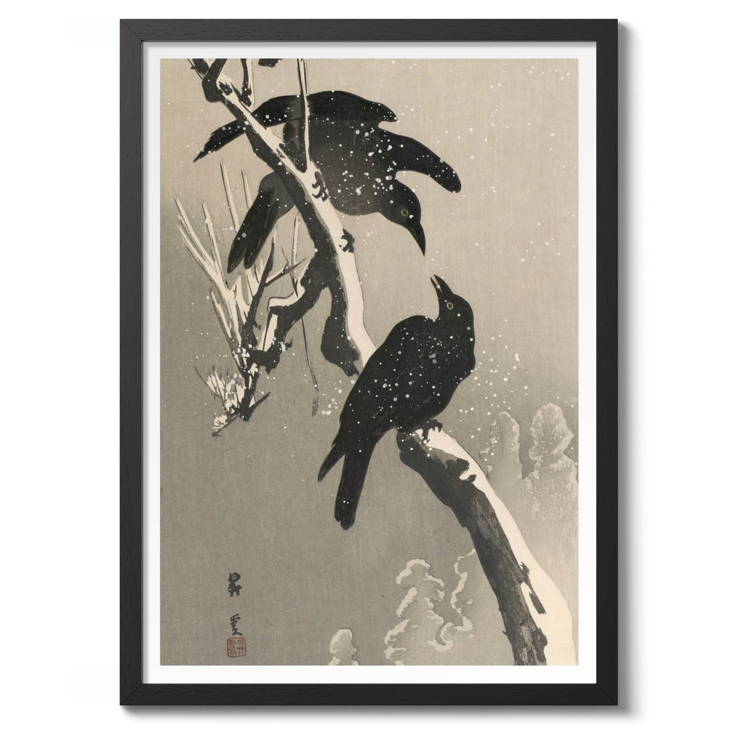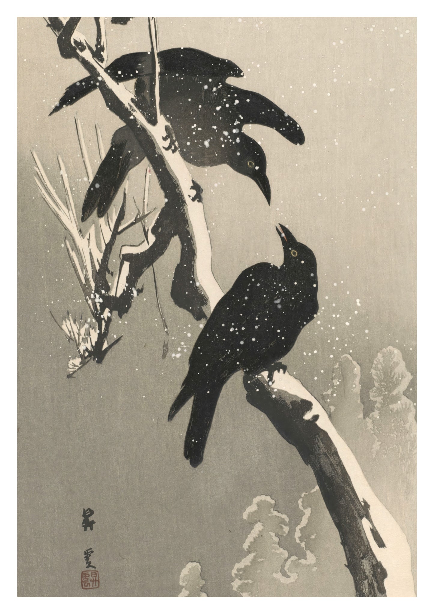 This Japanese woodblock poster by Yamamoto Shoun, created in 1906, features two crows perched on snow-covered branches. Illustrating the stark contrast between the crows' dark plumage and the muted winter landscape, this artwork embodies the Shin-Hanga and Ukiyo-E styles. Delicate snowfall adds a serene yet chilly atmosphere, capturing a moment of tranquility amid a wintry backdrop.
