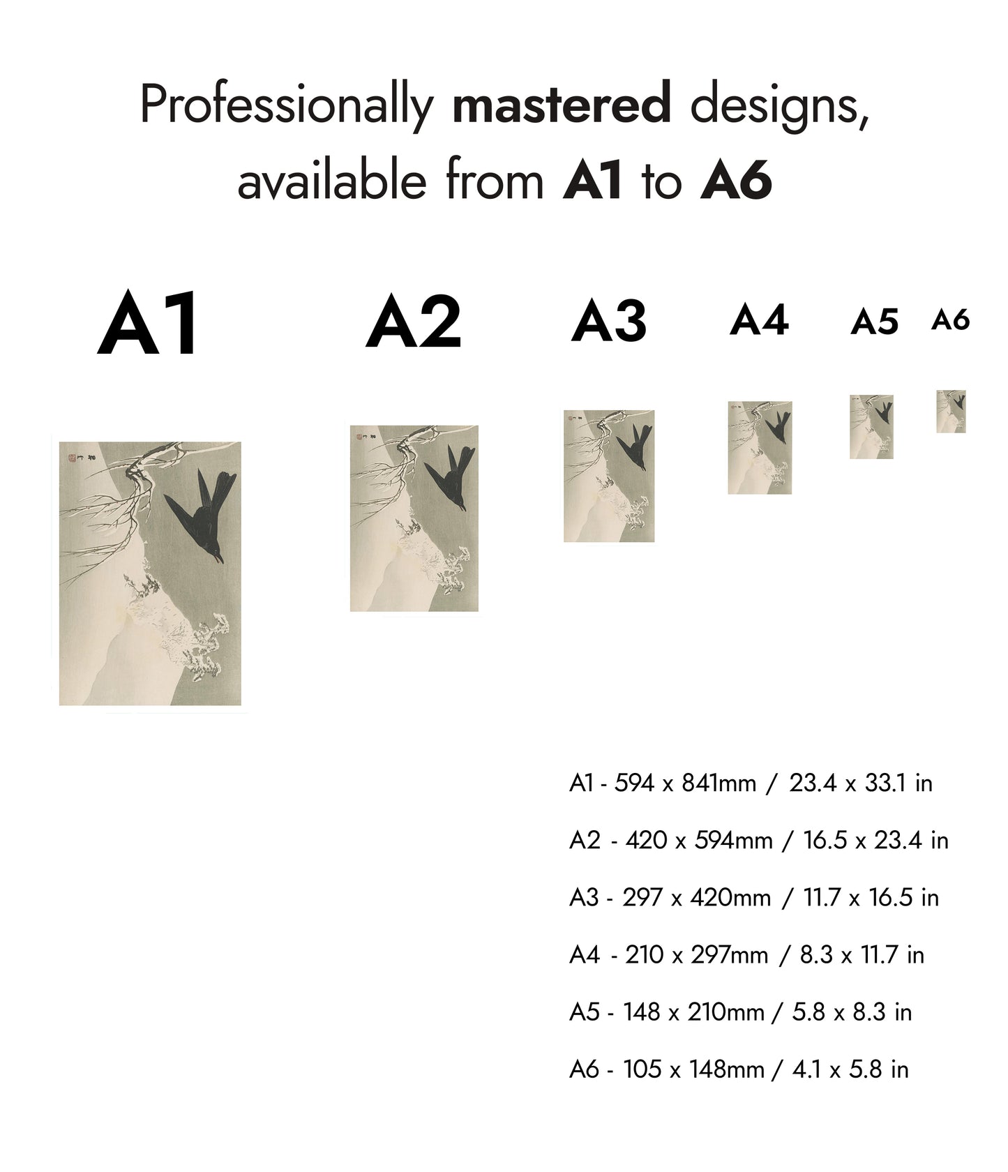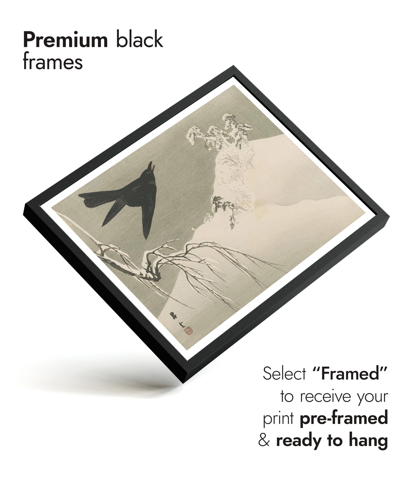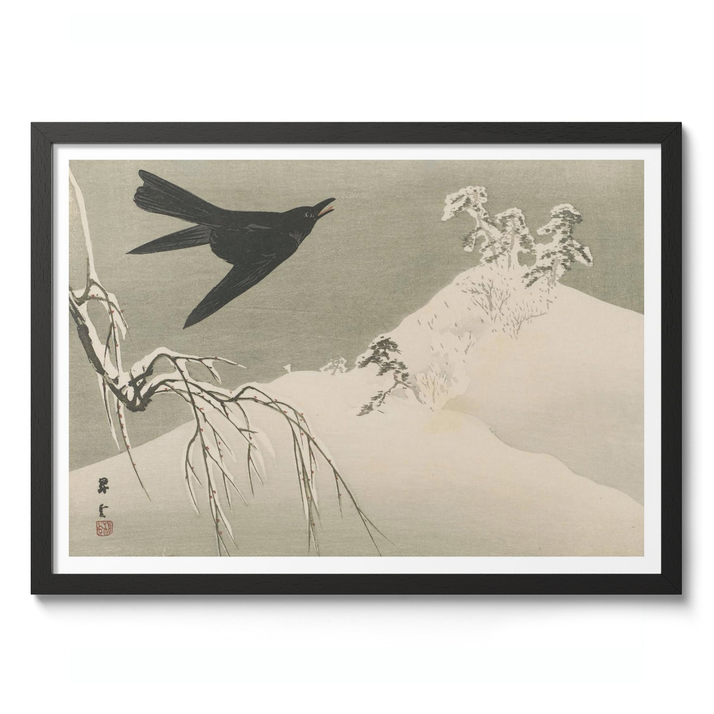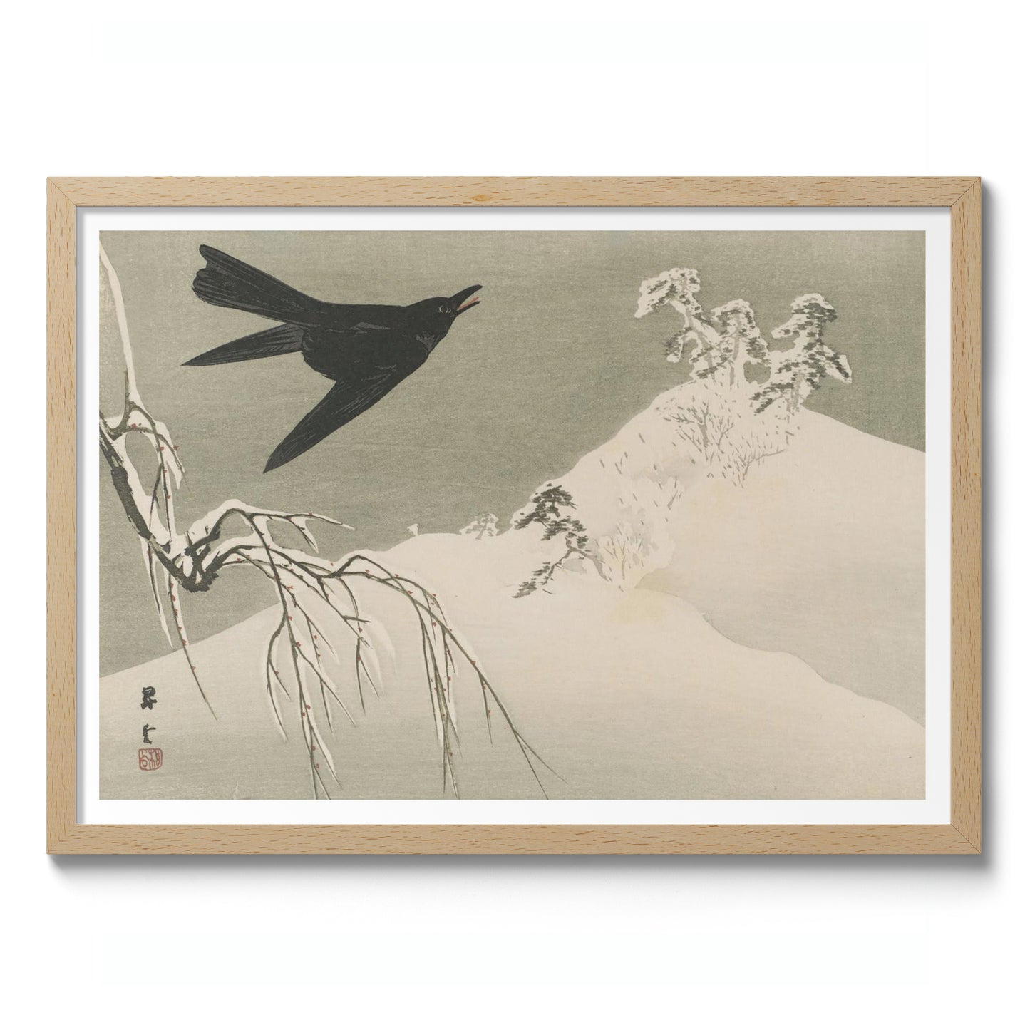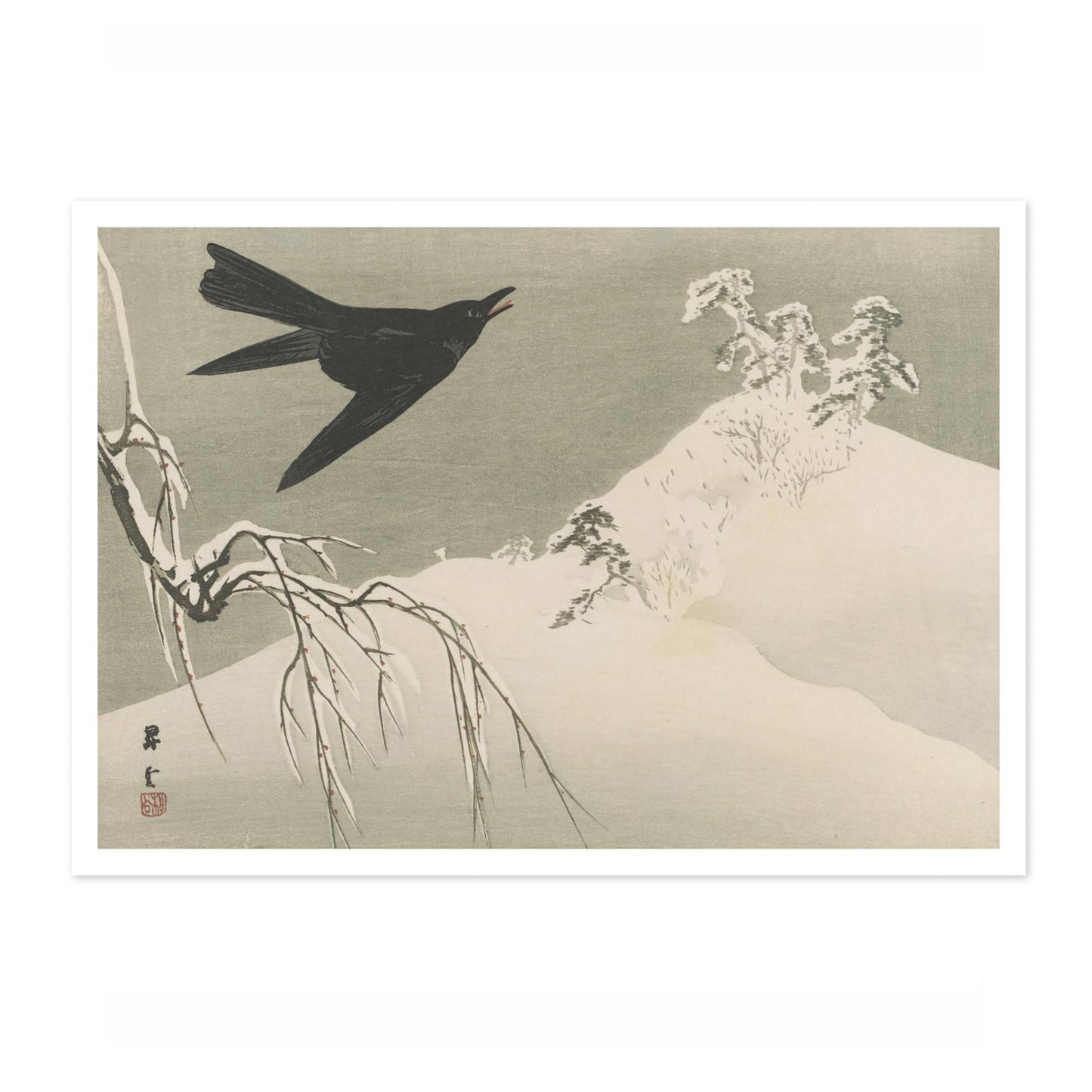 Yamamoto Shoun's "Crows in Snow" is a captivating traditional Japanese woodblock print featuring a crow soaring through a serene winter landscape. The muted beige, grey, and white tones create a tranquil scene, with delicate snow-laden branches and a gentle mountain slope. This artwork, reflecting Shin-Hanga and Ukiyo-E styles, beautifully captures the stark elegance of winter. Ideal as a sophisticated poster choice.