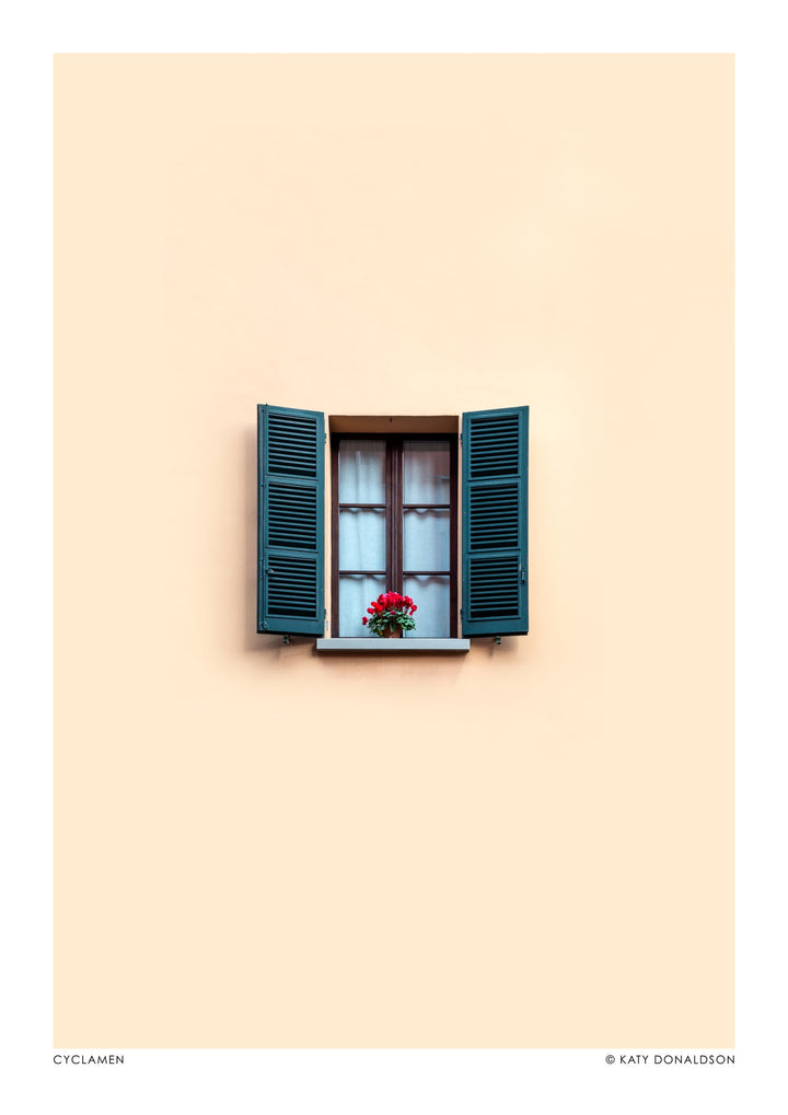 The "Cyclamen" poster by Katy Donaldson captures a striking minimalist photograph of a lone window with teal shutters against a soft beige wall. A vibrant red cyclamen plant on the windowsill adds a pop of colour, creating a modern and serene composition. This photographic artwork embodies simplicity and elegance, making it a perfect addition to contemporary interior spaces.