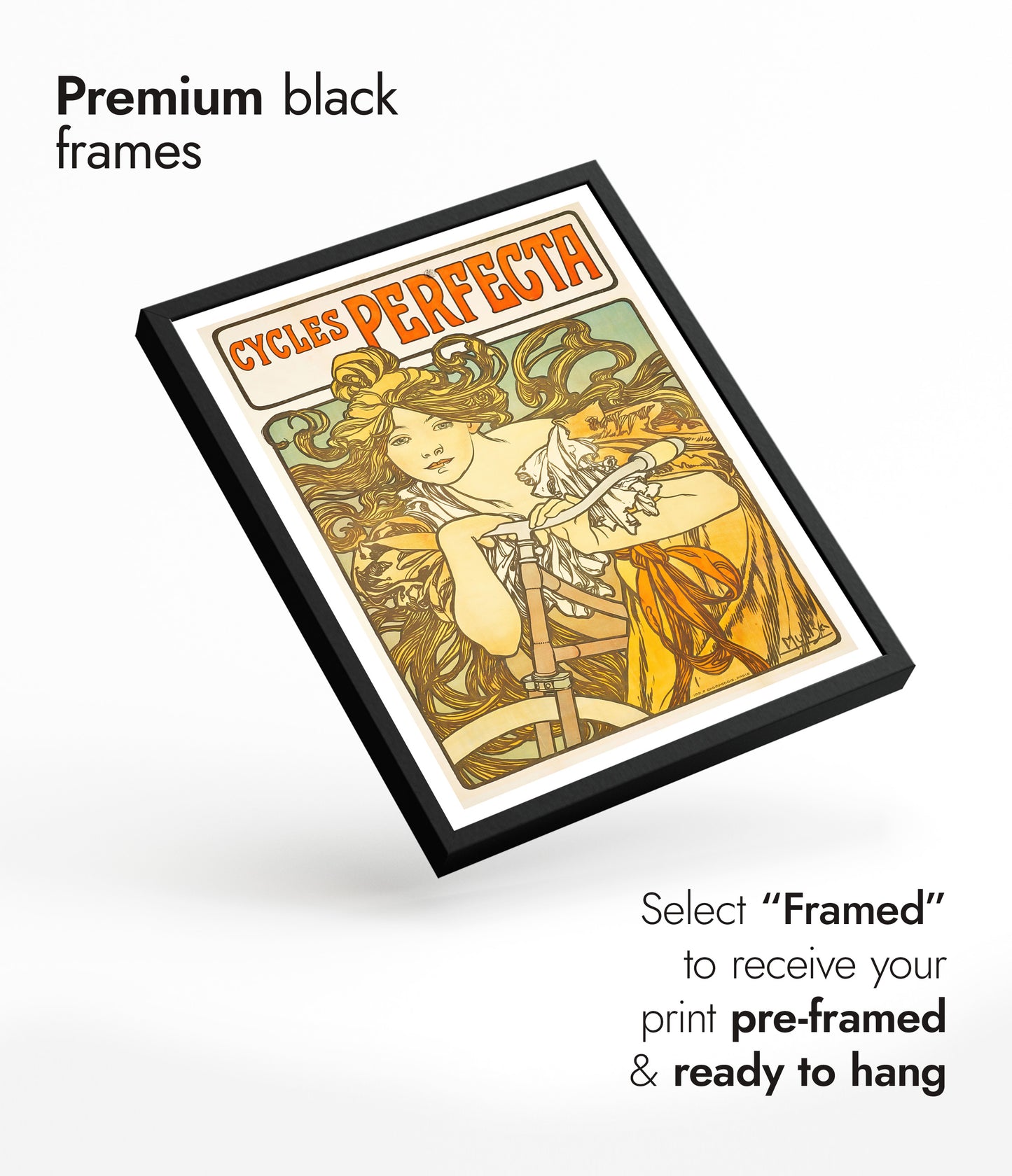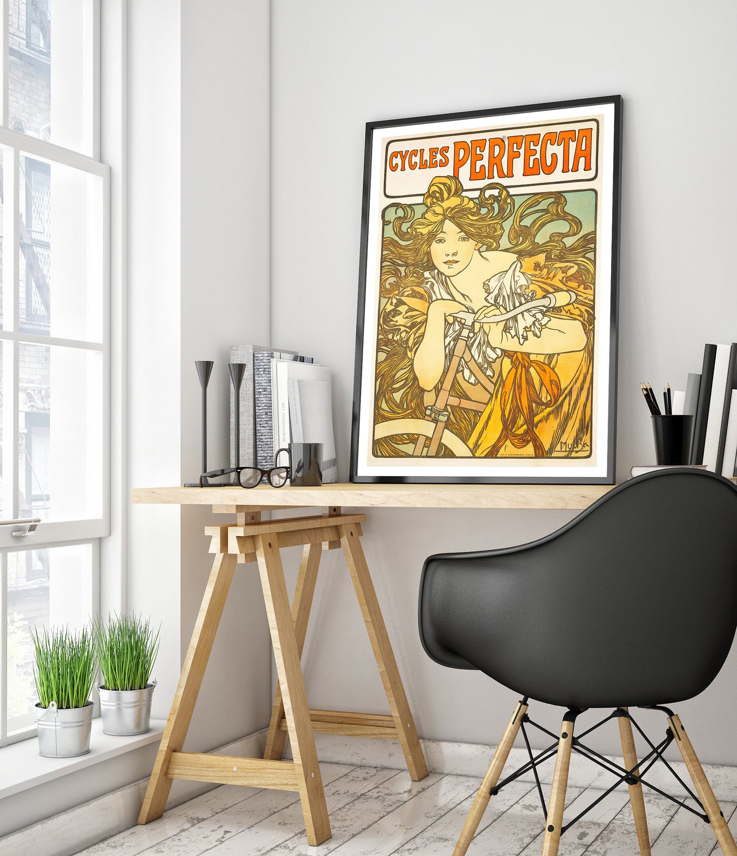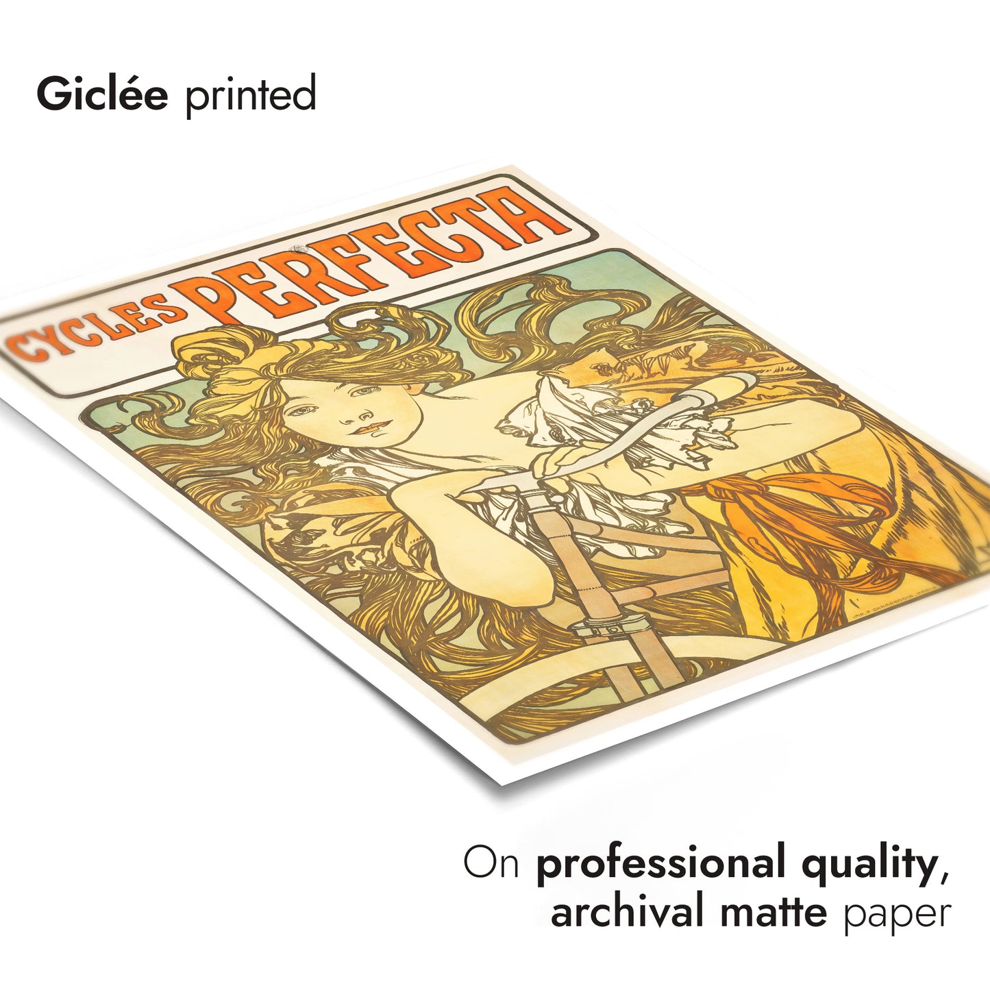 This "Cycles Perfecta" vintage poster by Alphonse Mucha showcases an Art Nouveau illustration of a woman with flowing hair and intricate clothing, holding a bicycle. The artwork features rich, earthy tones with detailed floral elements, capturing the elegance and intricacy typical of Mucha's style. Ideal for adding a touch of classic sophistication to any space.