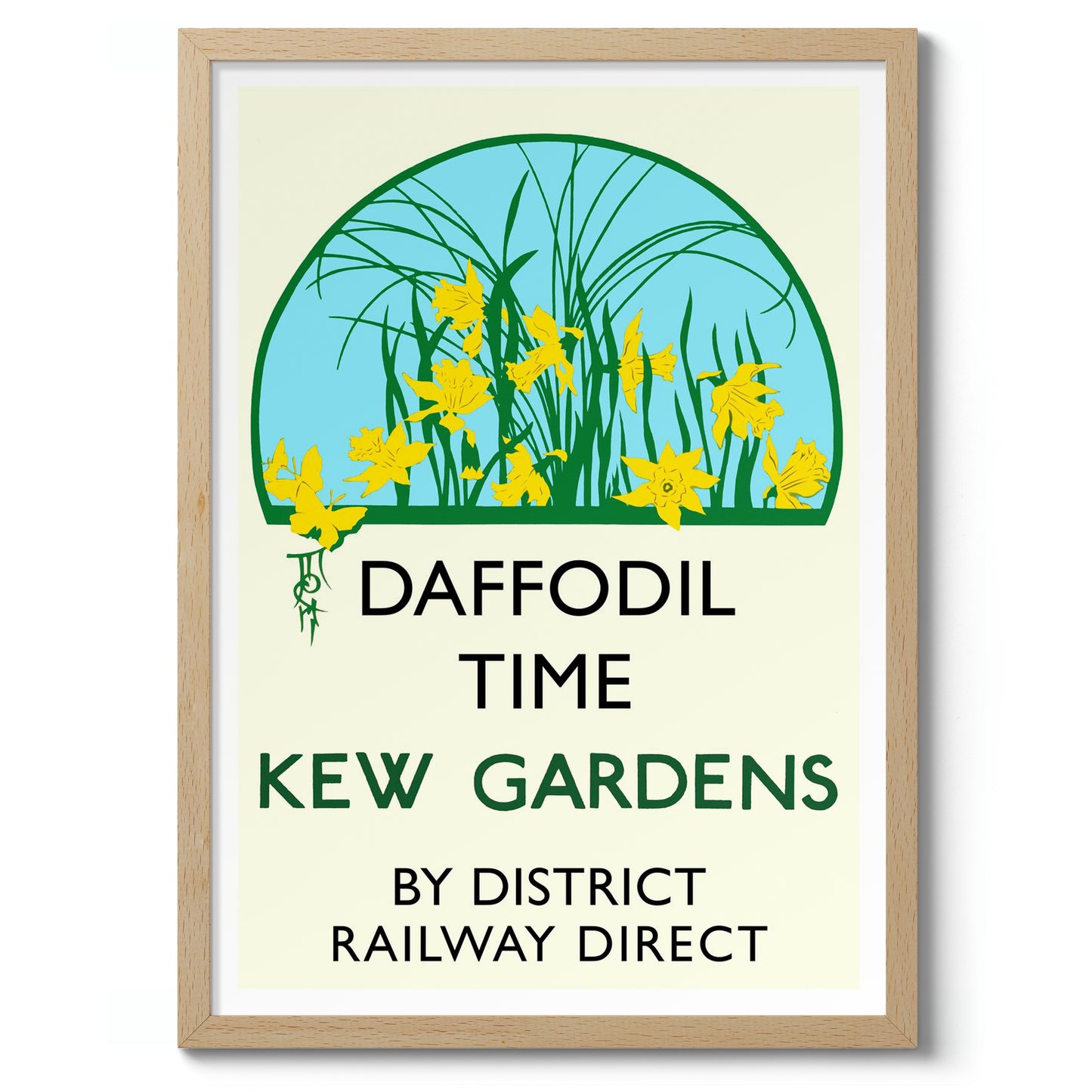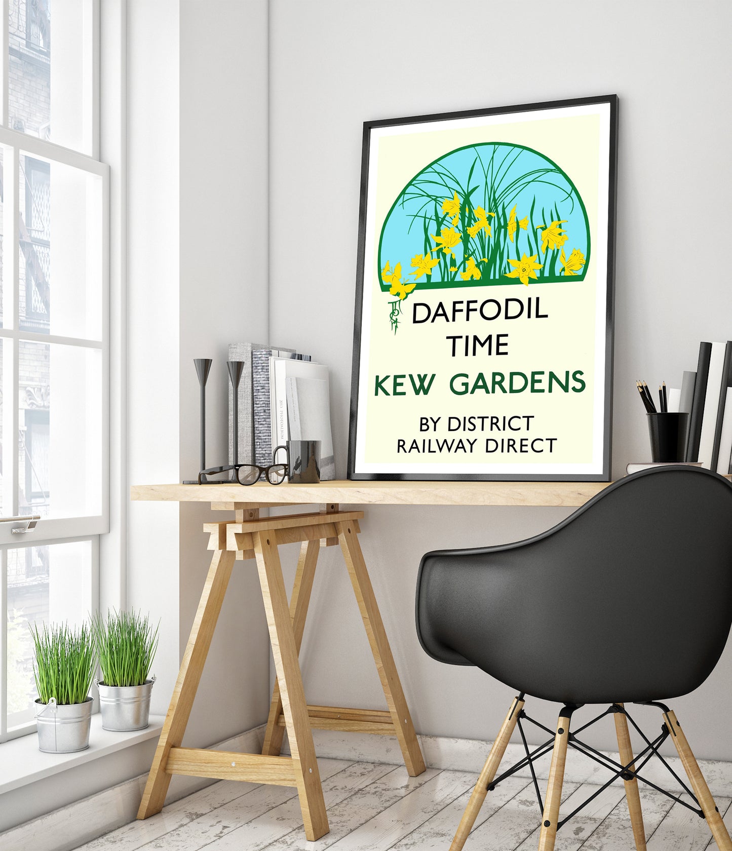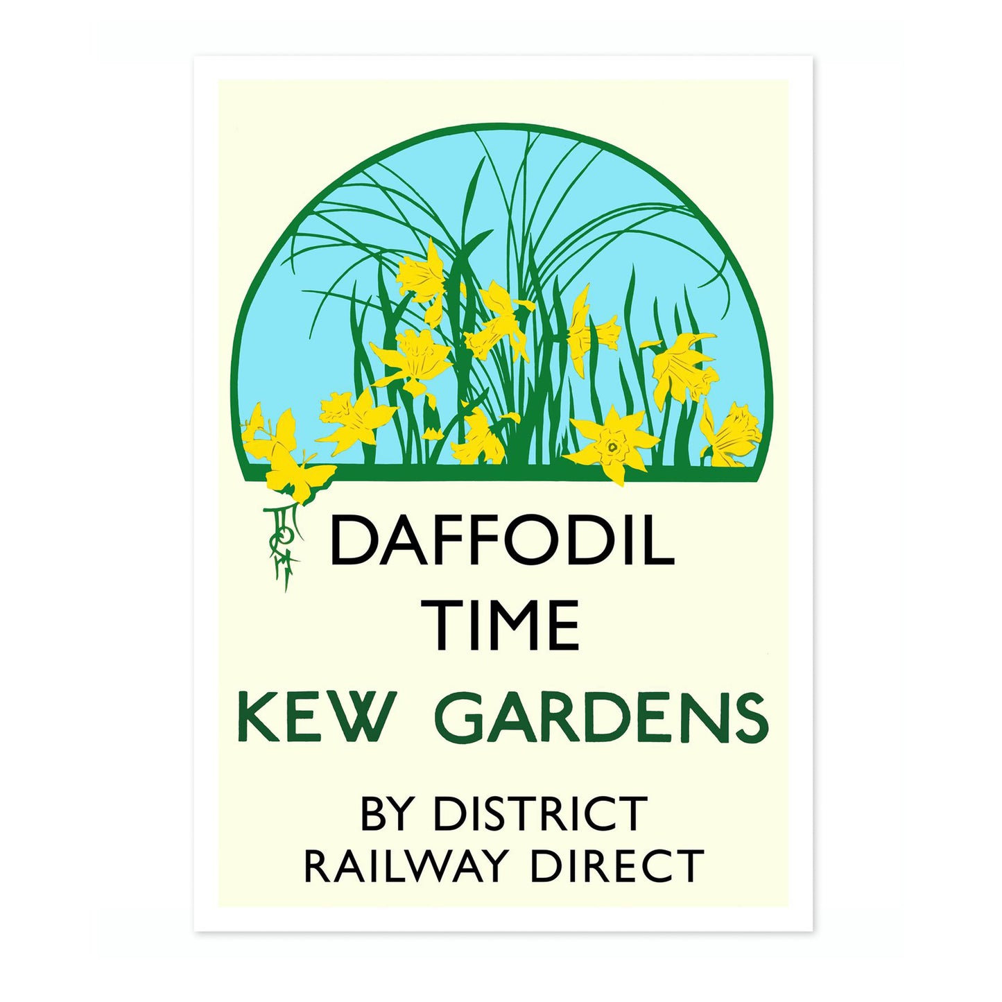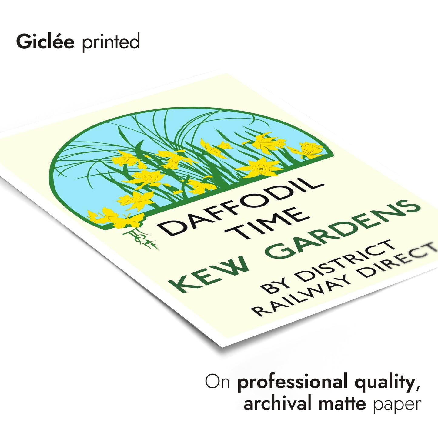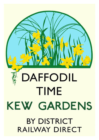 This vintage-style poster titled "Daffodil Time, Kew Gardens" beautifully illustrates vibrant yellow daffodils swaying amidst lush green grass. The bold lettering and arching design above evoke a sense of nostalgia, capturing the essence of a timeless journey to London's iconic Kew Gardens via direct railway. Perfect for those who appreciate classic travel illustrations and love botanical-themed art.