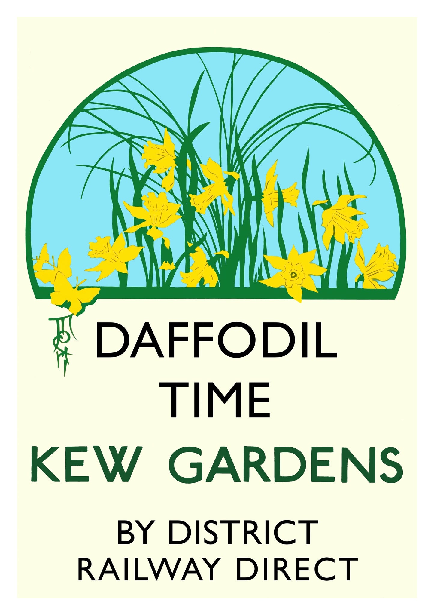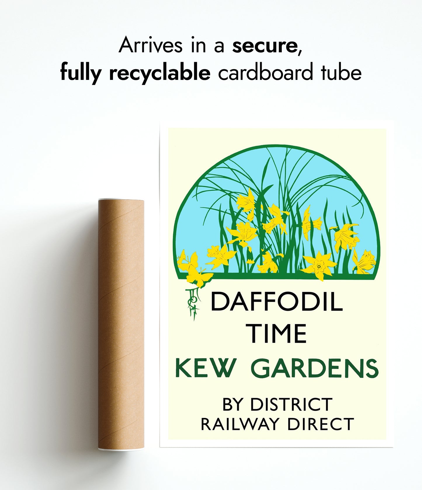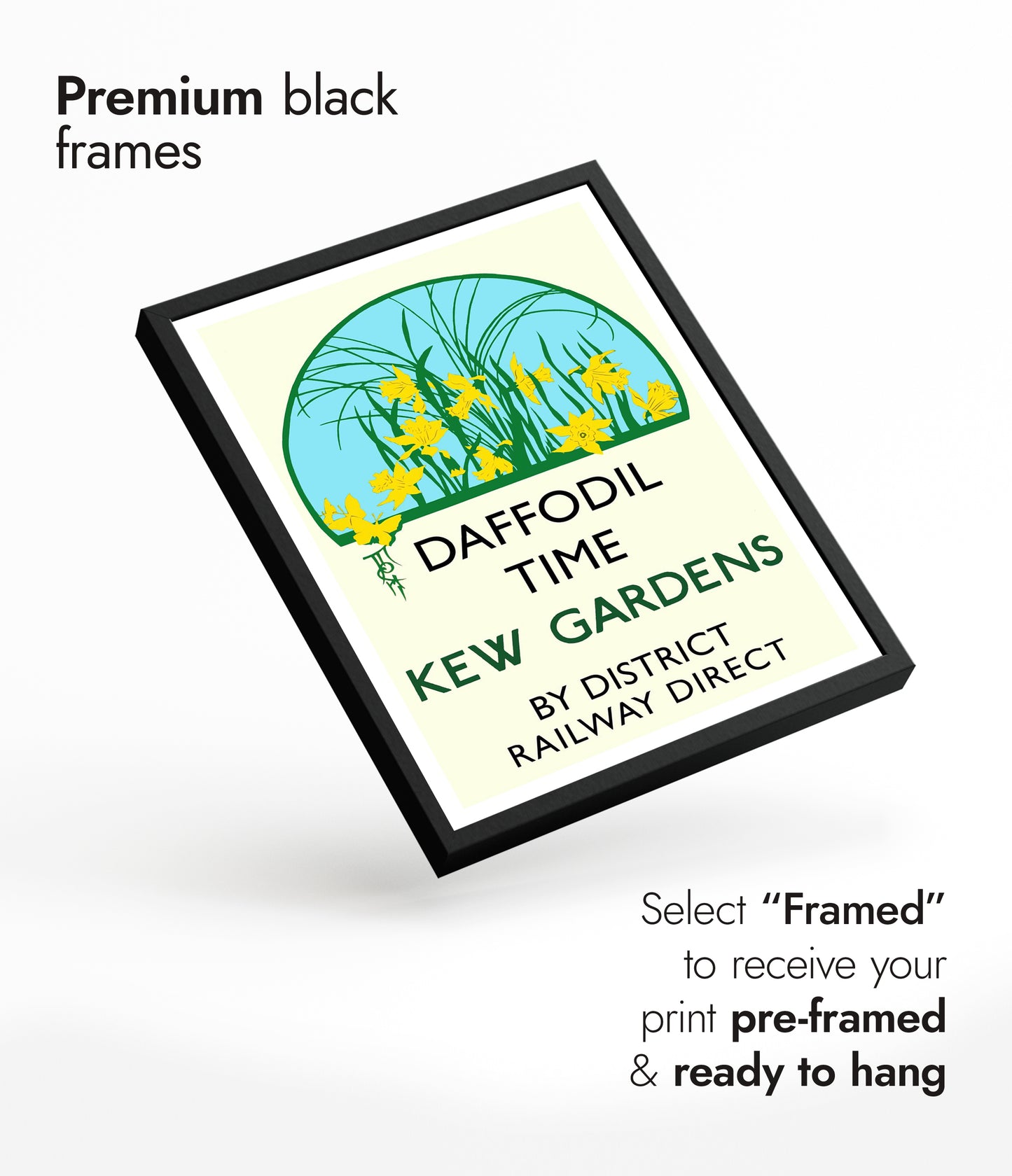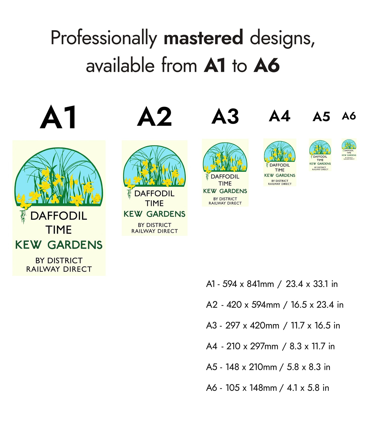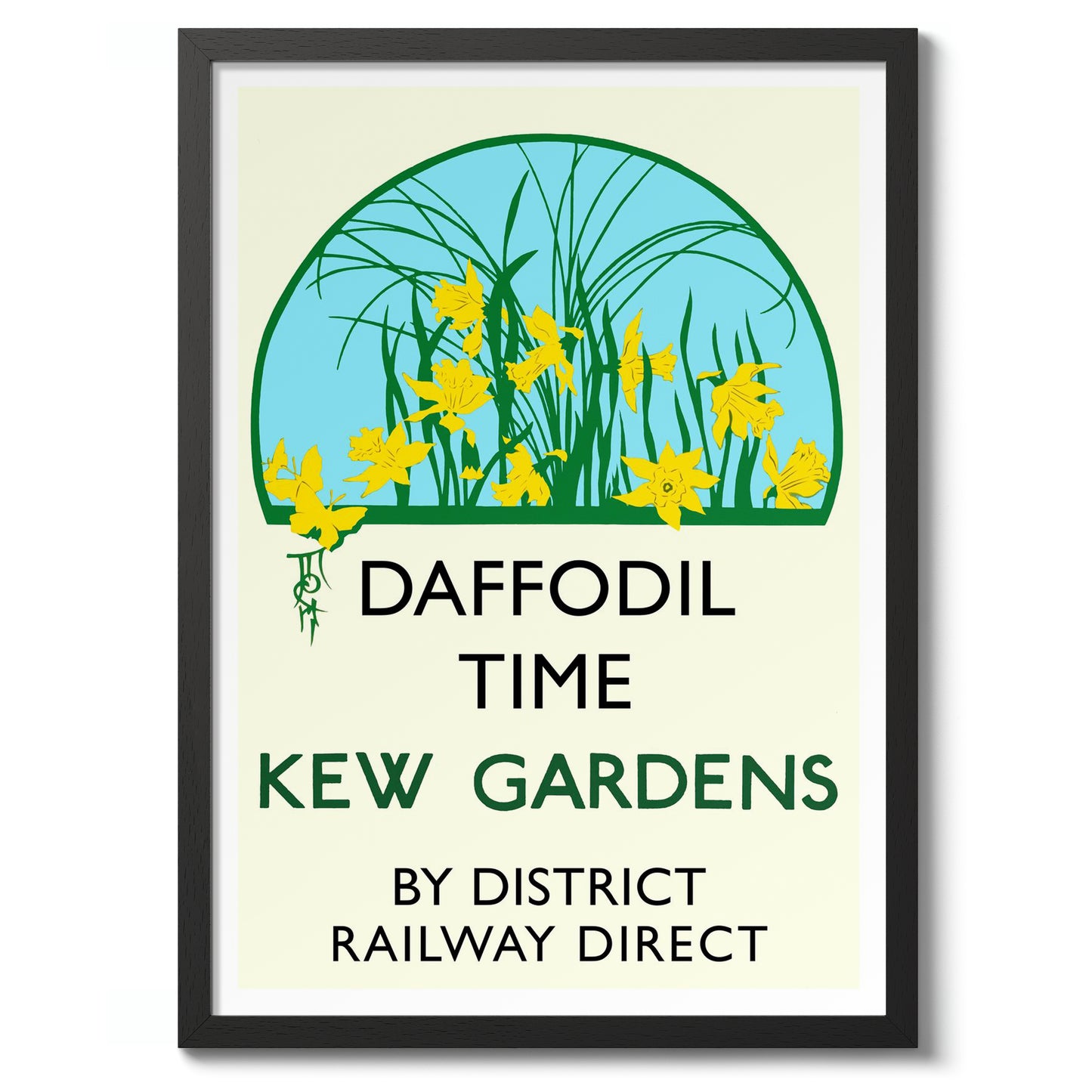 This vintage-style poster titled "Daffodil Time, Kew Gardens" beautifully illustrates vibrant yellow daffodils swaying amidst lush green grass. The bold lettering and arching design above evoke a sense of nostalgia, capturing the essence of a timeless journey to London's iconic Kew Gardens via direct railway. Perfect for those who appreciate classic travel illustrations and love botanical-themed art.