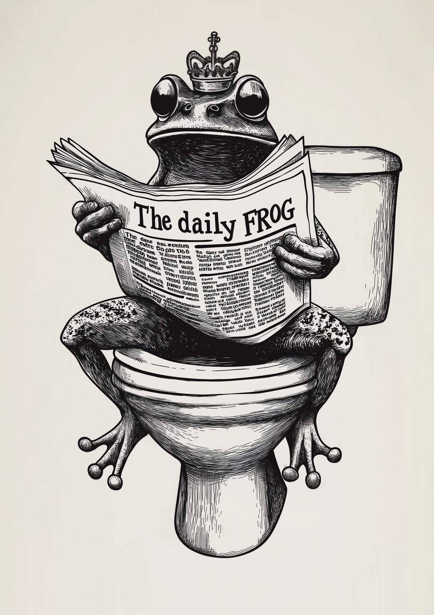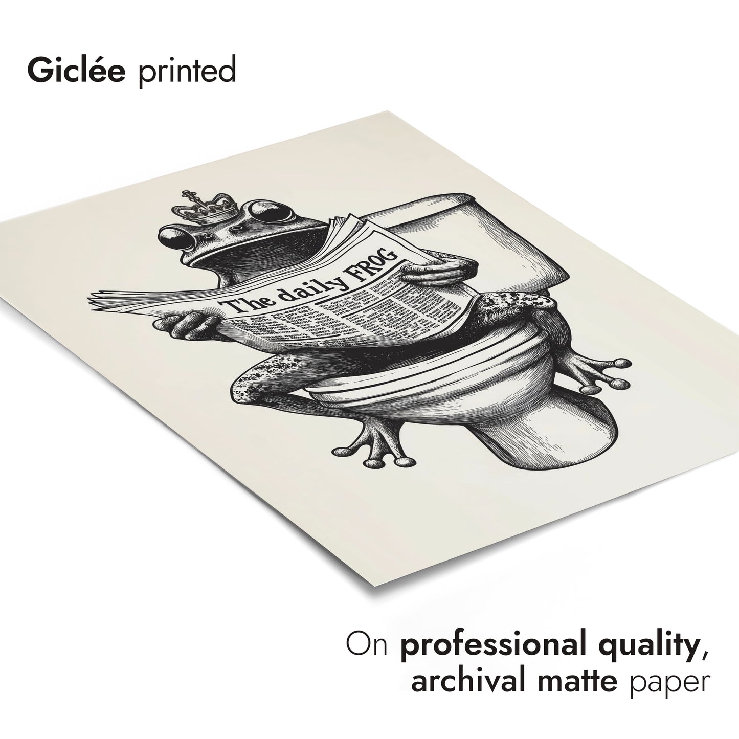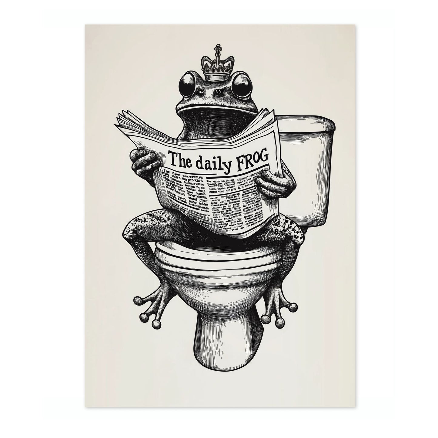 This humorous art print features a royal frog perched on a toilet, engrossed in "The Daily Frog" newspaper. The monochrome illustration blends whimsical charm with a touch of satire, making it perfect for bathroom decor. The detailed linework and typographic elements add a playful and quirky vibe. Ideal for those seeking unique, fun, themed posters for their space.