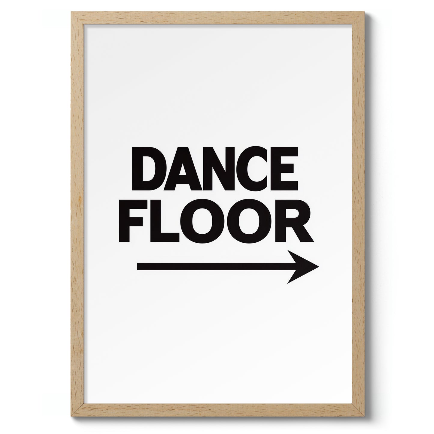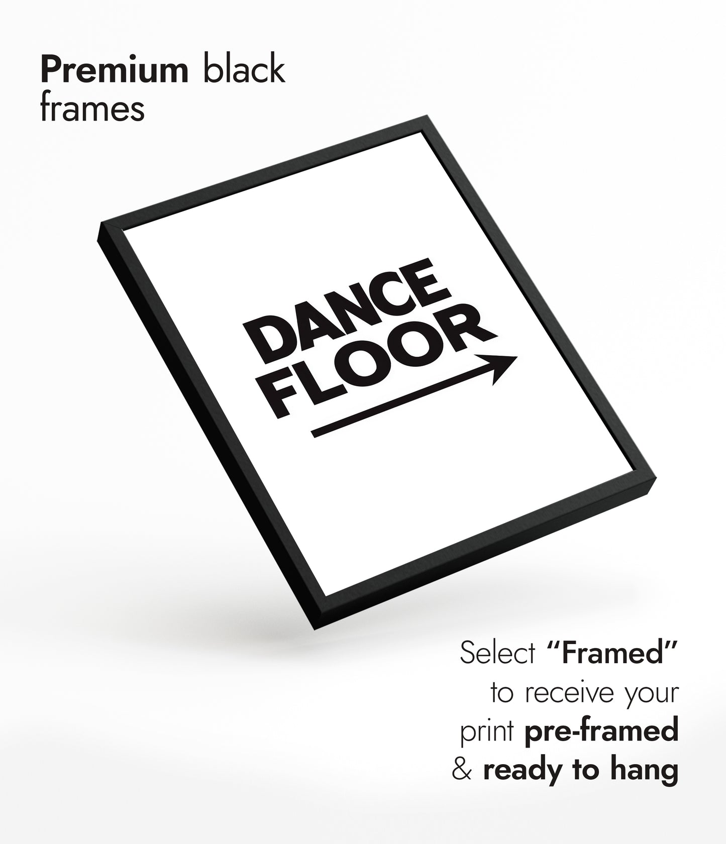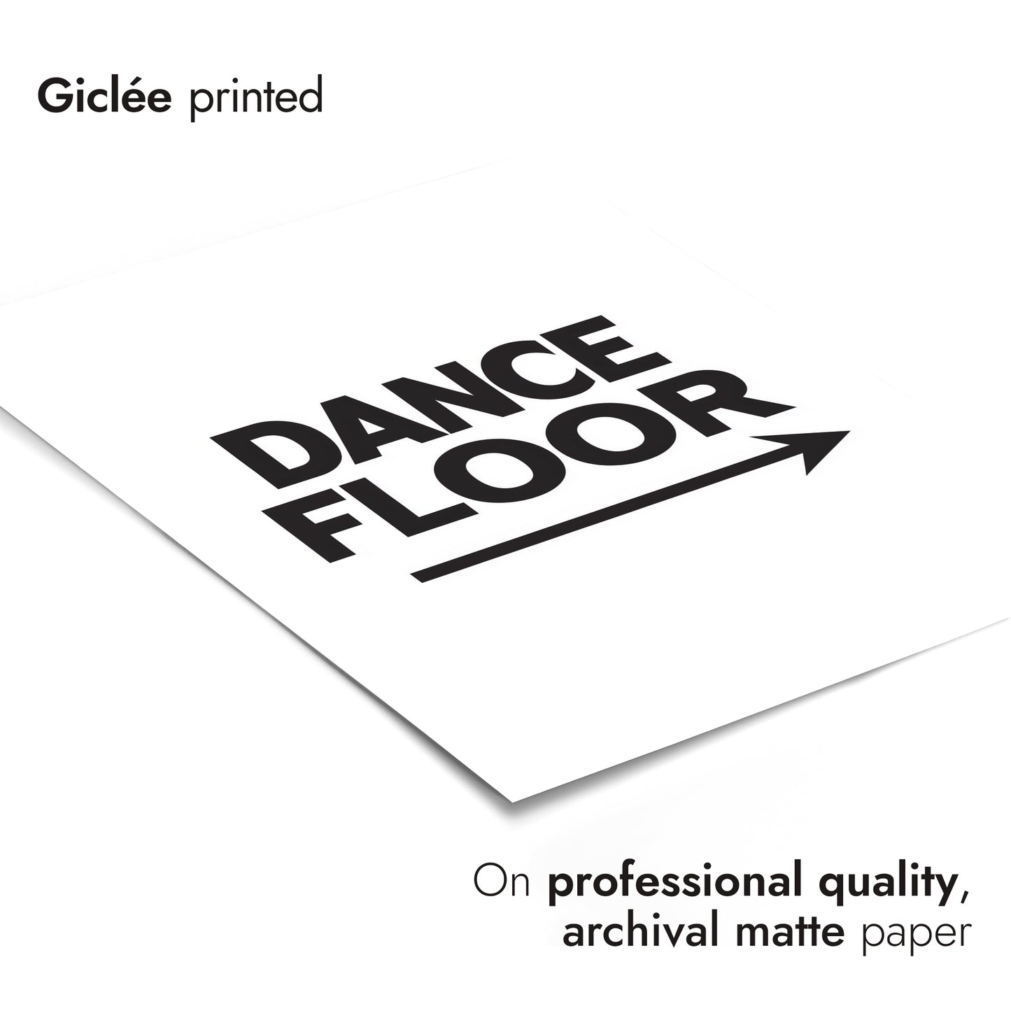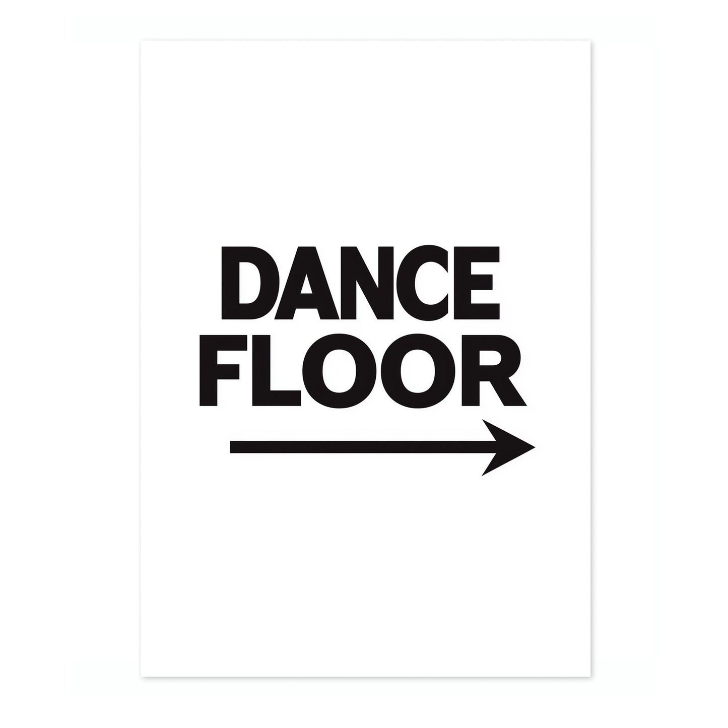The "Dance Floor This Way" poster features a bold, minimalist typography design in black and white. With the words "DANCE FLOOR" prominently displayed alongside a directional arrow, this artwork elegantly captures the energy and invitation of the dance scene. Perfect for those who appreciate typographic art, it adds a dynamic touch to any space.