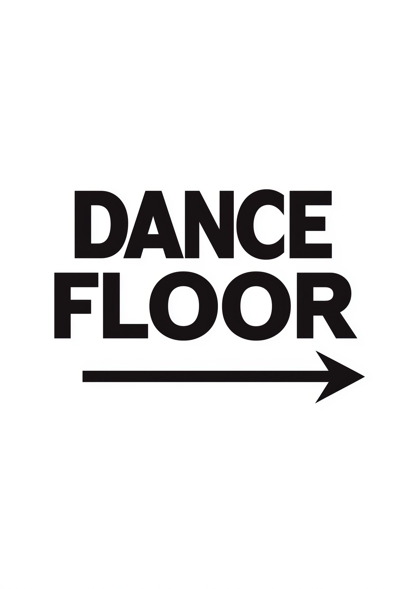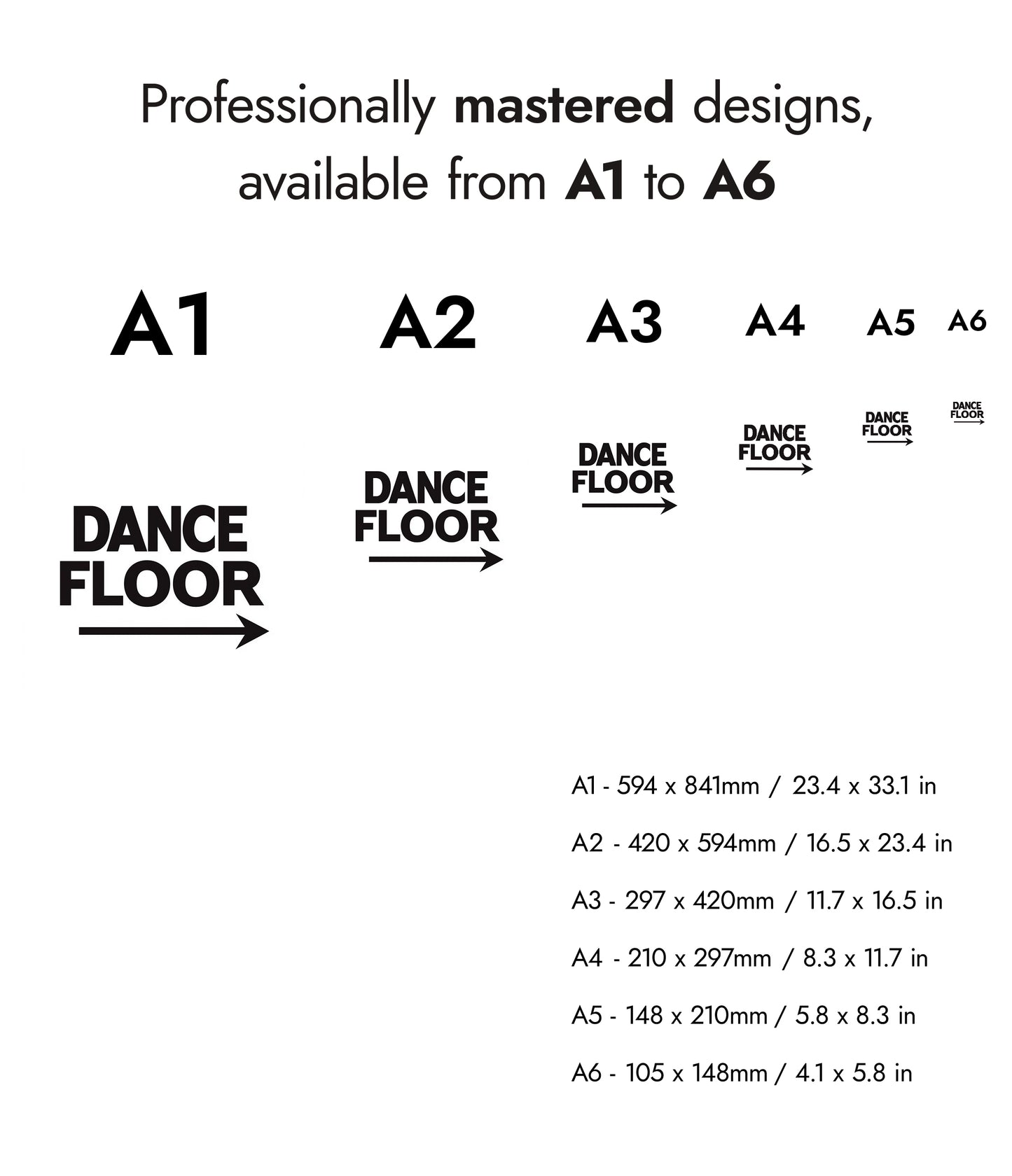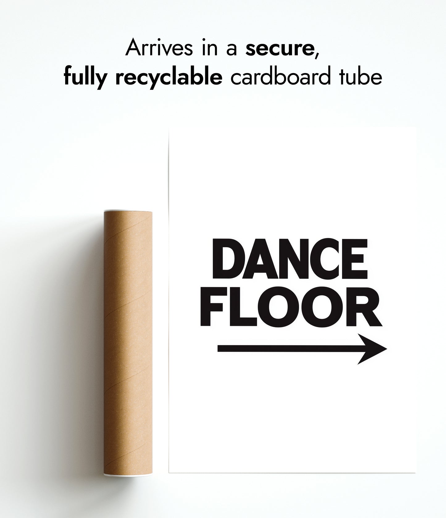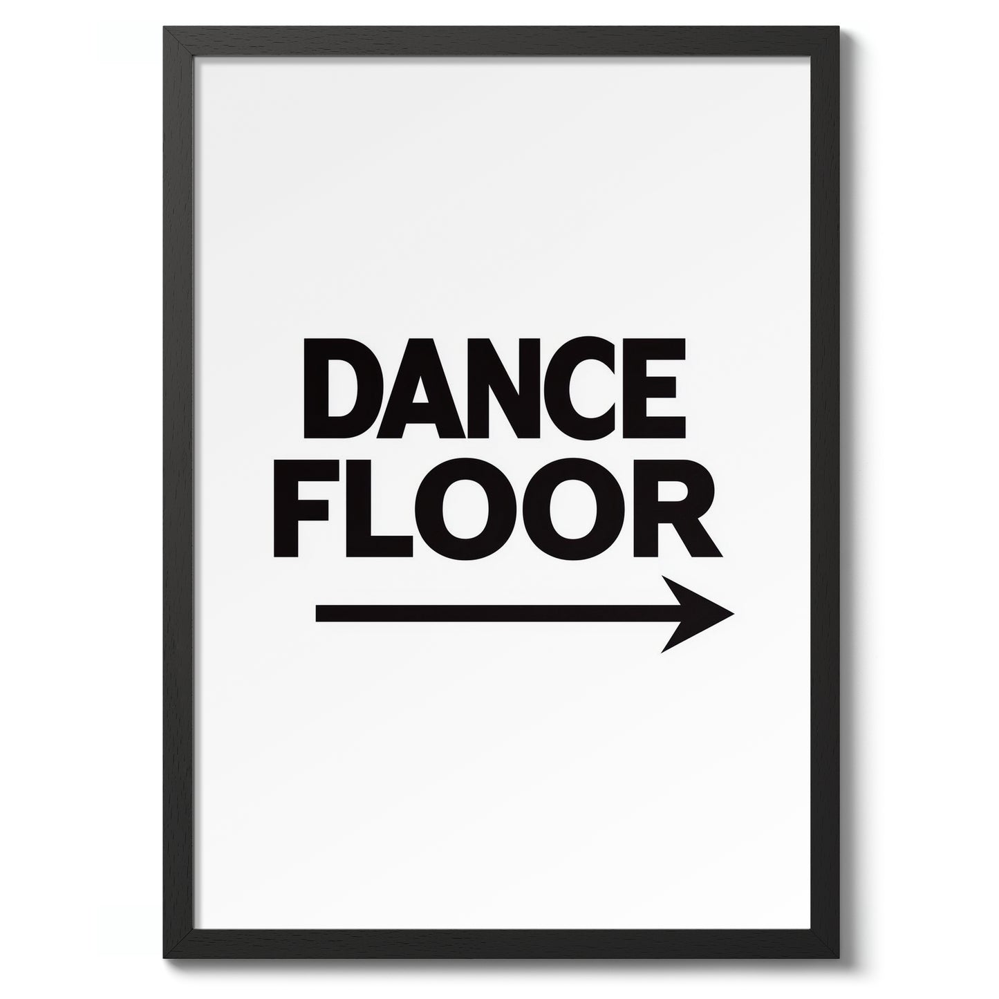 The "Dance Floor This Way" poster features a bold, minimalist typography design in black and white. With the words "DANCE FLOOR" prominently displayed alongside a directional arrow, this artwork elegantly captures the energy and invitation of the dance scene. Perfect for those who appreciate typographic art, it adds a dynamic touch to any space.