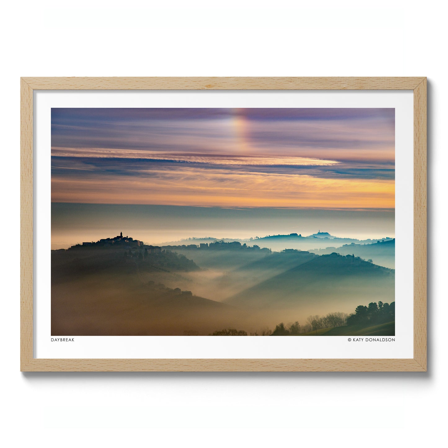 This captivating landscape poster titled "Daybreak" by Katy Donaldson features a mist-covered Italian valley at sunrise. The ethereal fog blankets the hills and valleys, while the vibrant sunrise colours paint the sky with hues of orange and purple. Perfect for adding a serene, atmospheric touch to any space, this photographic poster captures the mystical beauty of a foggy morning in Italy.