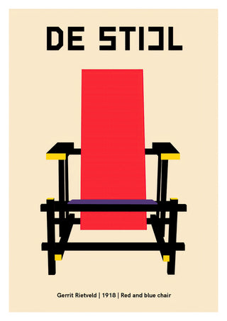 This "De Stijl - Red & Blue Chair" poster features Gerrit Rietveld's iconic 1918 chair design. Set against a minimalist beige background, the bold lines and primary colours reflect the essence of the De Stijl artistic movement. Perfect for those interested in mid-century design, this photographic portrait captures the geometric elegance of the famed red and blue chair. Ideal for modern art enthusiasts.