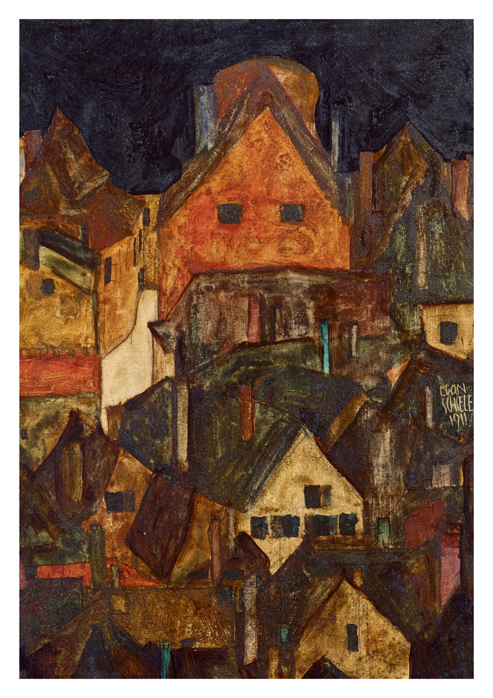 Egon Schiele's "Dead City II (Krumau at Night)" poster captures a hauntingly vivid cityscape. This expressionist painting depicts the dark, dense architecture of Krumau with intense colouration and intricate, shadowy details, creating a sense of mystery. Perfect for those who appreciate moody, atmospheric village scenes. This art print is a striking addition to any collection focused on night cityscapes and expressionism.
