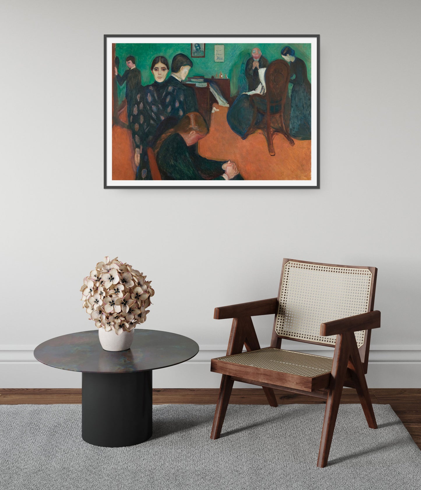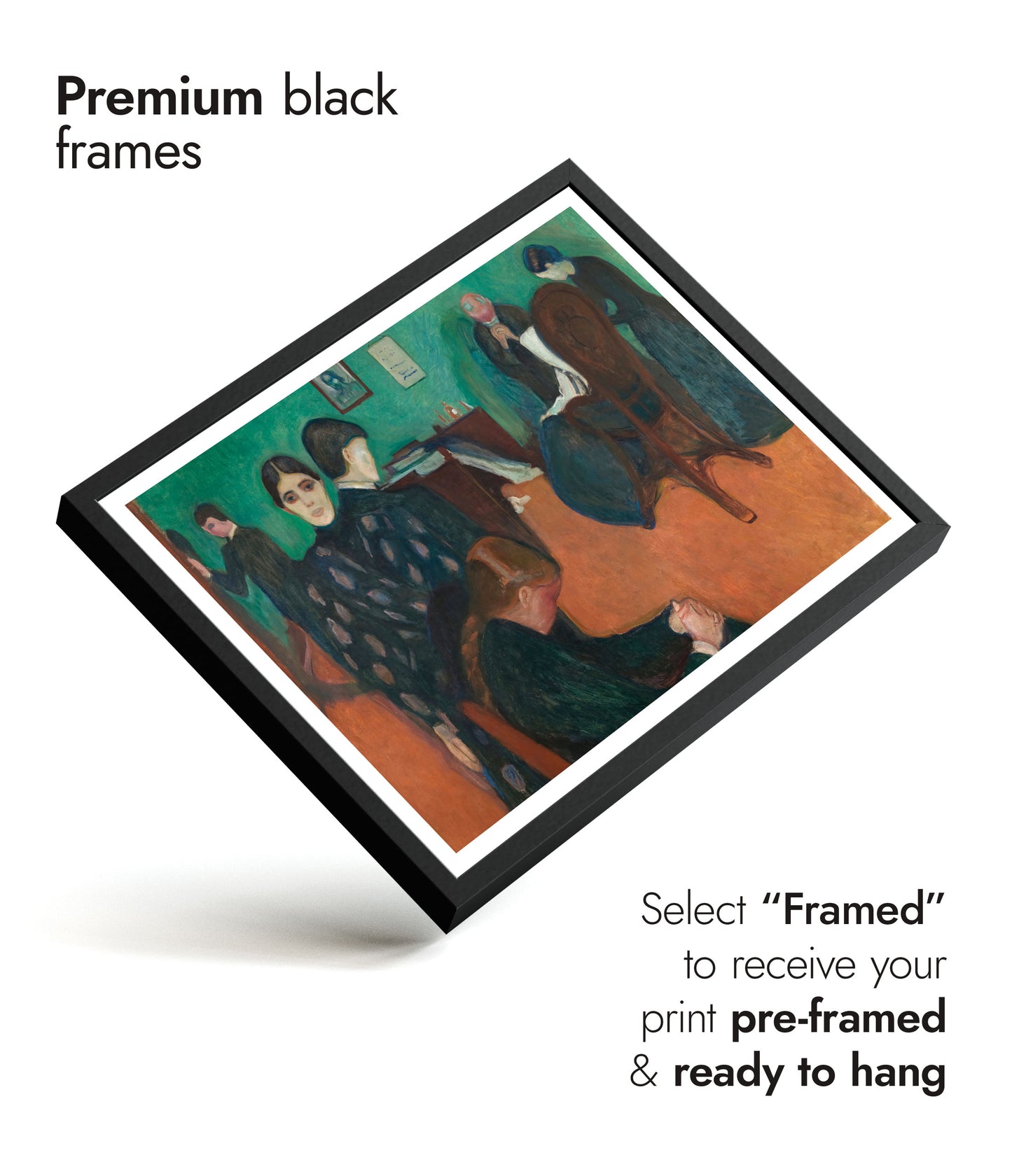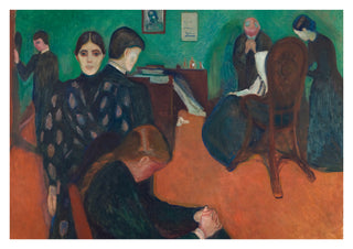 Edvard Munch's "Death in the Sickroom" poster captures the profound emotional gravity of a family gathered around a dying loved one. The painting's Post-Impressionist and Symbolist elements are evident in the heavy use of colour and expressive forms. The crowd's solemn faces and the room's somber atmosphere evoke themes of mortality and grief, making it a poignant addition to any art collection.