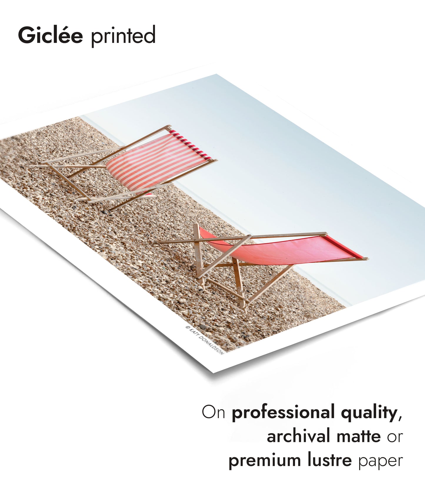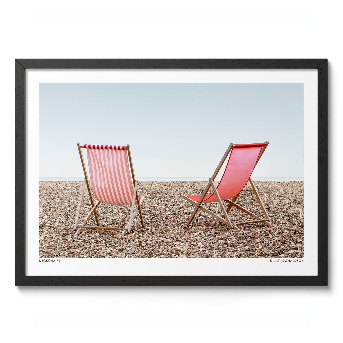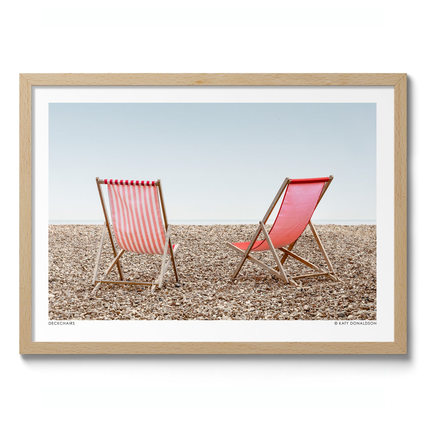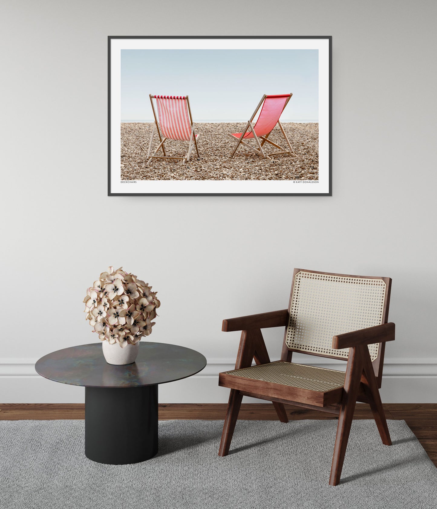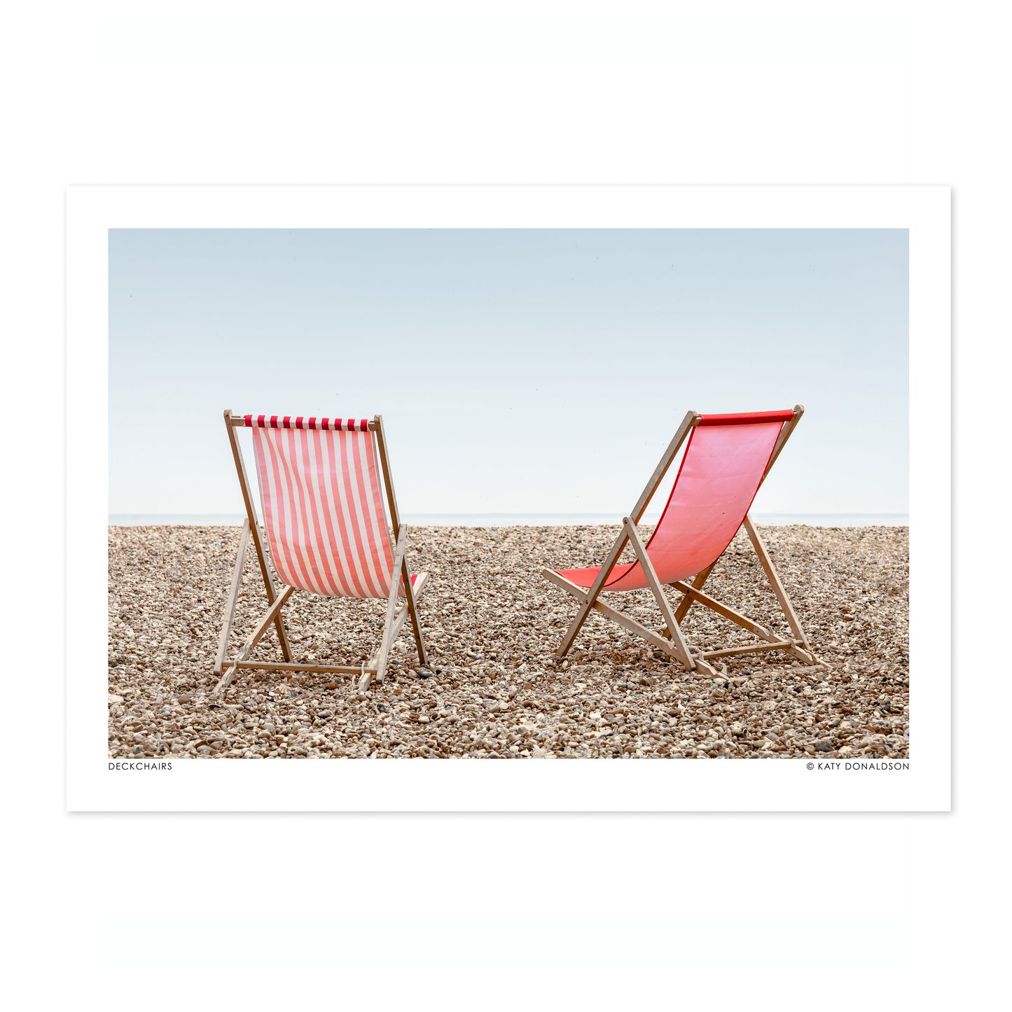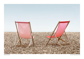 This photographic poster, “Deckchairs” by Katy Donaldson, captures a minimalist beach scene featuring two empty deckchairs on a pebbled shore under a clear sky. The striking simplicity is enhanced by the contrasting red and striped patterns of the chairs, evoking a serene and calm seaside atmosphere. Perfect for modern and minimalist decor themes.