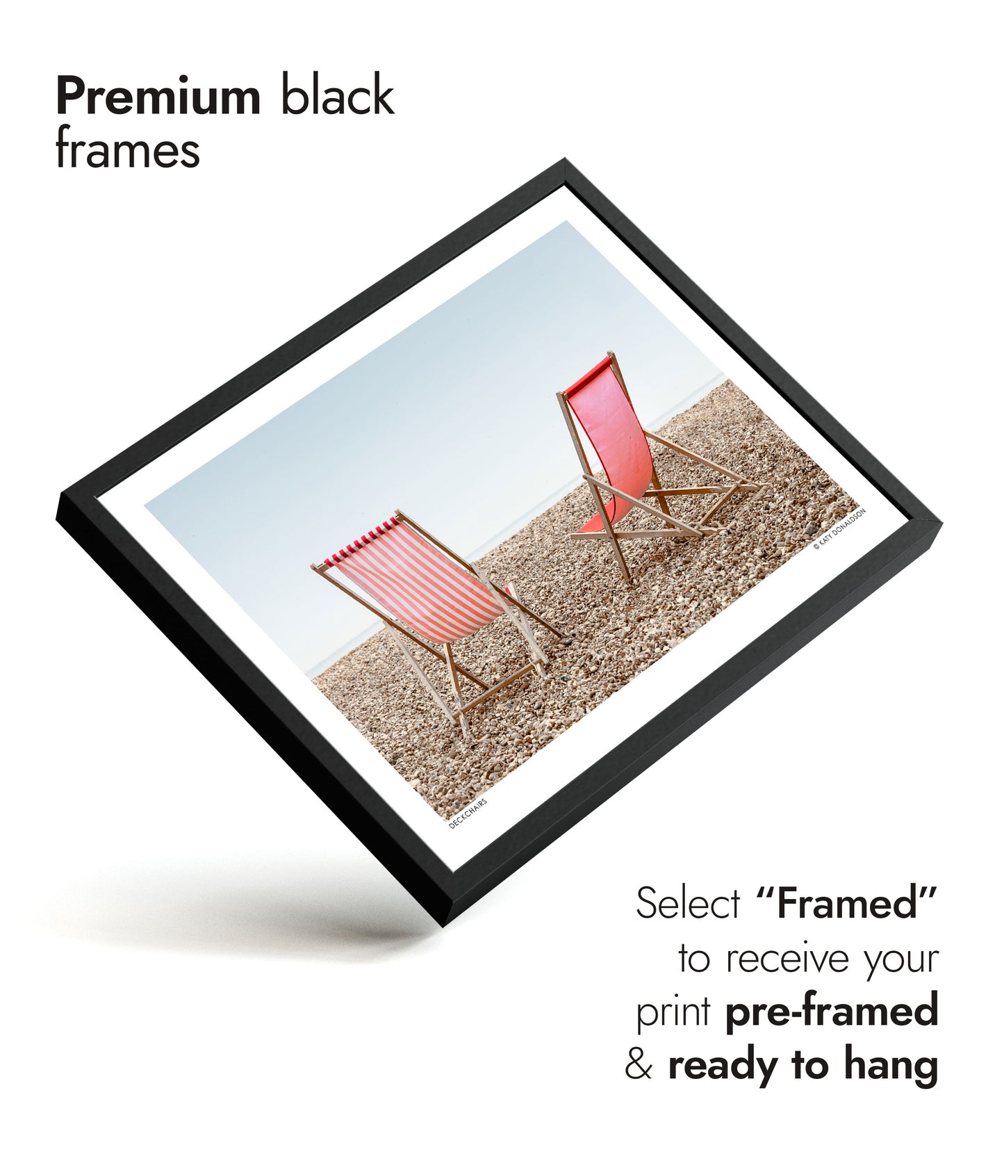 Solid wood frames available in black stained or natural finishes, with UV resistant acrylic glass. Framed orders arrive pre-installed with your choice of print, ready to hang. Available in all print sizes.