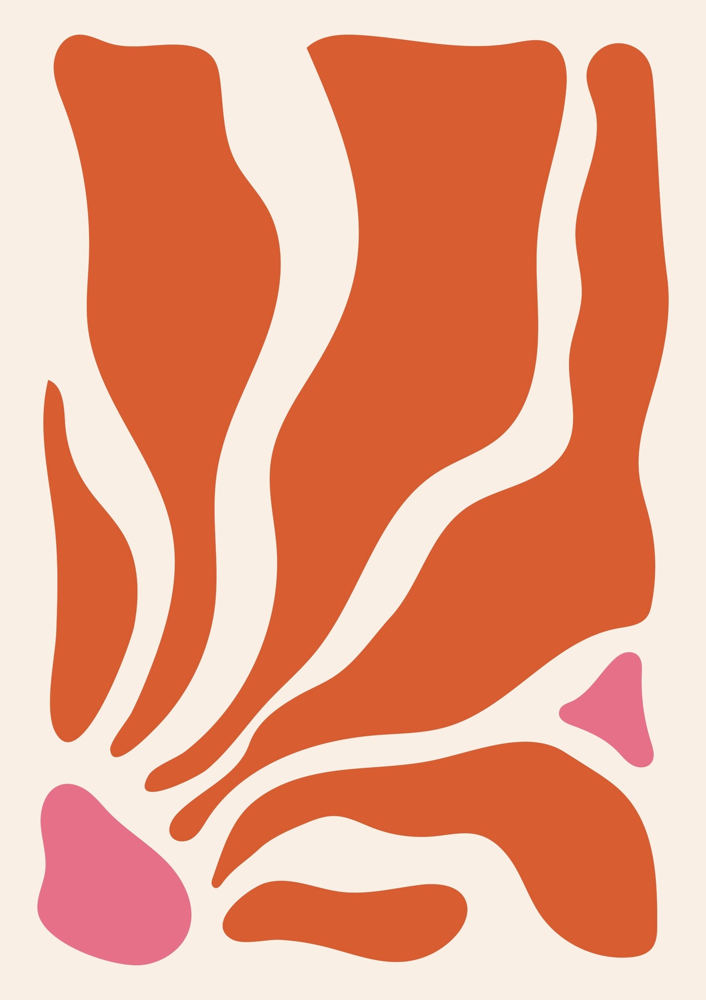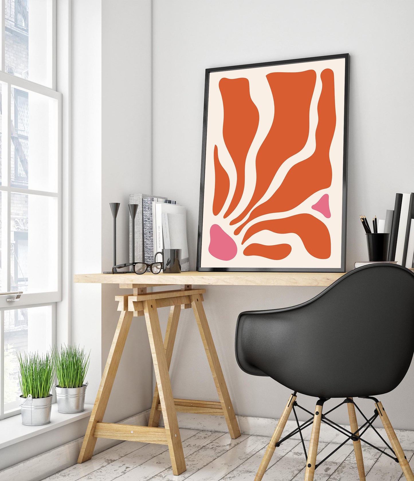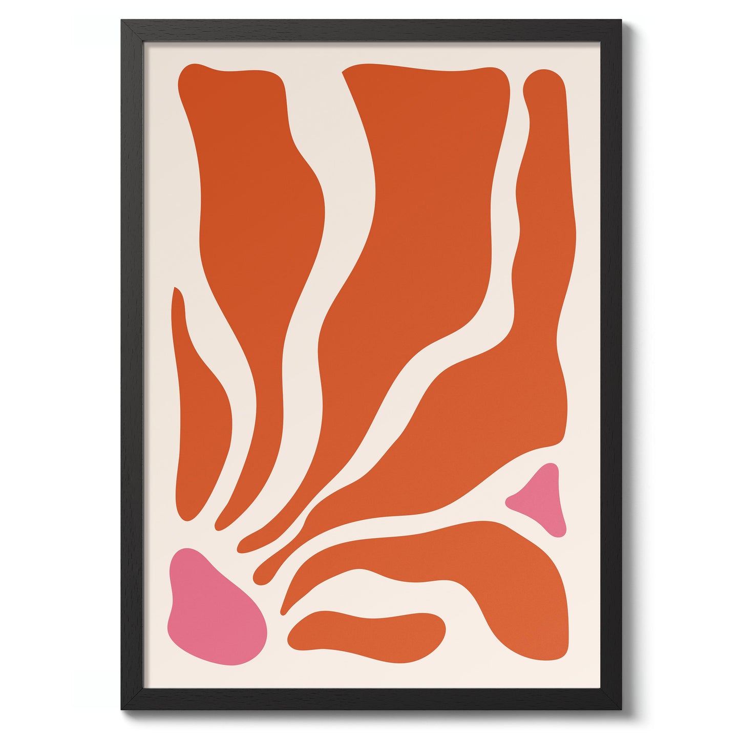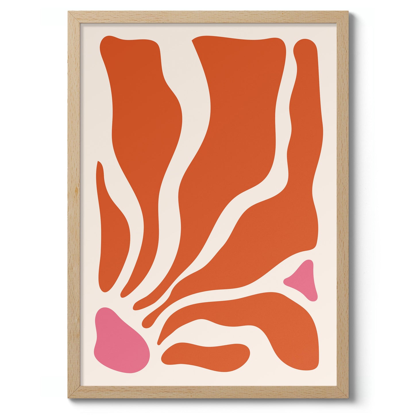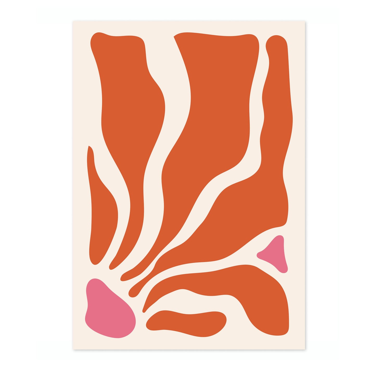 The "Deep Red Petals" poster features bold, abstract shapes in vibrant red and pink tones, evocative of stylized flower petals. This graphic cutout illustration creates a striking visual contrast against a neutral background, making it a compelling addition to any modern art collection. Perfect for adding a splash of colour and a touch of nature-inspired design to your space.