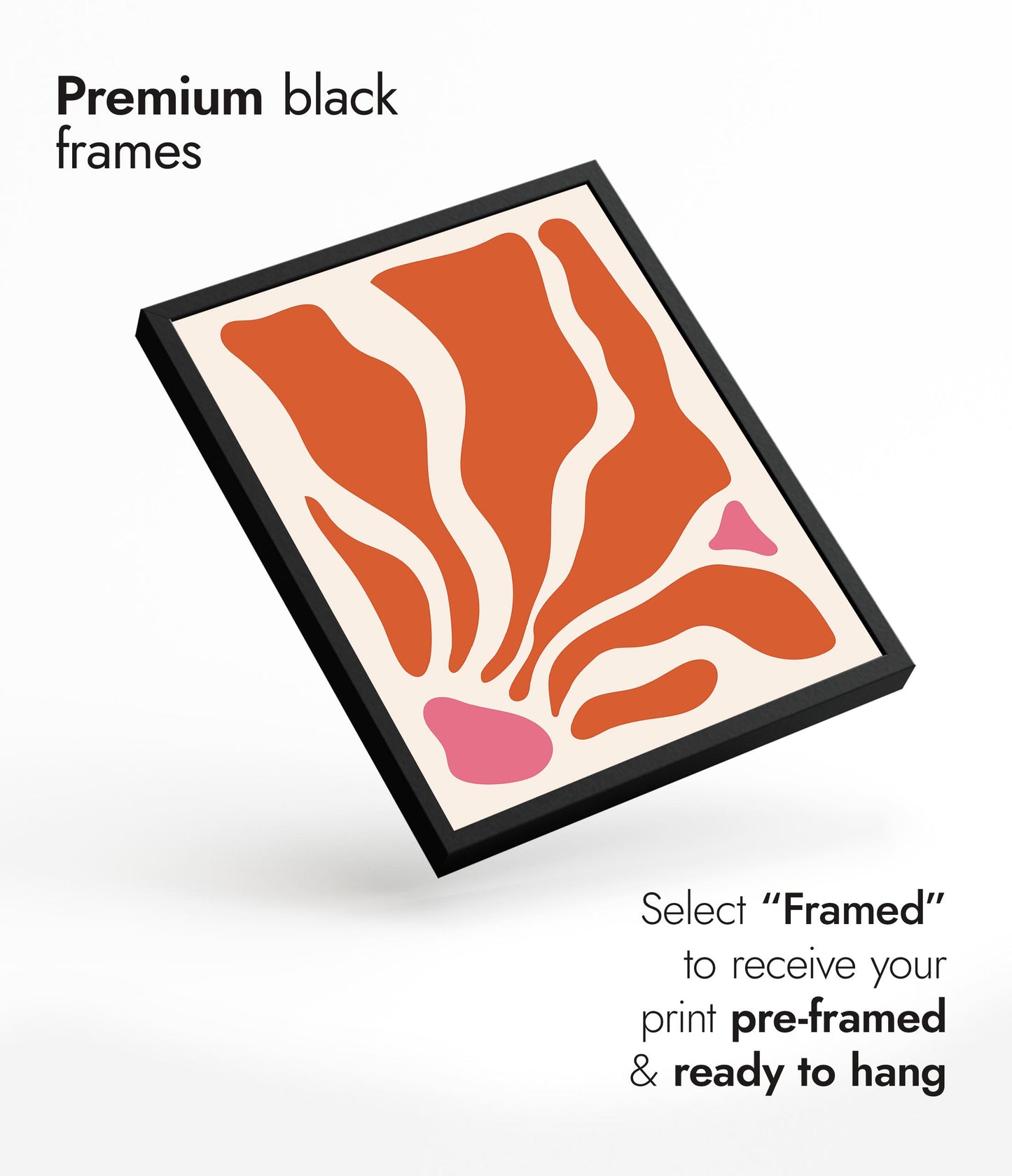 Solid wood frames available in black stained or natural finishes, with UV resistant acrylic glass. Framed orders arrive pre-installed with your choice of print, ready to hang. Available in all print sizes.