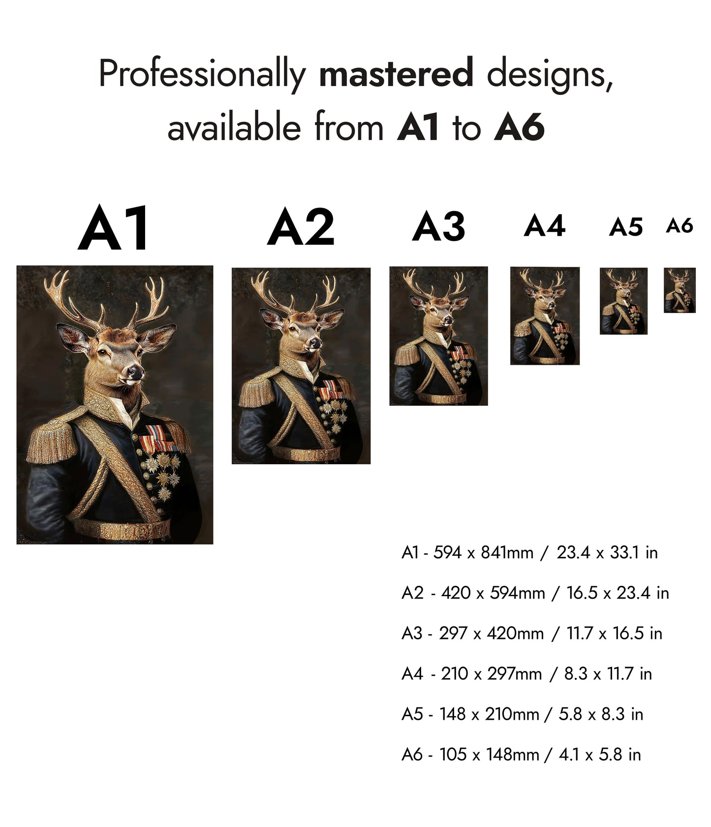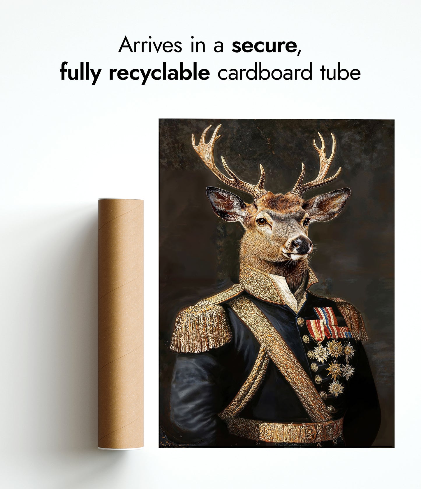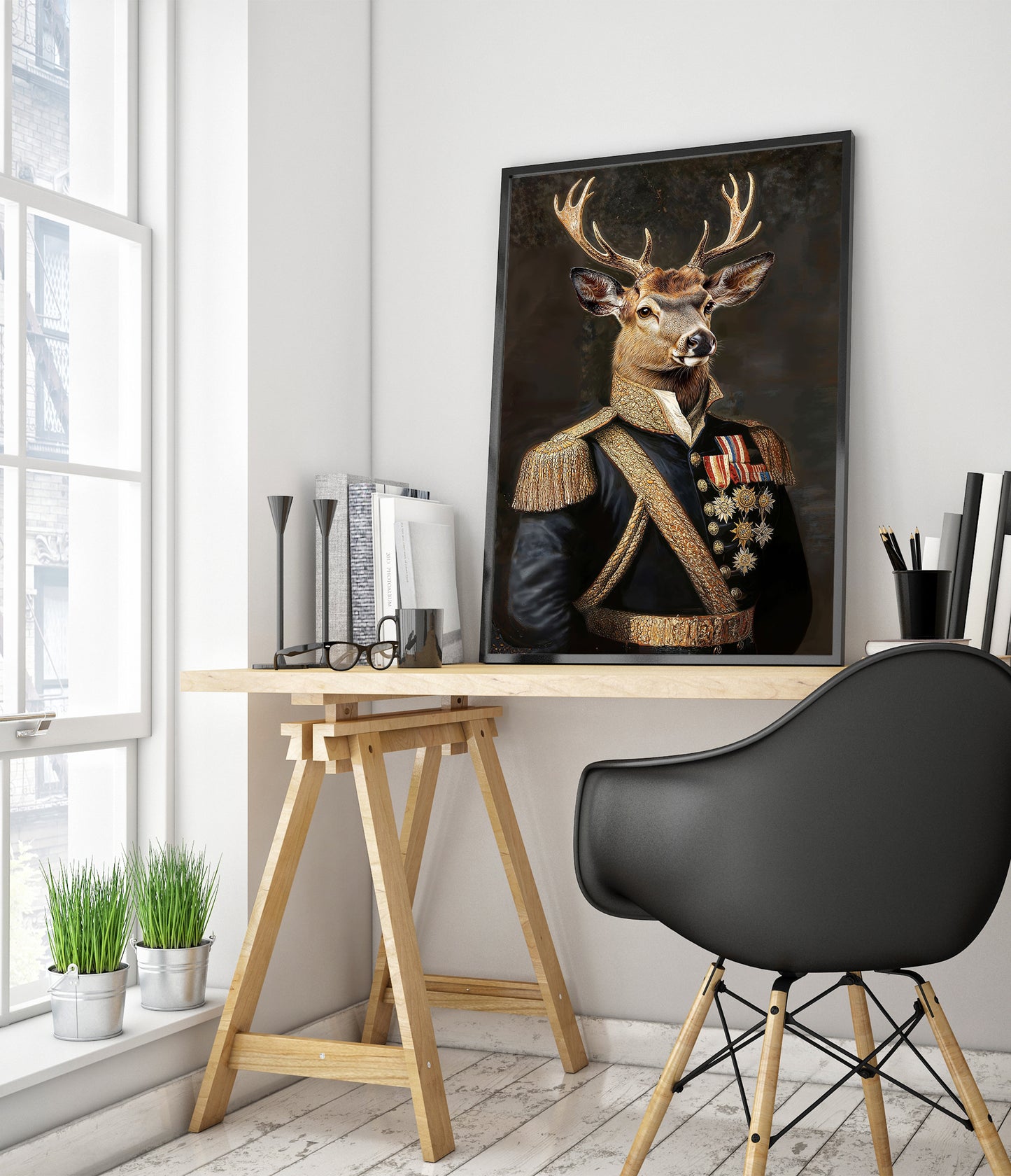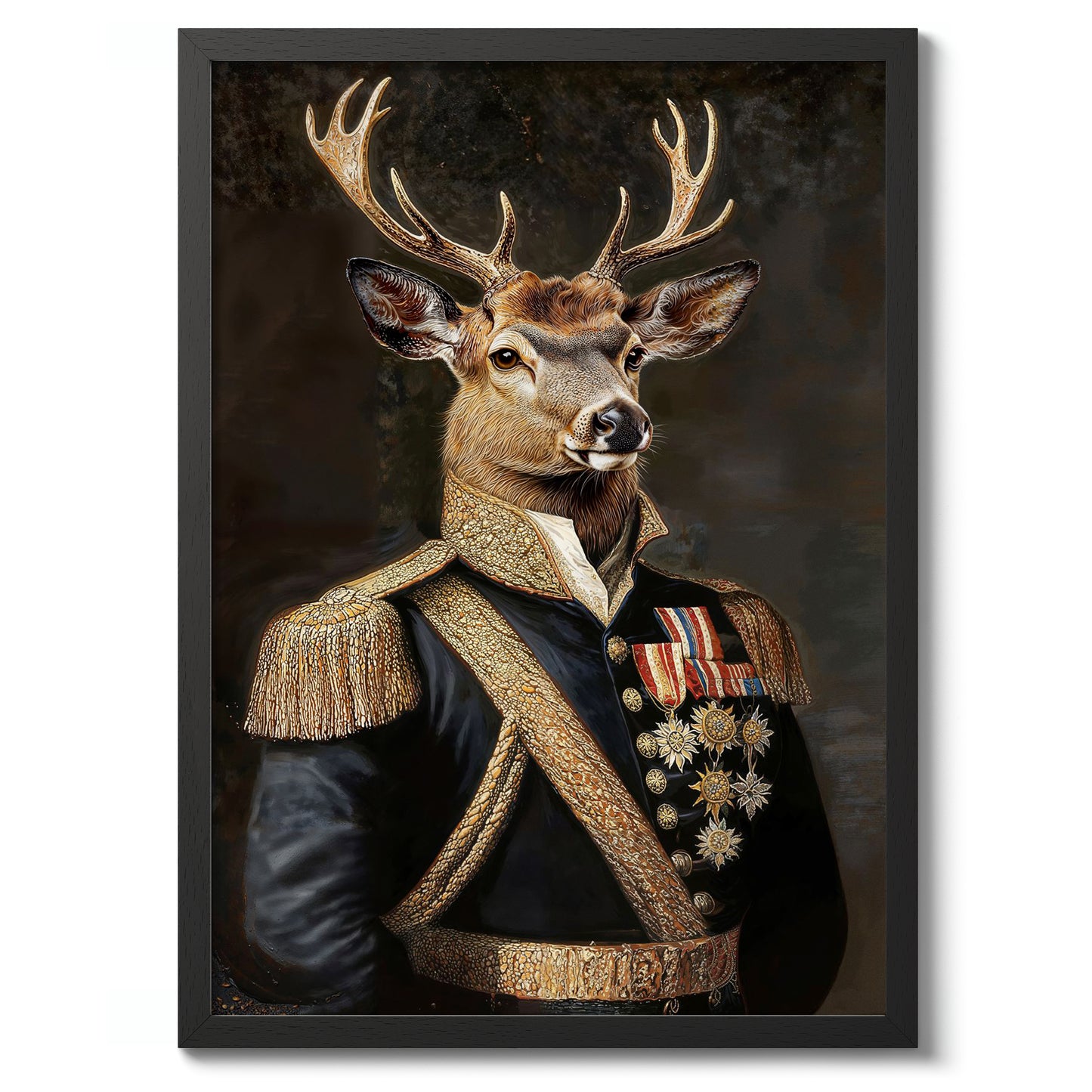 This striking poster features a regal deer in opulent military attire, blending nature and historical costume for a whimsical, vintage appeal. The detailed antlers and aristocratic uniform highlight the fusion of animal majesty and human hierarchy, making it a captivating addition to any art collection. Ideal for those appreciating both humorous and nature-themed artwork.