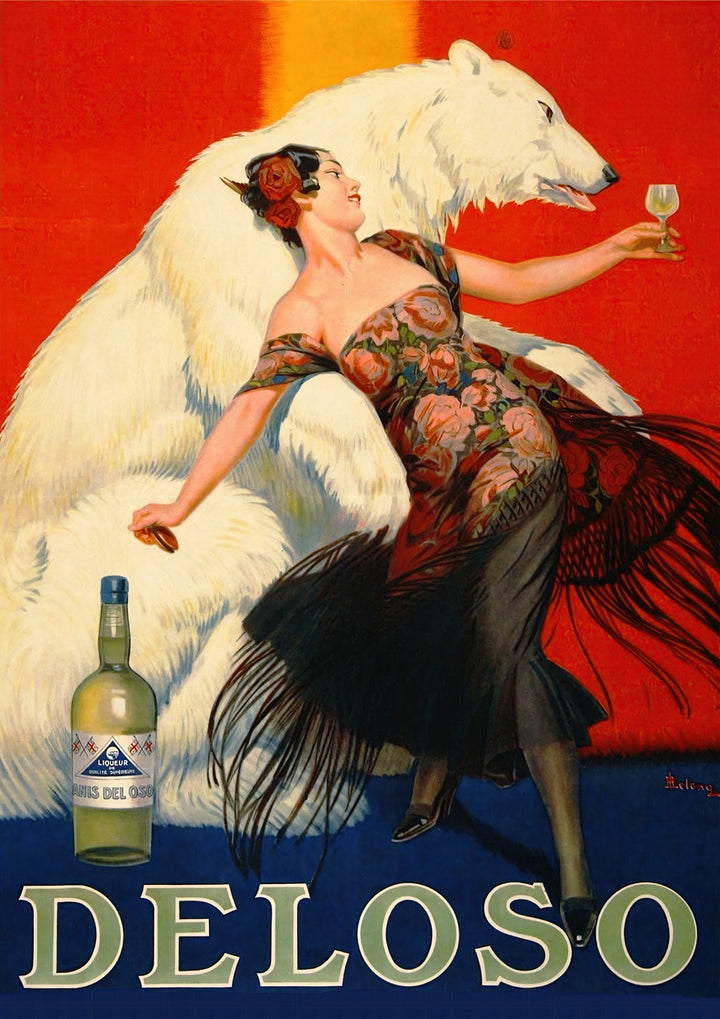 This vintage Deloso poster features an elegant woman in a floral dress holding a cocktail, with a majestic white bear behind her. The rich red, yellow, and blue background enhances the classic appeal. Perfect for adding a touch of vintage charm and European sophistication to any space. Ideal for enthusiasts of vintage alcohol advertisements and timeless illustrations.
