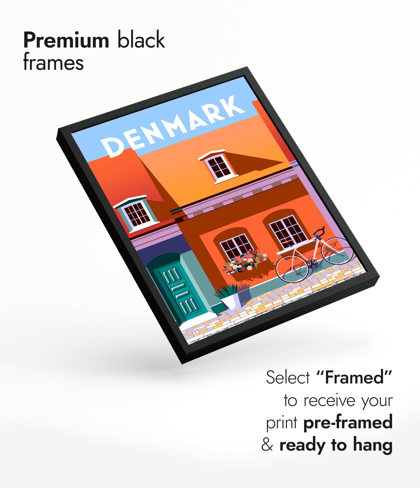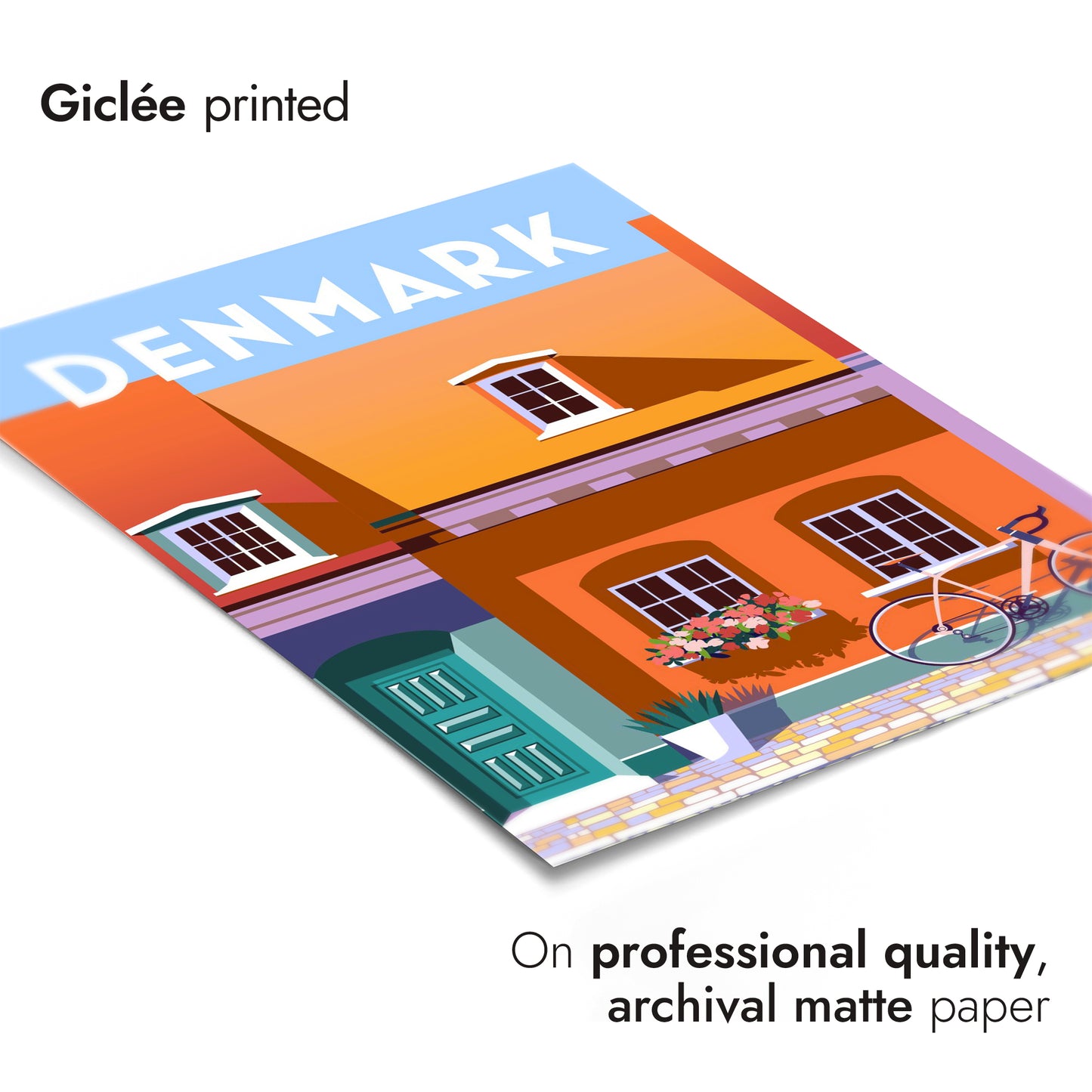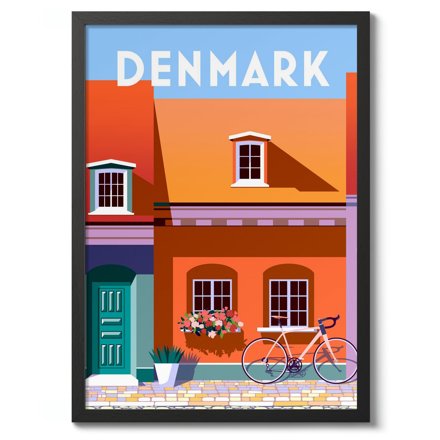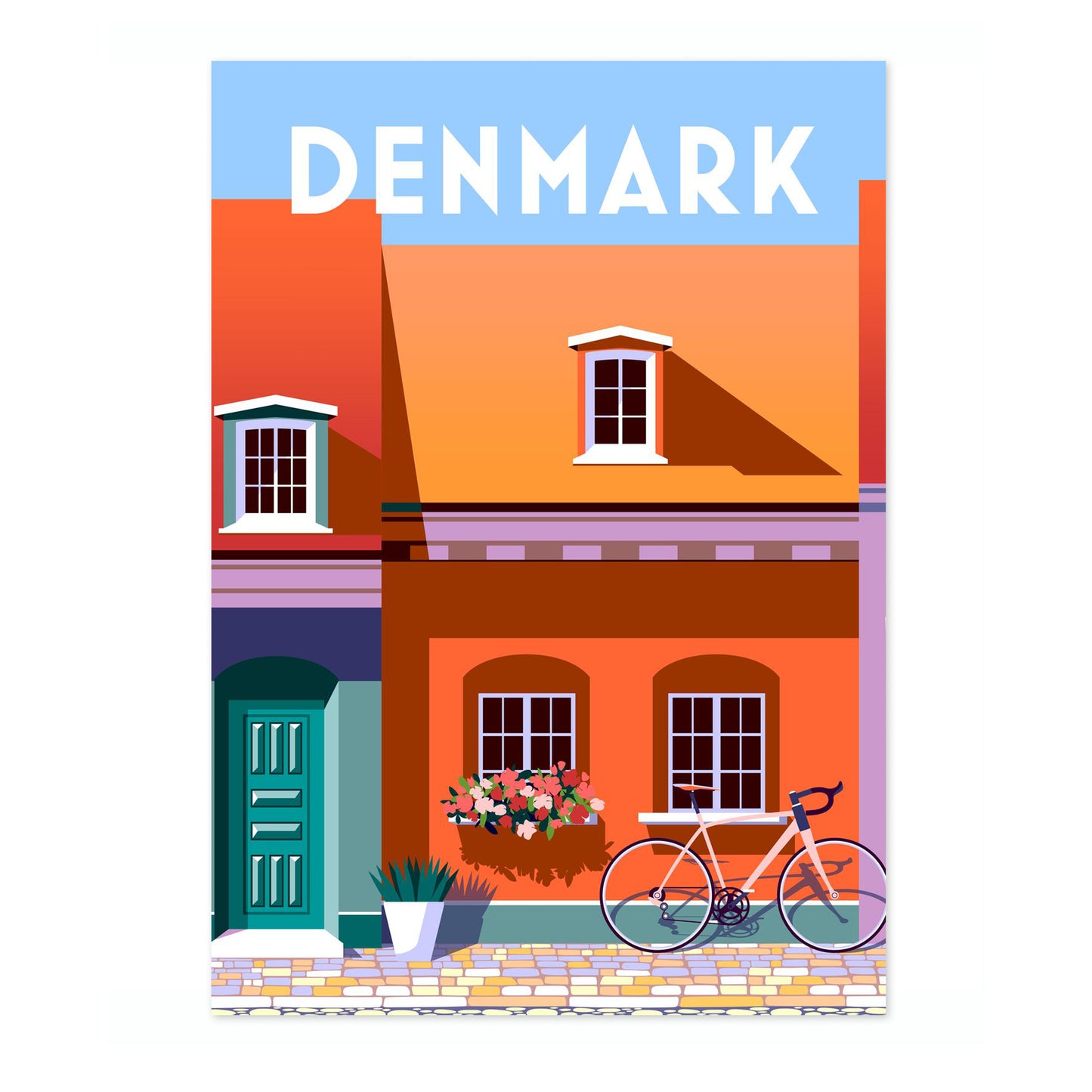 This Denmark travel poster showcases a charming streetscape with vividly colored townhouses and a vintage bicycle. Its modern graphic style highlights an orange facade with white-framed windows and a flower box. The bold blue door adds contrast, while the crisp typography emphasizes the destination. Perfect for those captivated by vibrant European architecture and cycling culture.