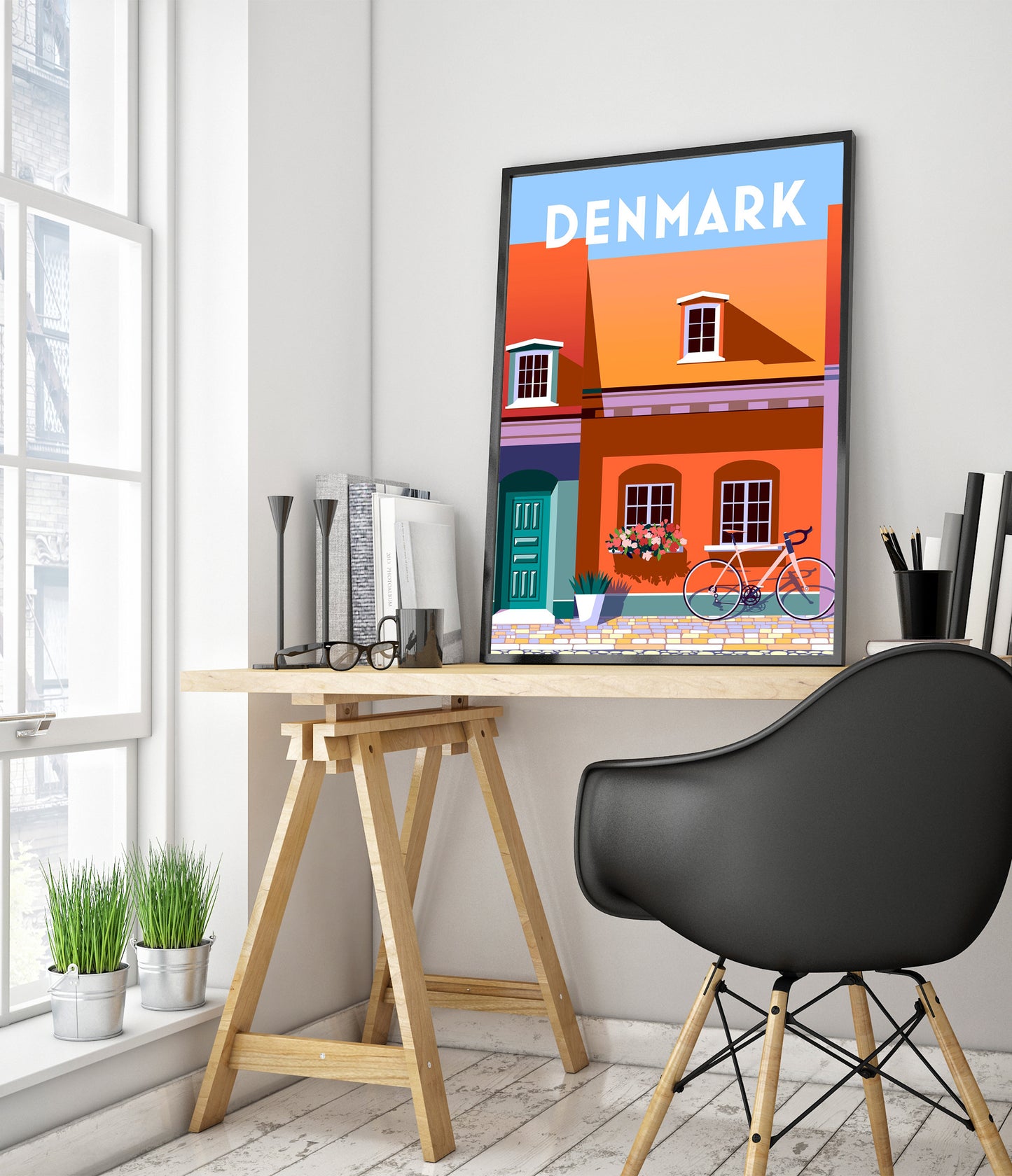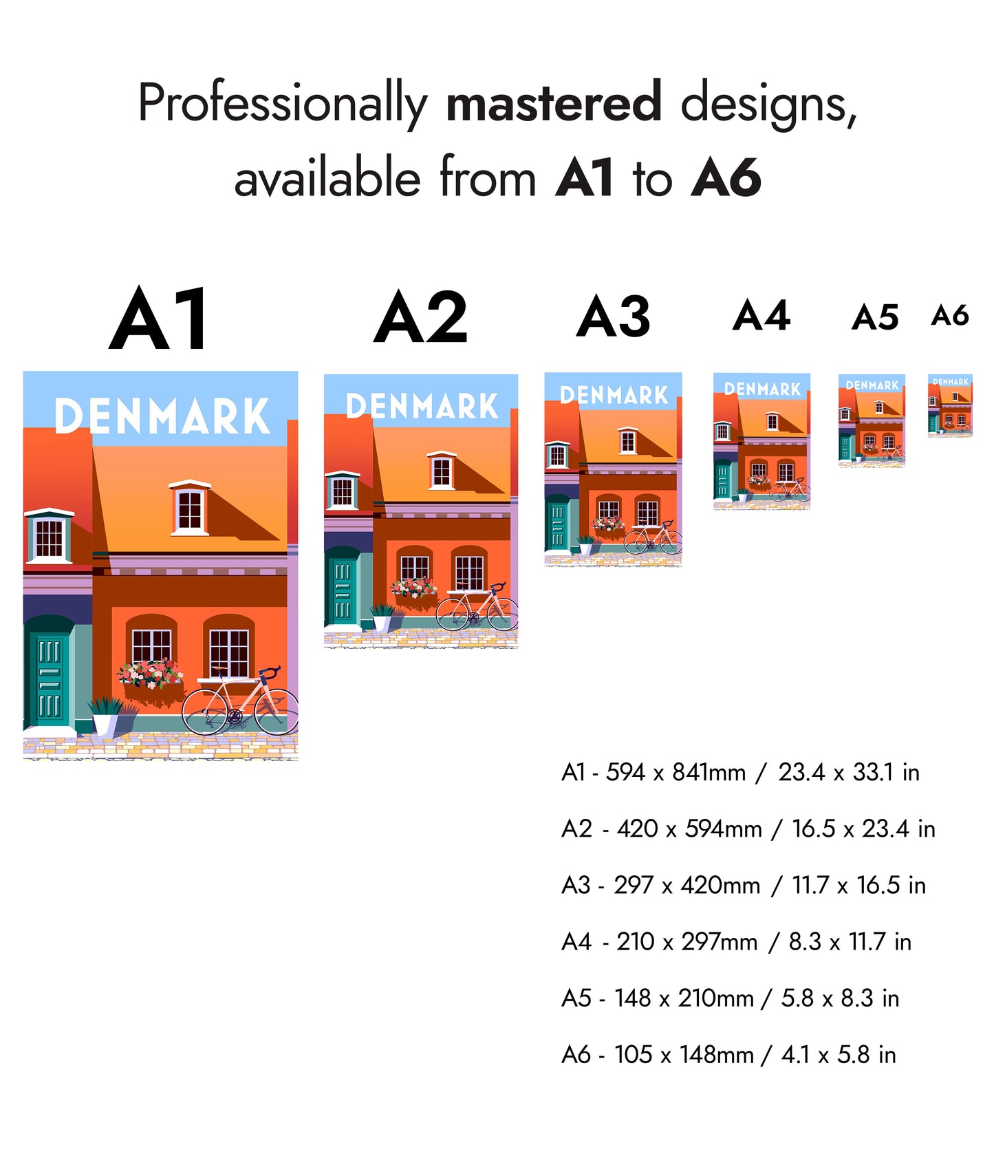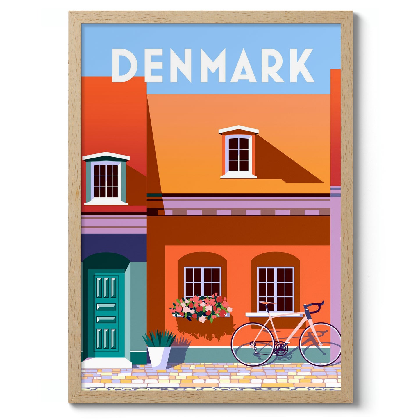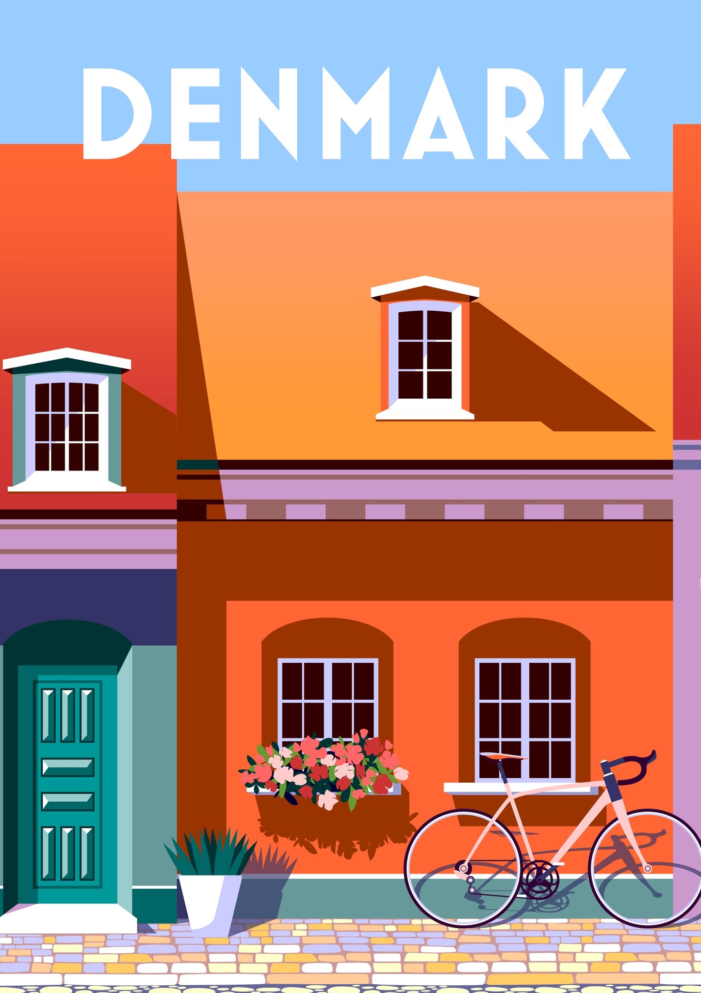 This Denmark travel poster showcases a charming streetscape with vividly colored townhouses and a vintage bicycle. Its modern graphic style highlights an orange facade with white-framed windows and a flower box. The bold blue door adds contrast, while the crisp typography emphasizes the destination. Perfect for those captivated by vibrant European architecture and cycling culture.
