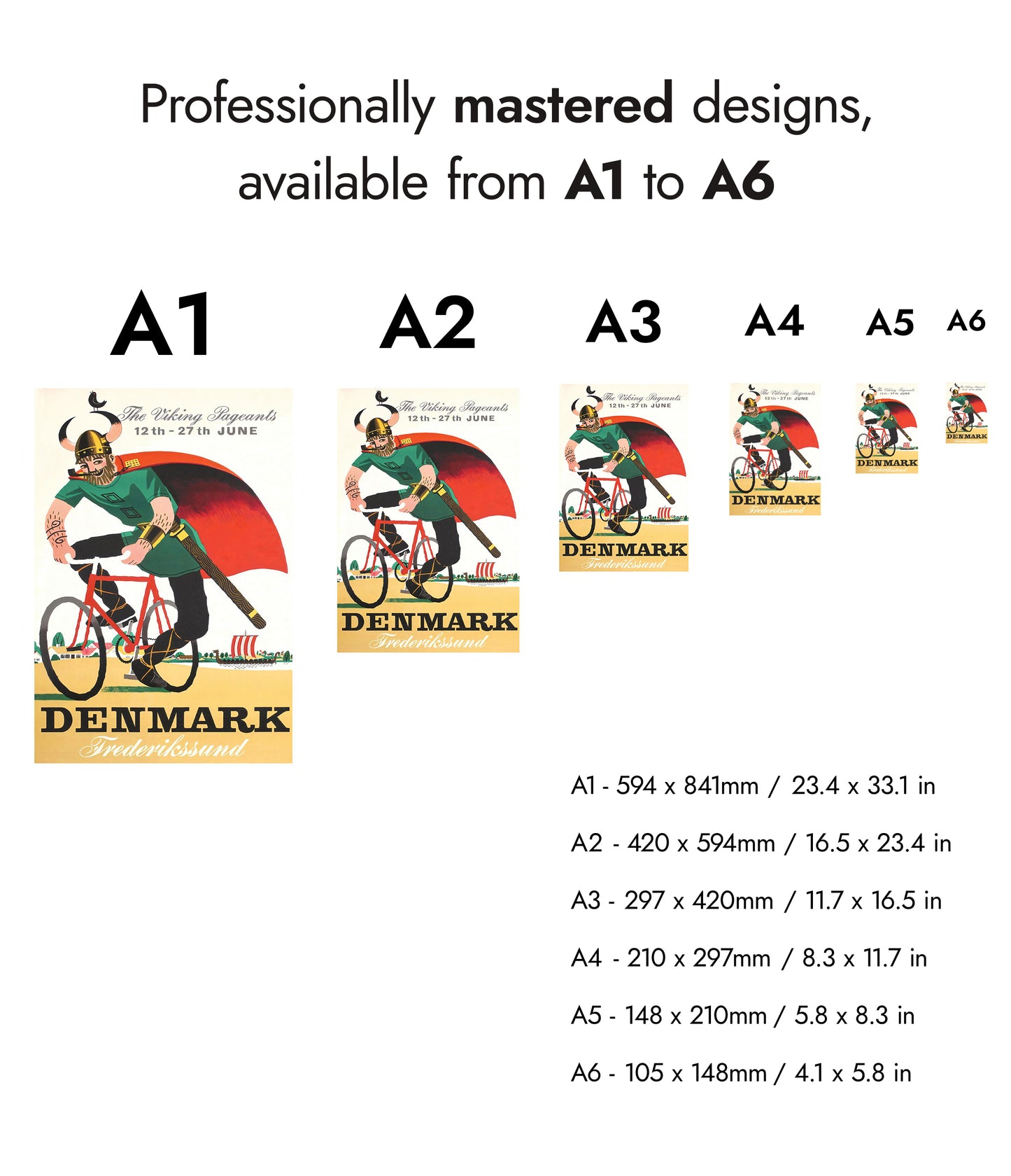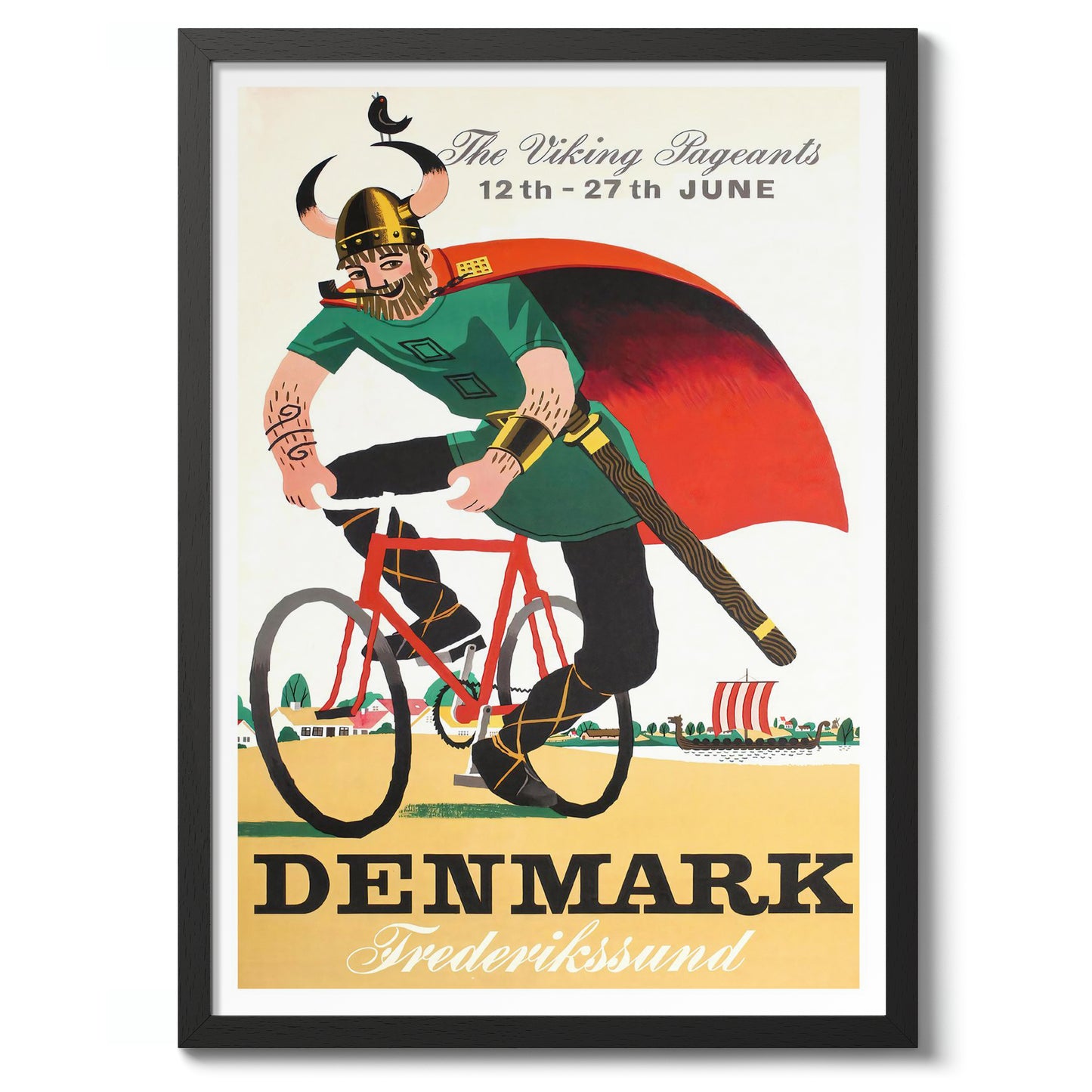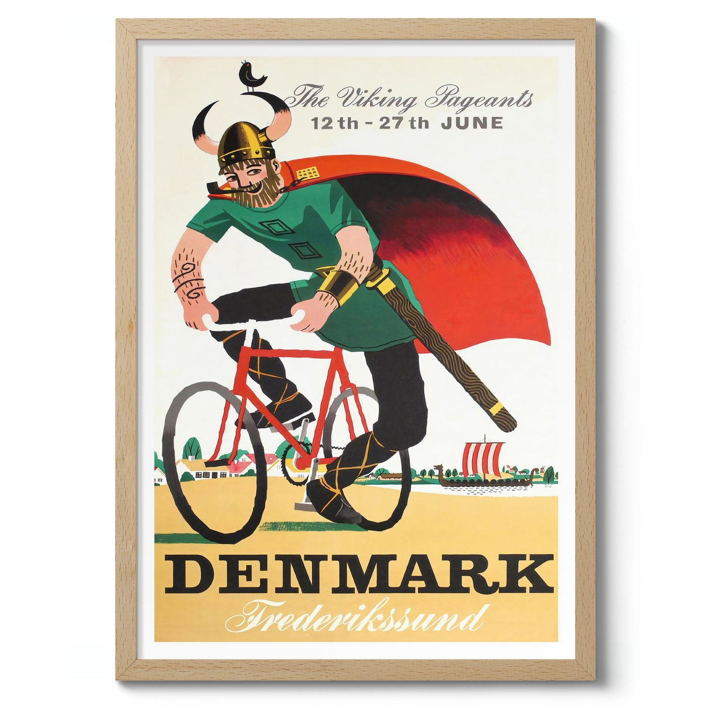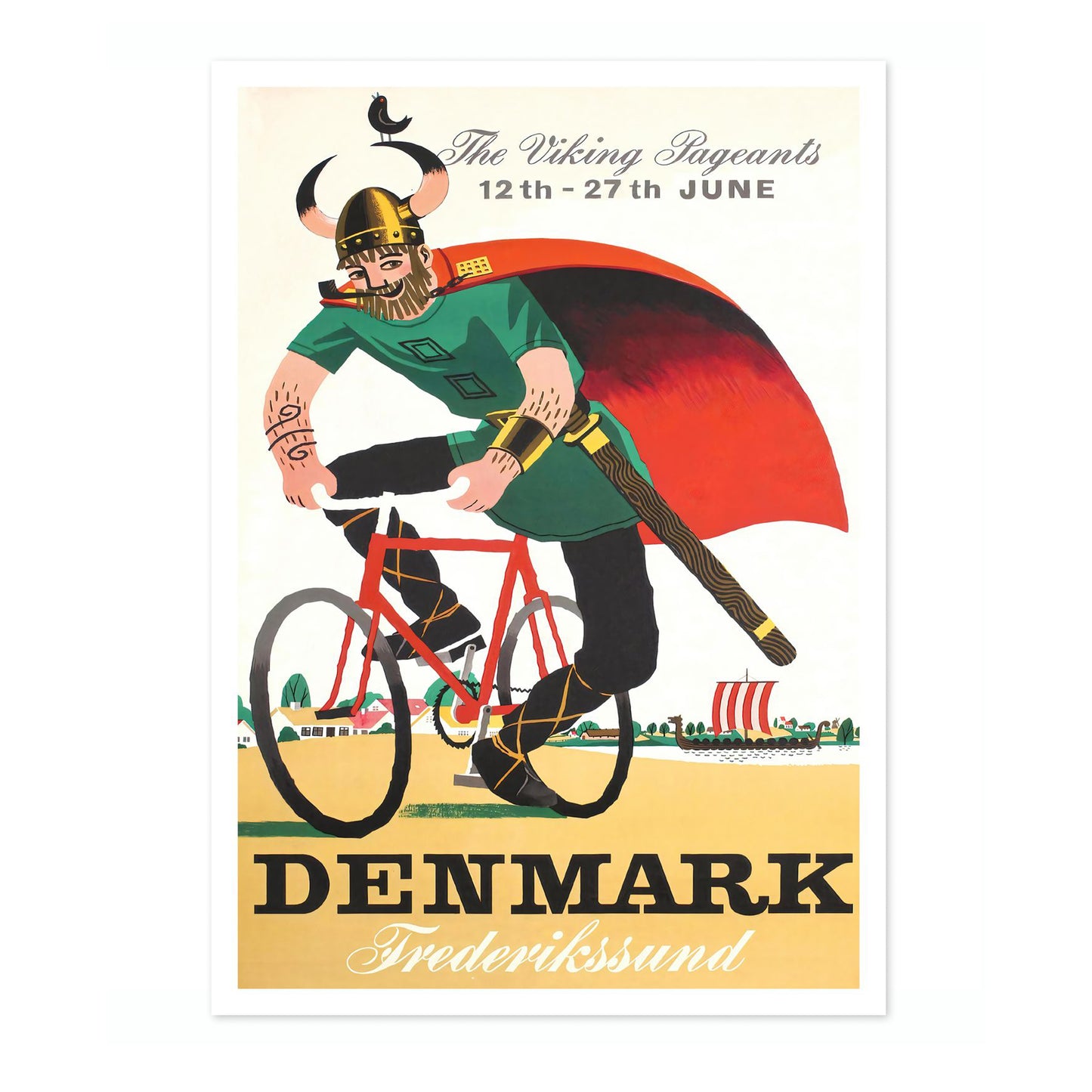 This vintage-inspired poster captures a whimsical Viking cycling through Frederiksund, Denmark. With a vivid red cape, Nordic helmet, and traditional sword, the illustration blends playful history with scenic travel motifs. The artwork, characterized by beige and red tones, invites viewers to the Viking Pageants held from June 12th to 27th. Ideal for vintage travel enthusiasts seeking unique art prints.