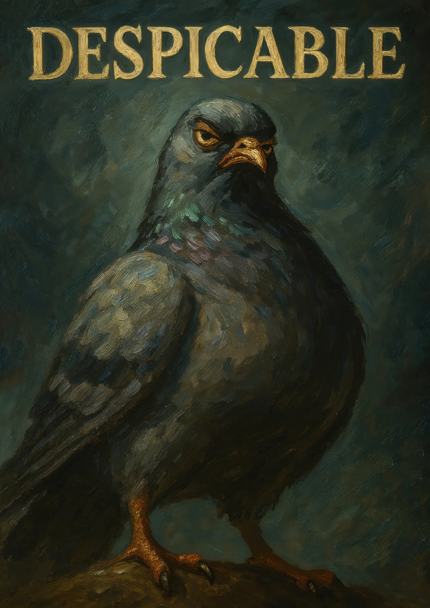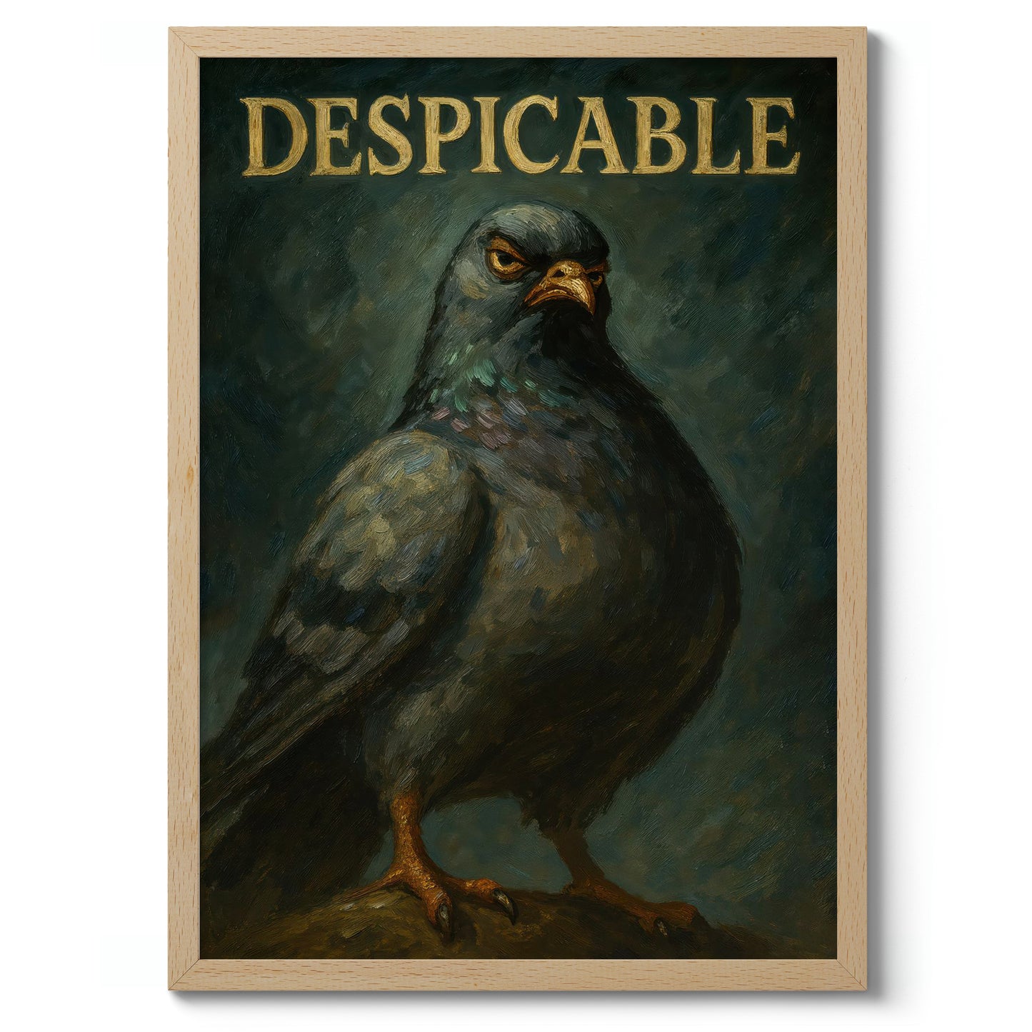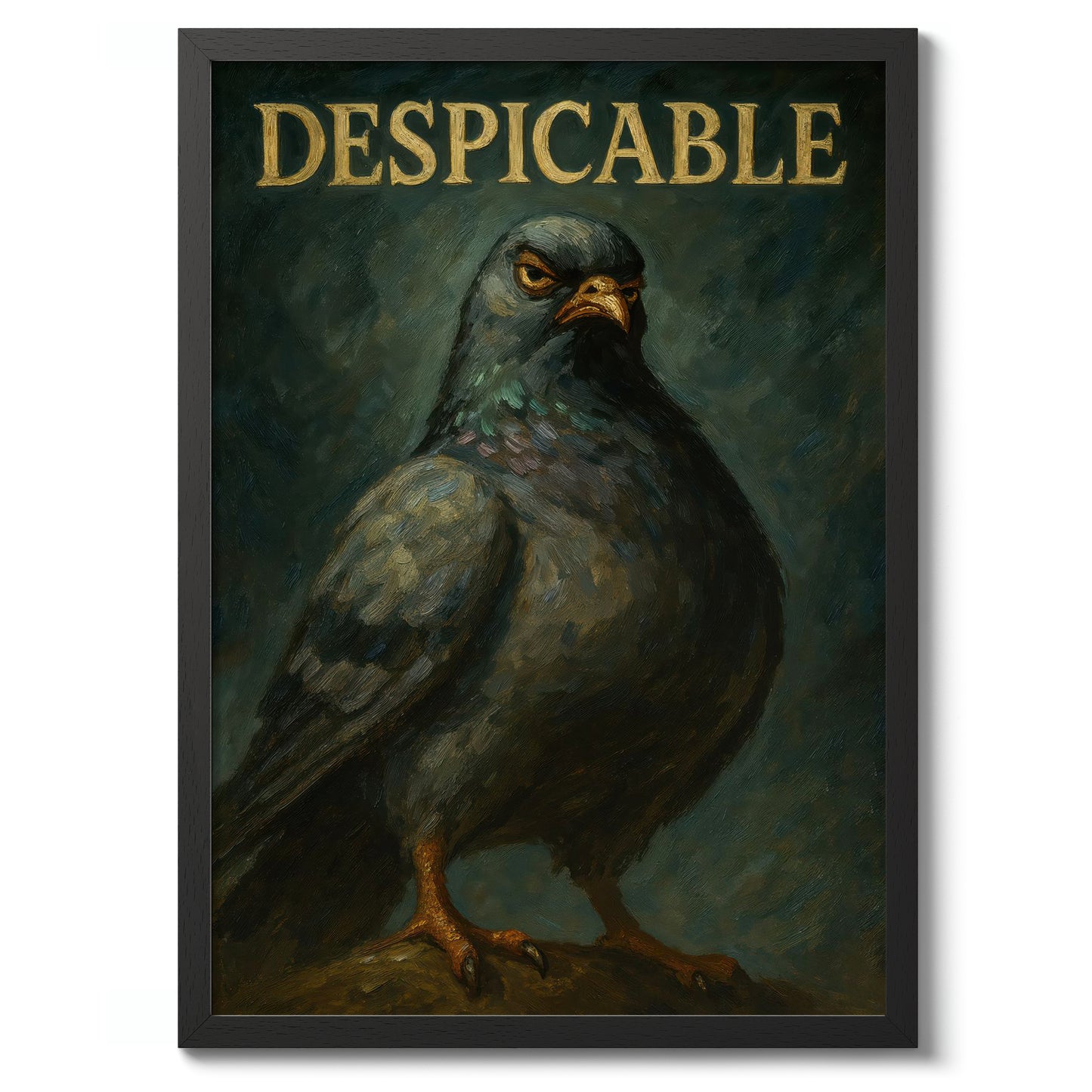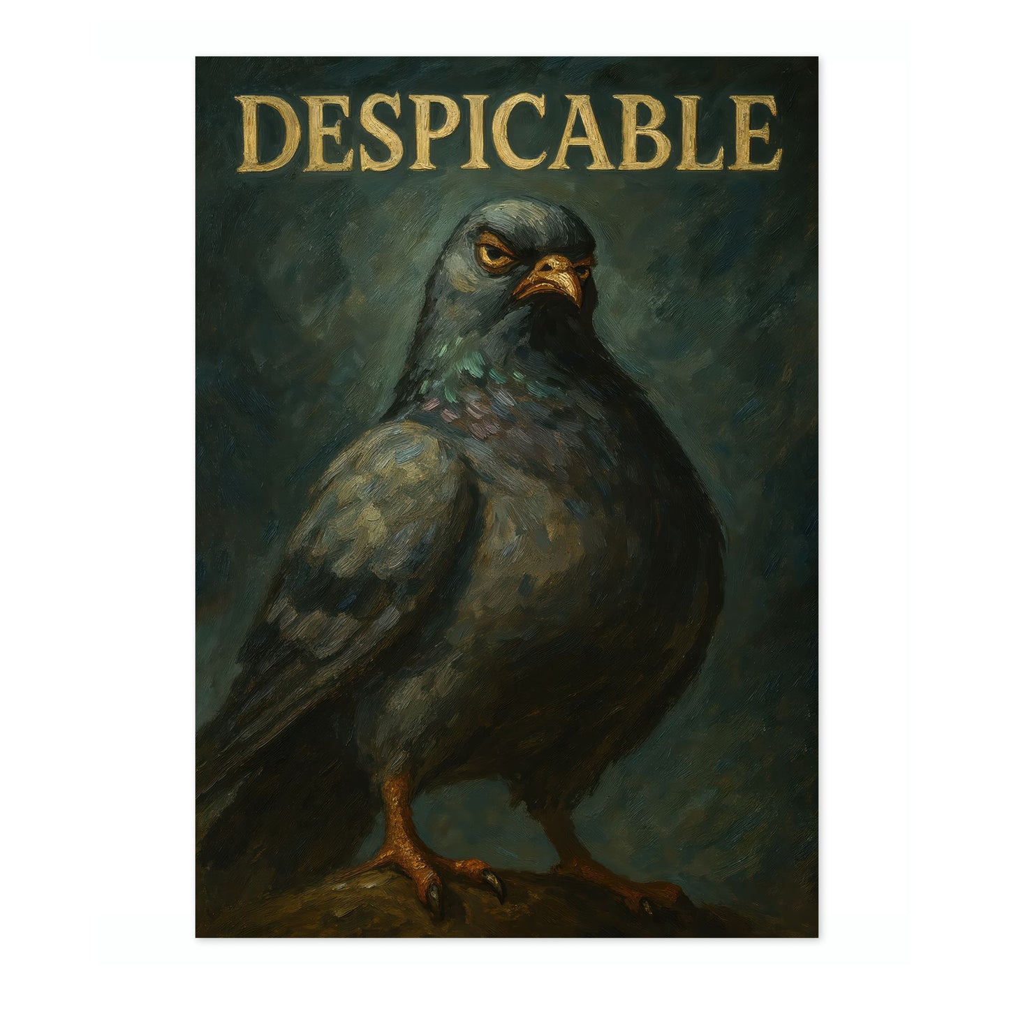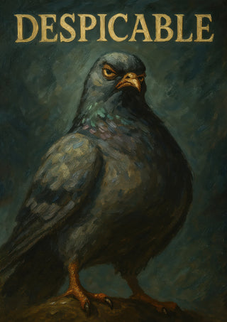 This humorous poster entitled "Despicable" features a bold, oil-style illustration of a pigeon with a comically serious expression, set against a textured dark background. The large typographic word "DESPICABLE" crowns the image, adding a whimsical touch. Ideal for those with a quirky sense of humor, this artwork combines elements of animal portraiture with graphic design.