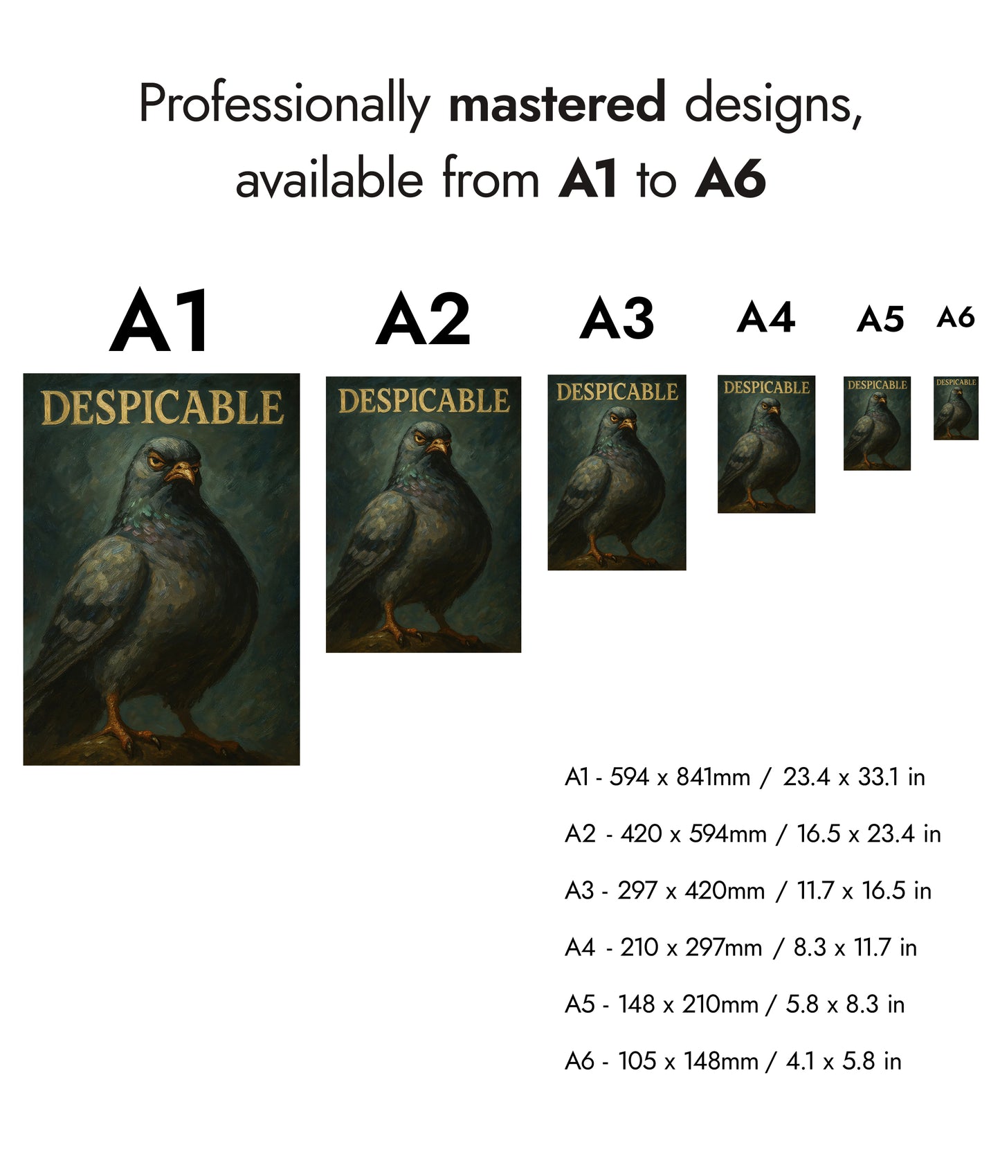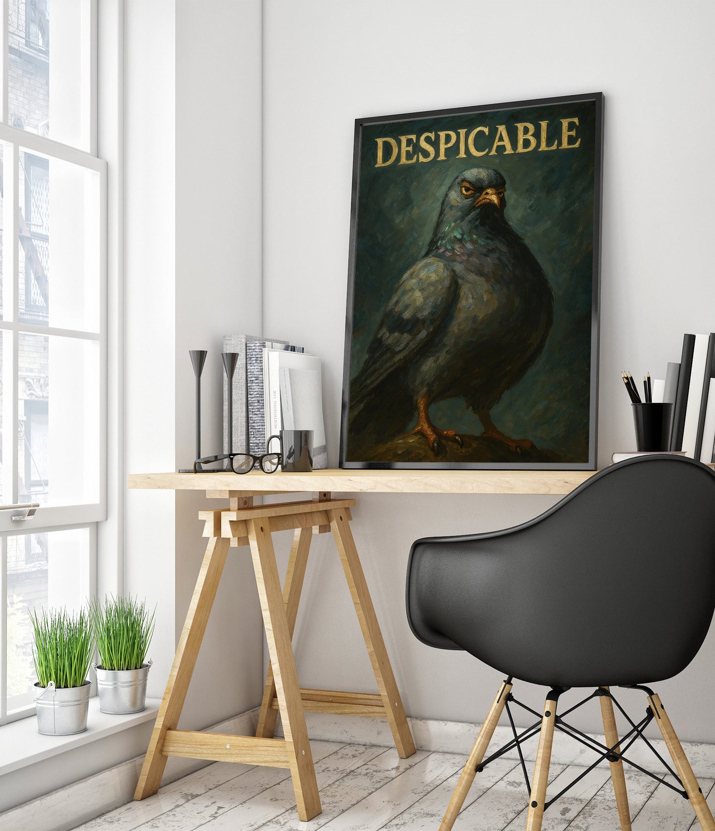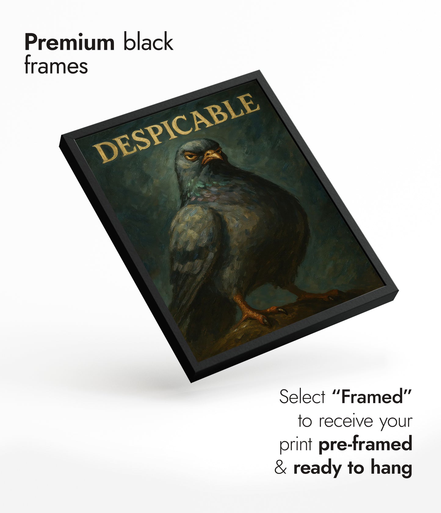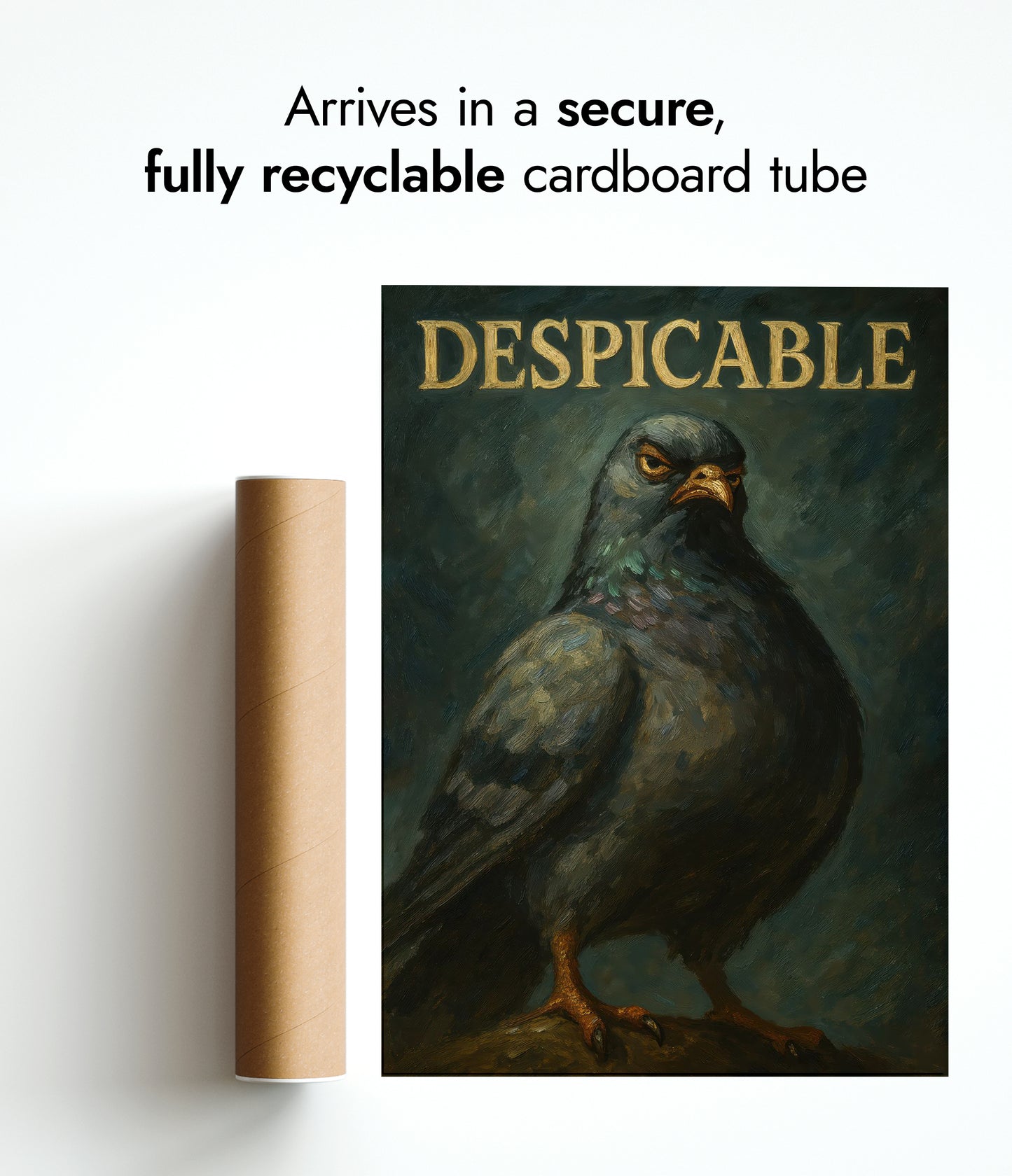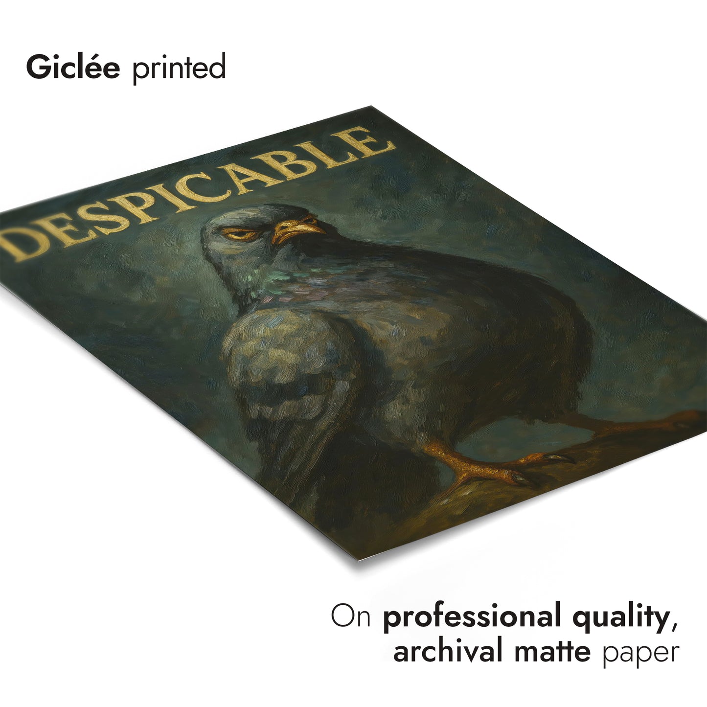 This humorous poster entitled "Despicable" features a bold, oil-style illustration of a pigeon with a comically serious expression, set against a textured dark background. The large typographic word "DESPICABLE" crowns the image, adding a whimsical touch. Ideal for those with a quirky sense of humor, this artwork combines elements of animal portraiture with graphic design.